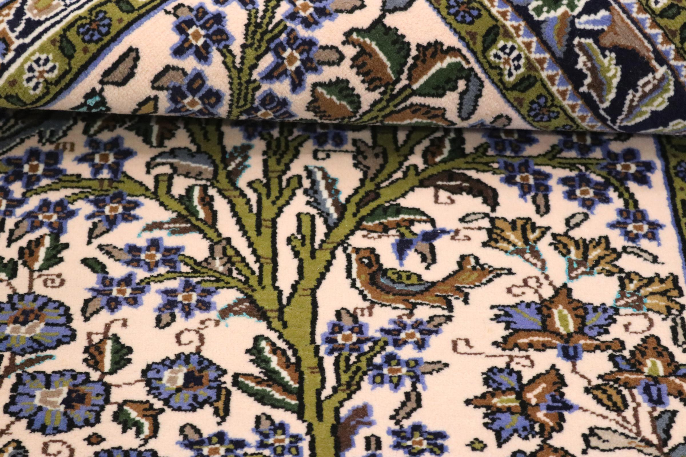 This rug is pure luxury from Qom also known as Qum. Persian rugs from Qom are known to be among the most sophisticated rugs ever made. Qom is an ancient holy city of Persia and popular for its breathtakingly beautiful mosques. Especially silk and cork wool is known to be of the highest quality when originating from Qom. Cork wool originates solely from the neck of sheep. Therefore, it is extremely soft. This particular rug has been knotted over a period of several months.