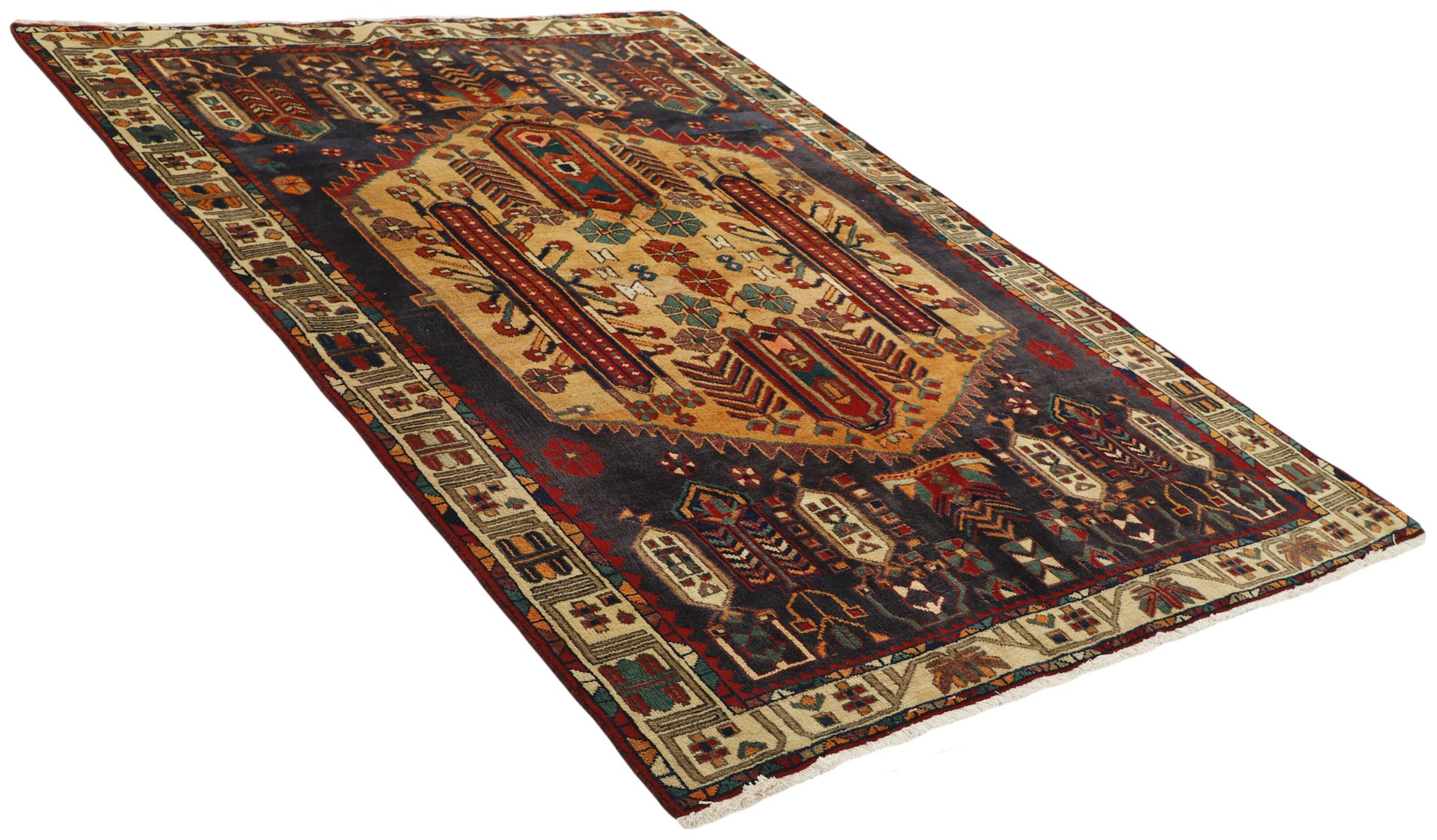 This carpet belongs to the village and nomadic carpets from Iran, the former Persia. This kind of carpets is hand knotted in smaller towns and villages in ancient tradition. Even nomads still knot Persian carpets in the open air. The carpets are knotted without a draft and entirely from memory. They are characterized by classical ornaments arranged in linear and geometric patterns. Thanks to their cultural and traditional origins, these rugs possess a unique character that embodies ancient Persia.