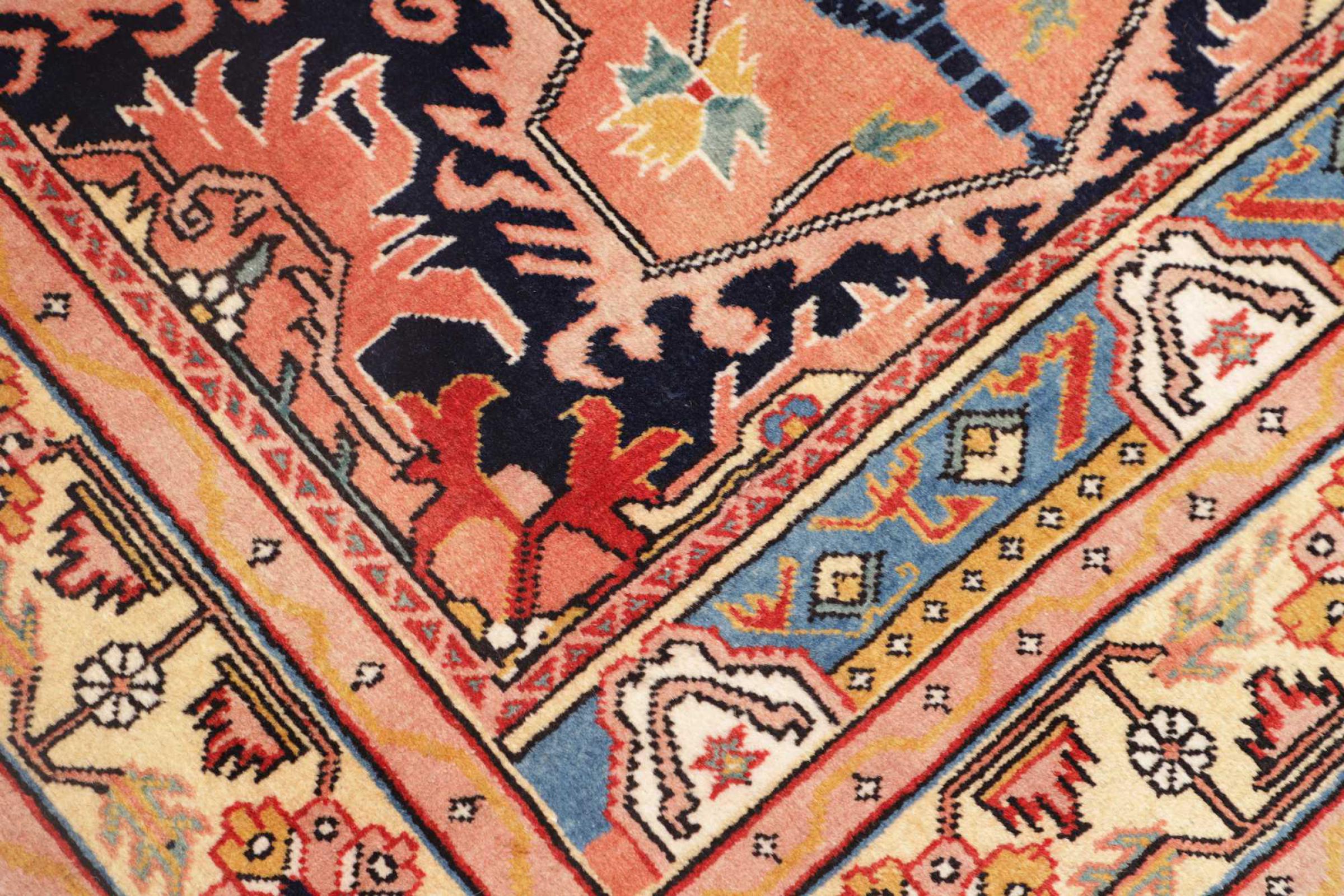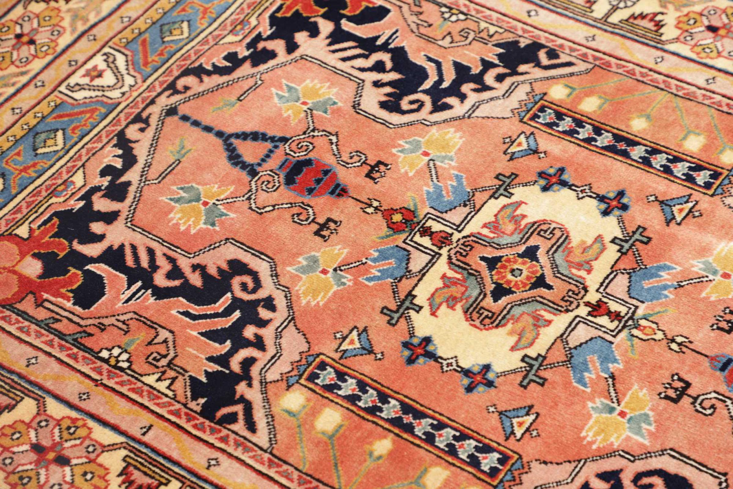 This rug from Heriz (Heris) has been made in old traditional Persian handicraft. Heriz is located in northwestern Iran. This rug has been knotted by hand from fine sheep wool. It has a beautiful medallion in its center, which is typical for this type of rug.