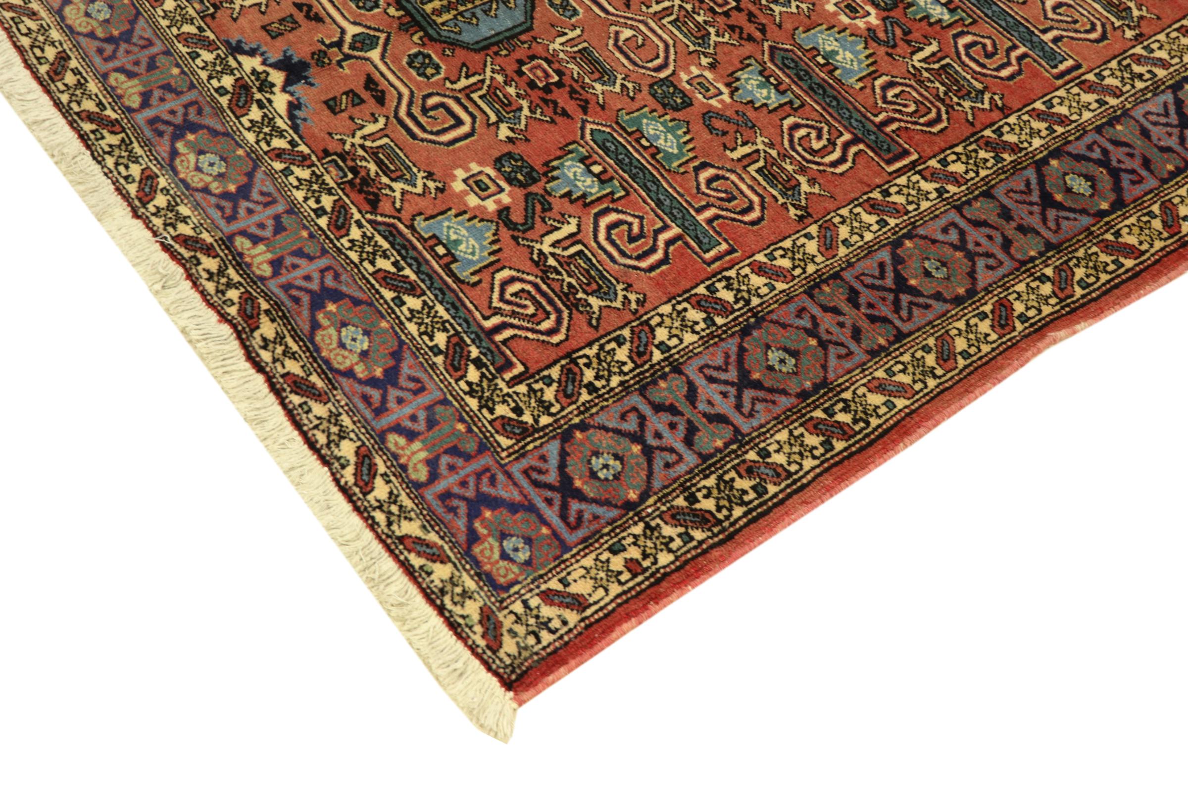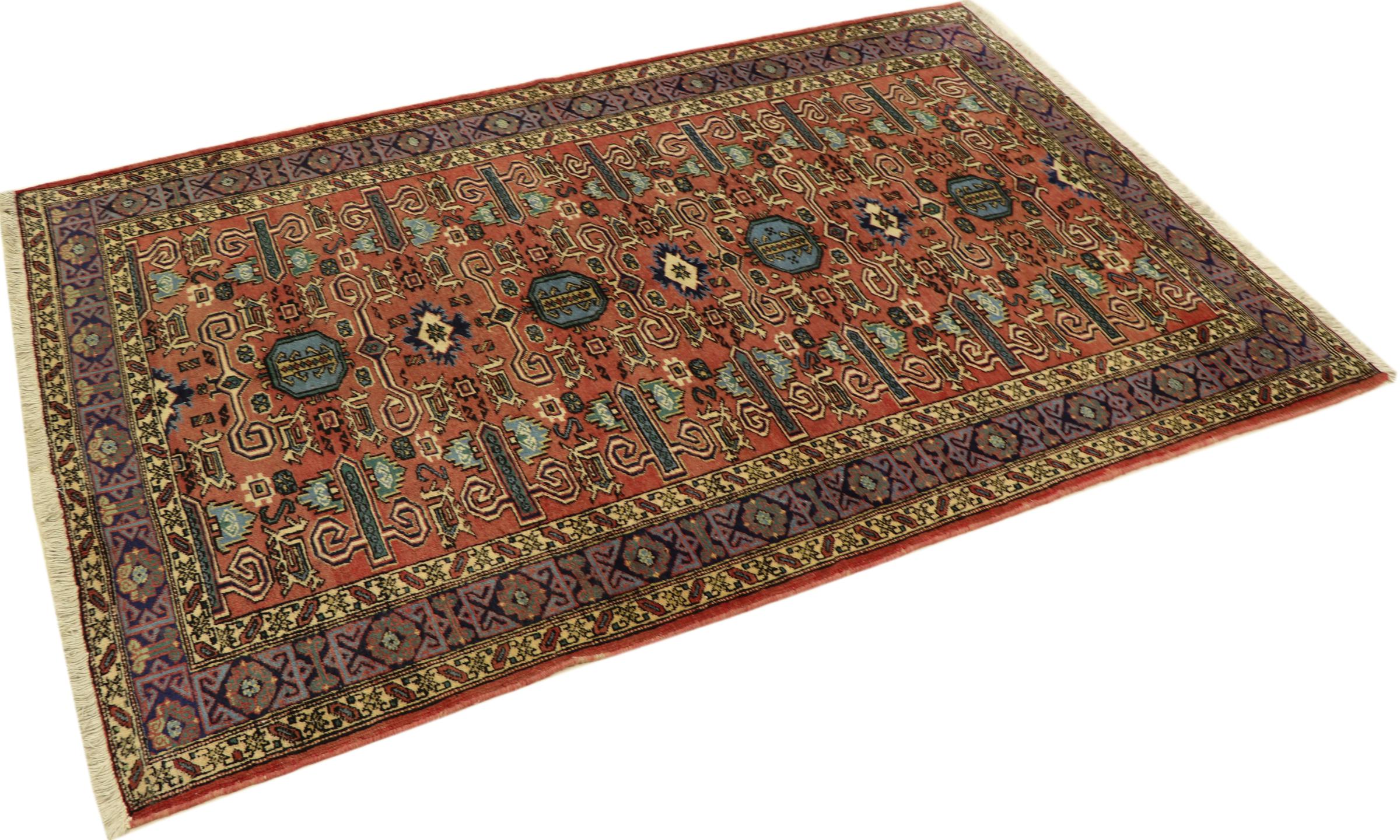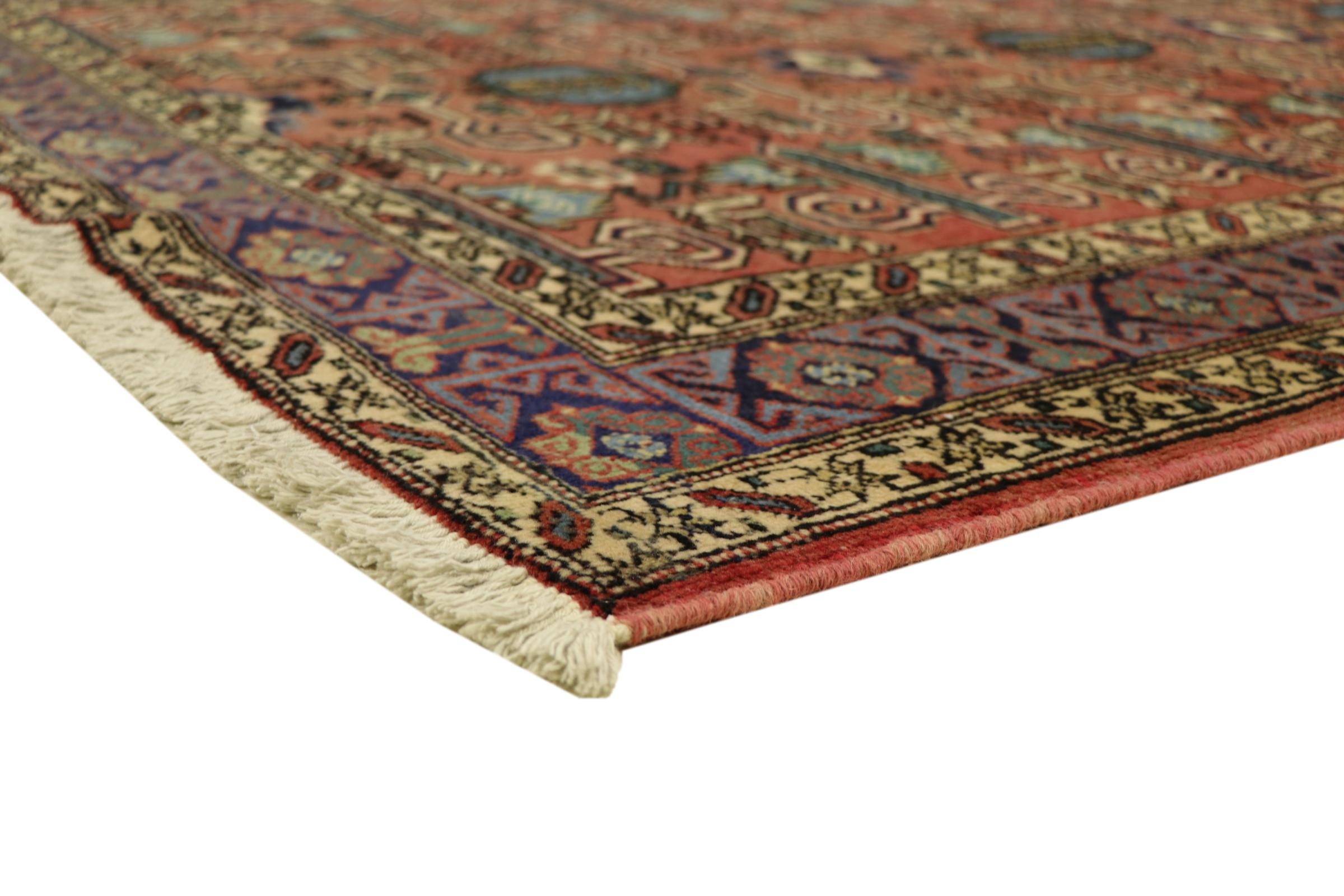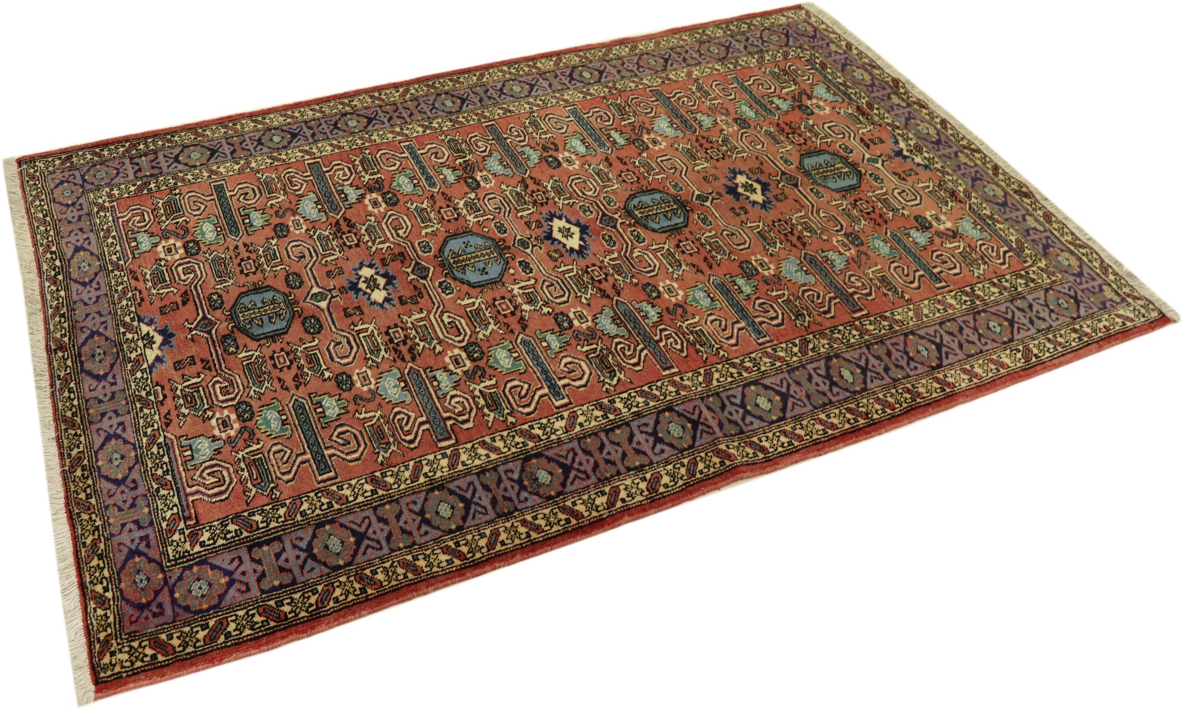 This carpet belongs to the village and nomadic carpets from Iran, the former Persia. This kind of carpets is hand knotted in smaller towns and villages in ancient tradition. Even nomads still knot Persian carpets in the open air. The carpets are knotted without a draft and entirely from memory. They are characterized by classical ornaments arranged in linear and geometric patterns. Thanks to their cultural and traditional origins, these rugs possess a unique character that embodies ancient Persia.