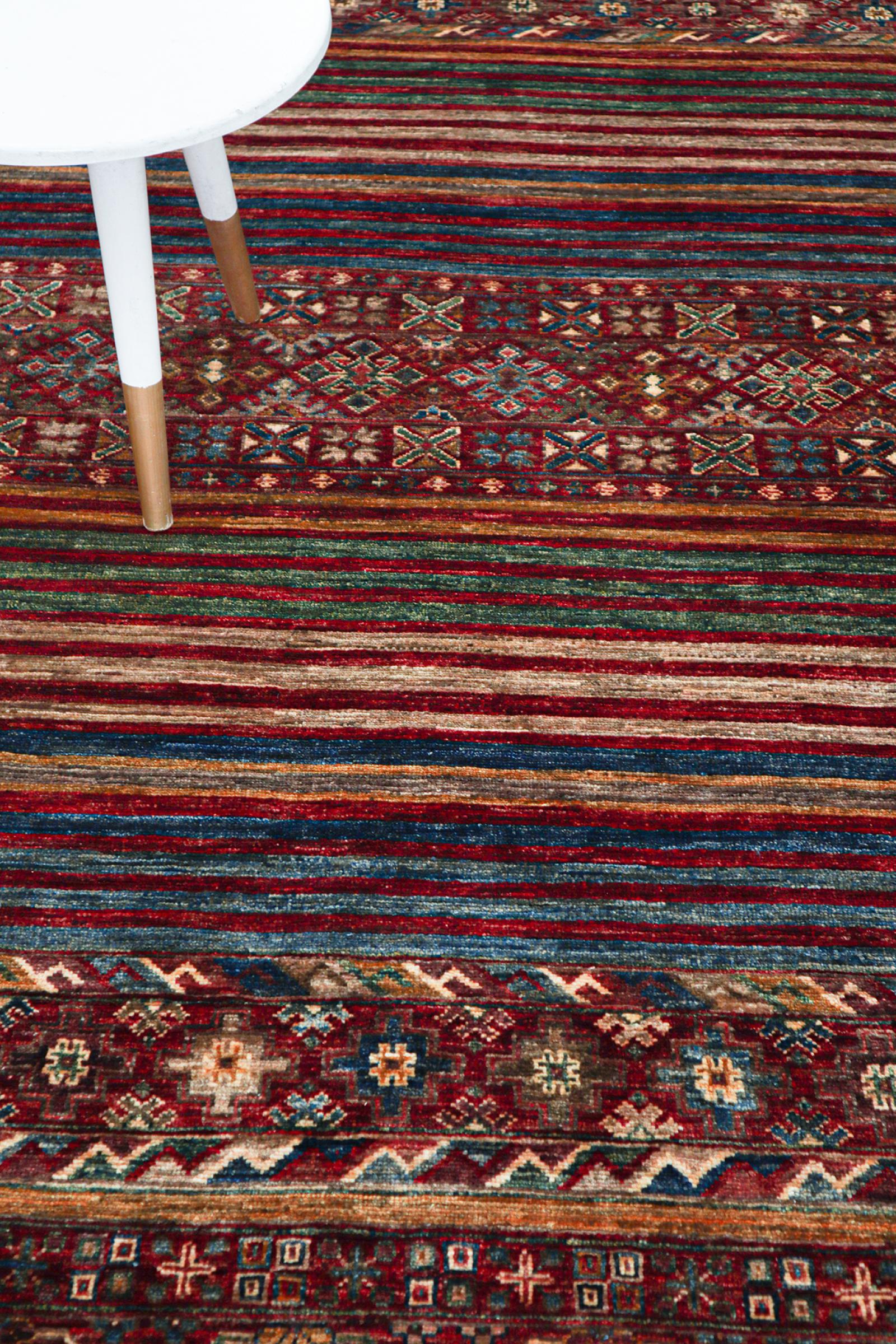 A large part of Pakistani rug production takes place in and around the cities of Lahore and Karachi. Many of the rug knotters of that time fled to Pakistan during the war with India and settled there. Today, especially hand-knotted Pakistan Bukhara rugs are well-known. Similar to the Afghan oriental rugs, Pakistani rugs are also made in dark colours and mostly have shades of red. Even the well-known elephant foot pattern (repeating octagonal pattern) can be found on a Pakistani.