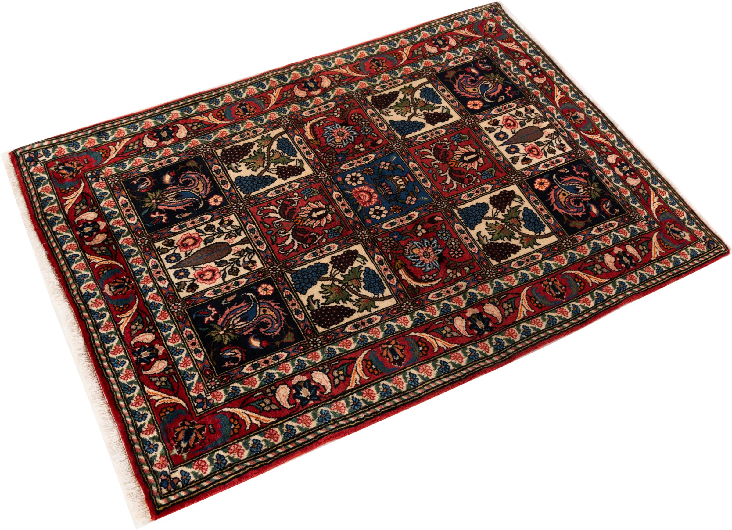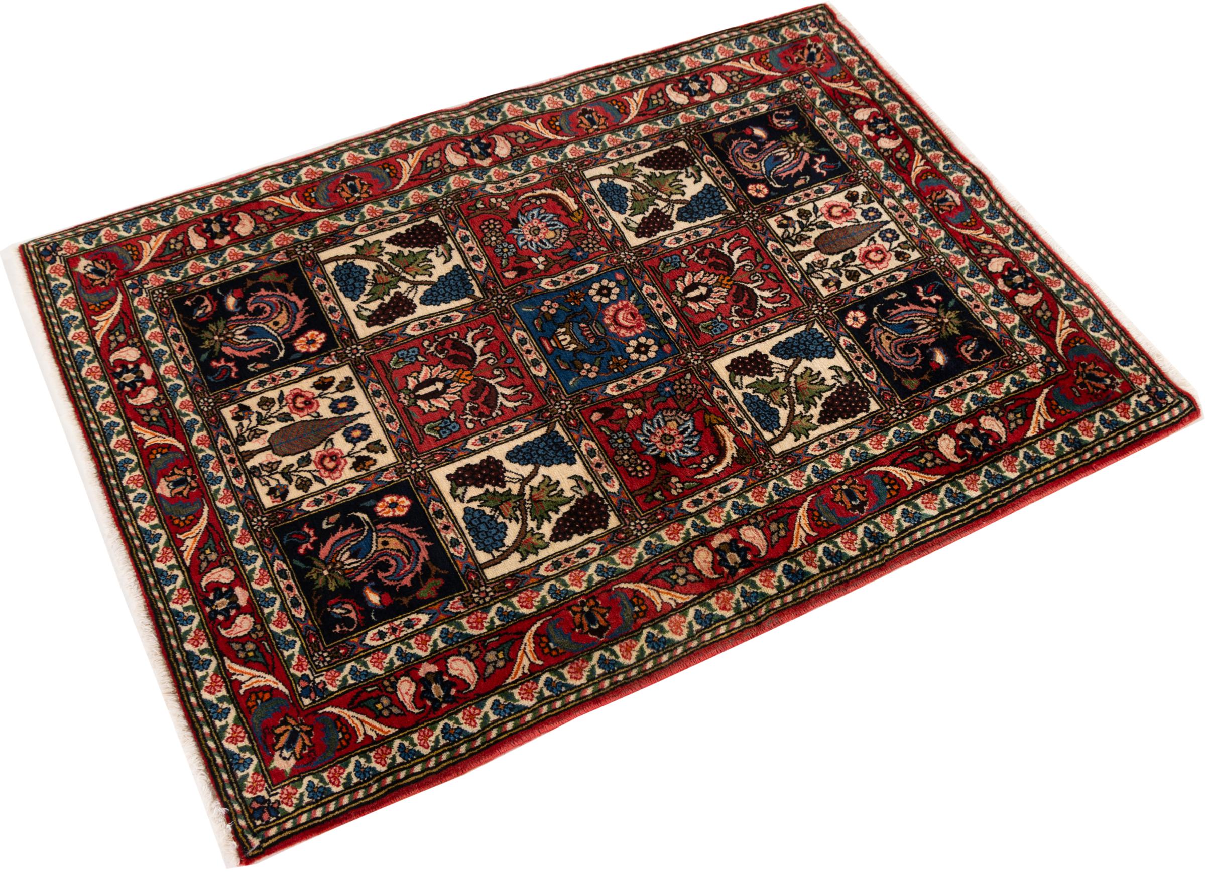 Rug ID: 30702600105556 Size: 4'11"x3'6" ft Thickness: ap. 0.47 in Knot density: 129 - 161 / square inch Manufacturing: Knotted by hand Pile: Handspun wool Warp: Cotton Origin: Persia / Iran Age: New Weight: ap. 13 lb Also know as Baktjar In stock: Unique - Only 1 in stock