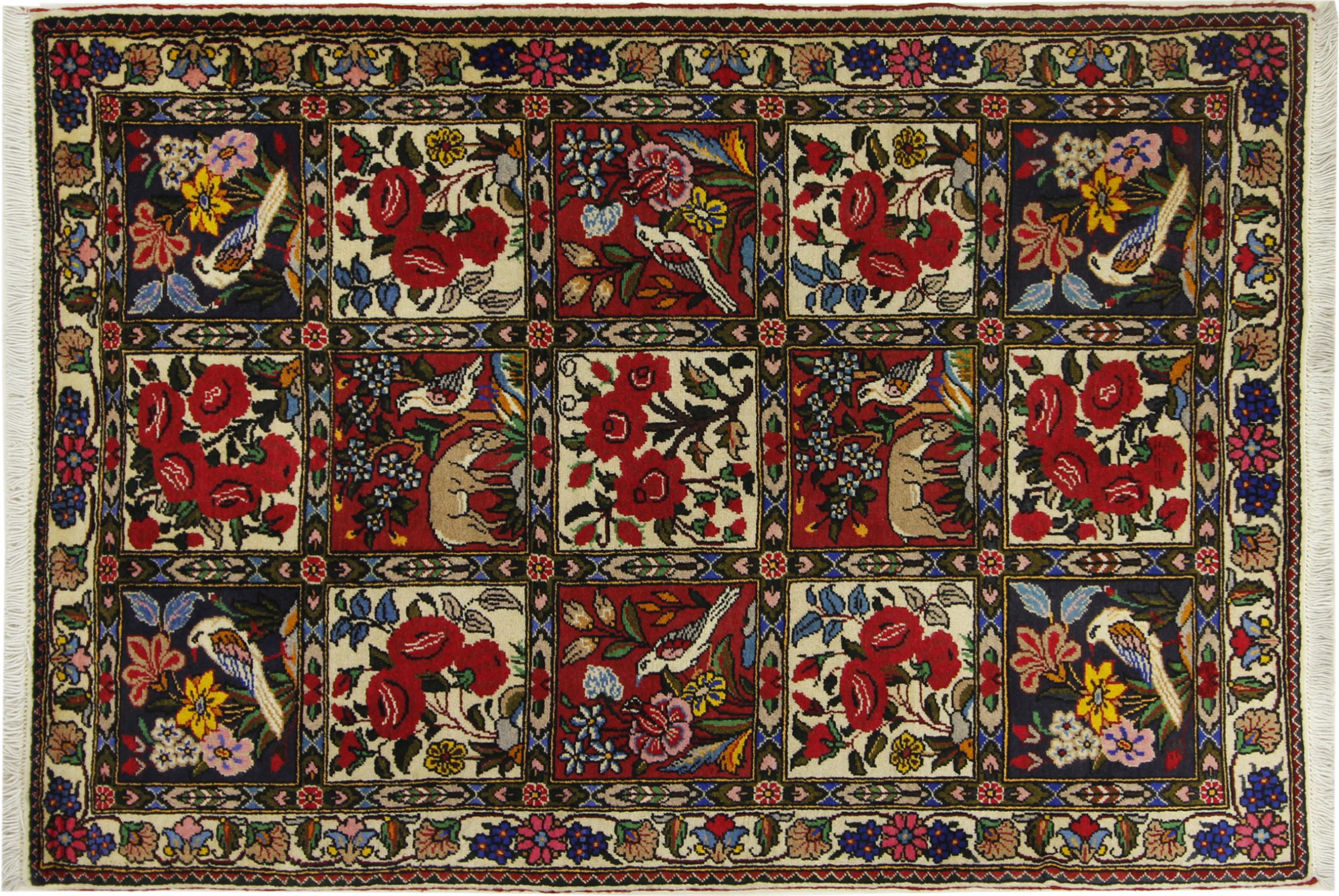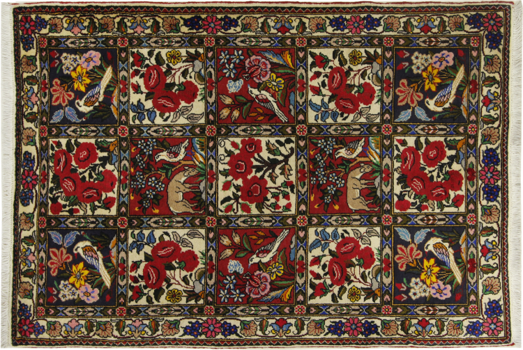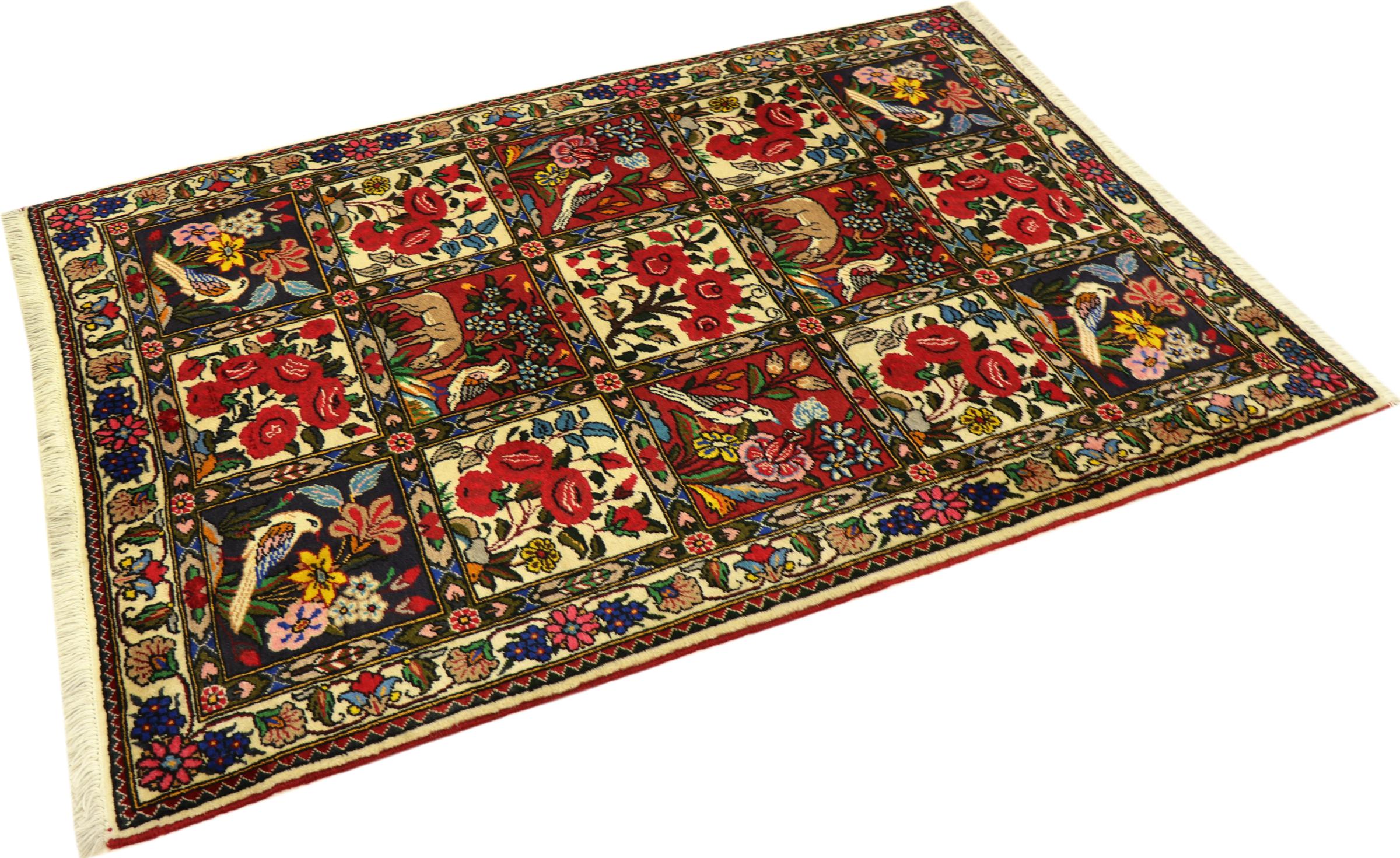 Rug ID: 314302007913094 Size: 5'2"x3'5" ft Thickness: ap. 0.47 in Knot density: 82 - 103 / square inch Manufacturing: Knotted by hand Pile: Handspun wool Warp: Cotton Origin: Persia / Iran Age: New Weight: ap. 15 lb Also know as Baktjar In stock: Unique - Only 1 in stock