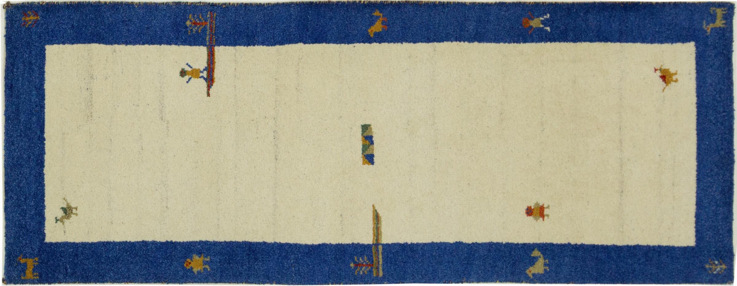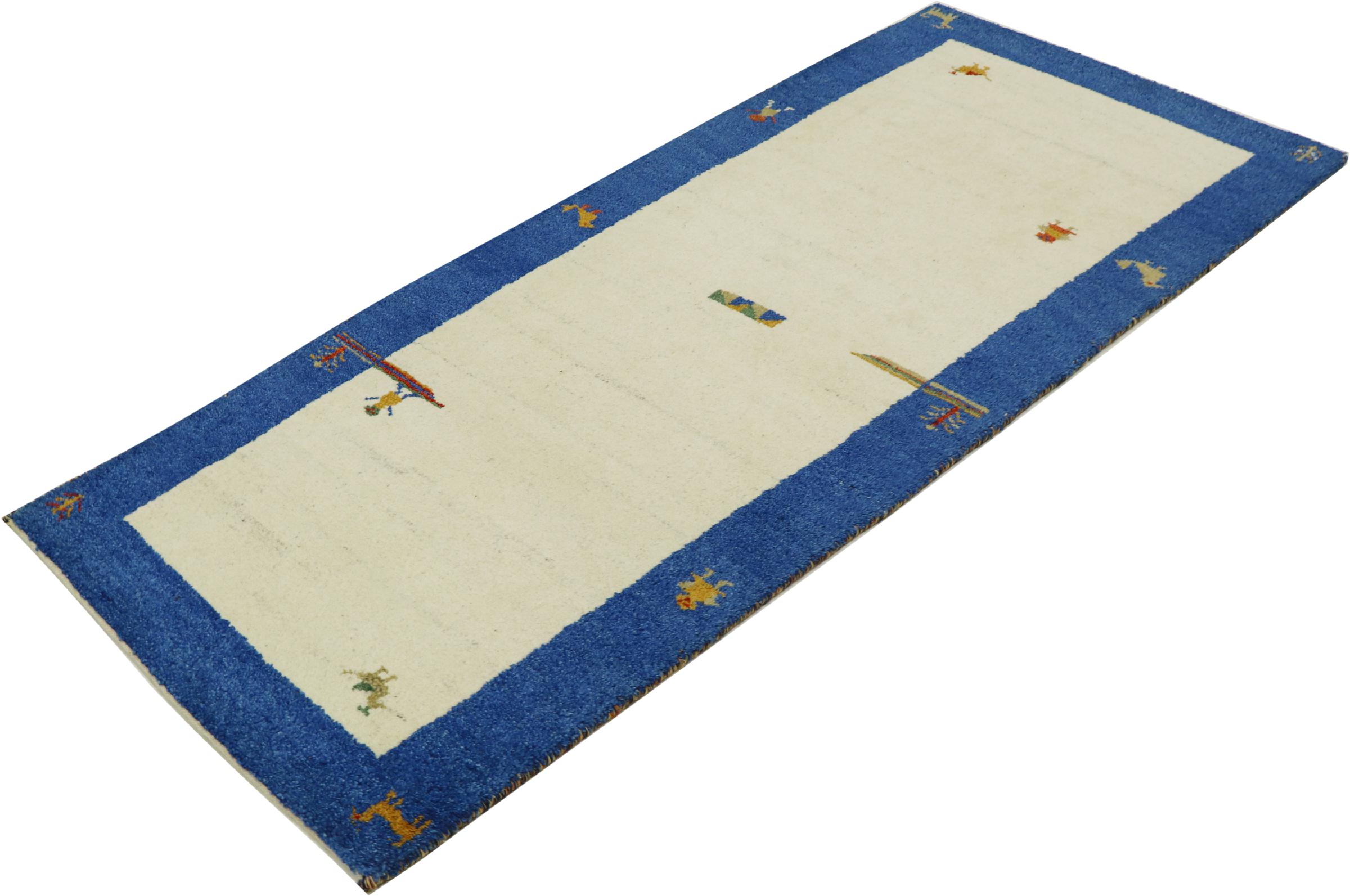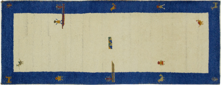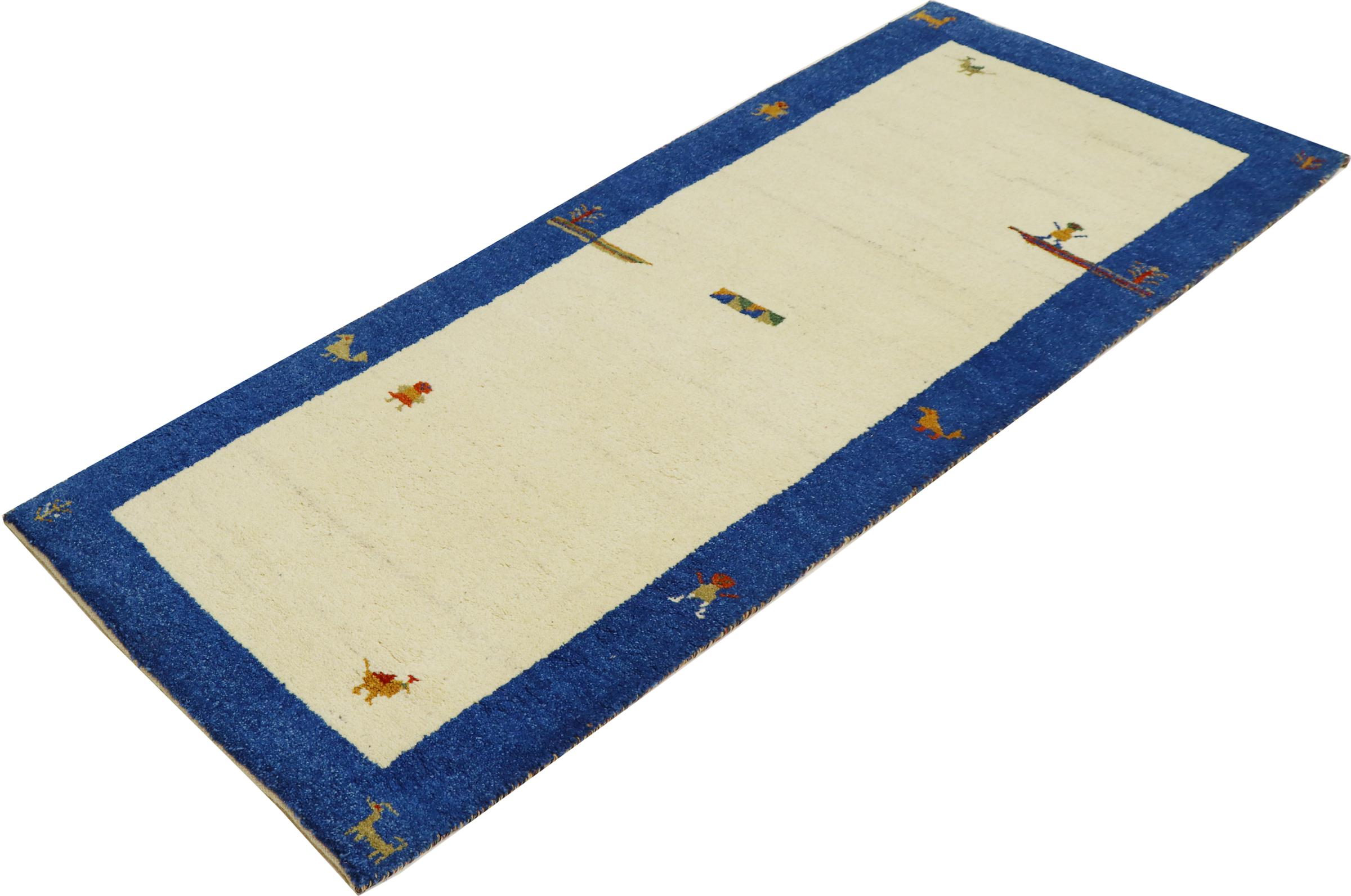 This Gabbeh rug was made by hand in India. Indian Gabbeh carpets are made of soft sheep wool, are comfortable on the feet and have heat insulating properties. Their designs are mostly simple and modern. They were inspired by nomadic tribes who incorporated very simple motifs from their environment (gardens, animals, plants) into their rugs. Indian Gabbeh rugs don't quite come close to the quality of a Persian Gabbeh, but they offer great value for money. Therefore, they make excellent hand-knotted carpets for beginners.