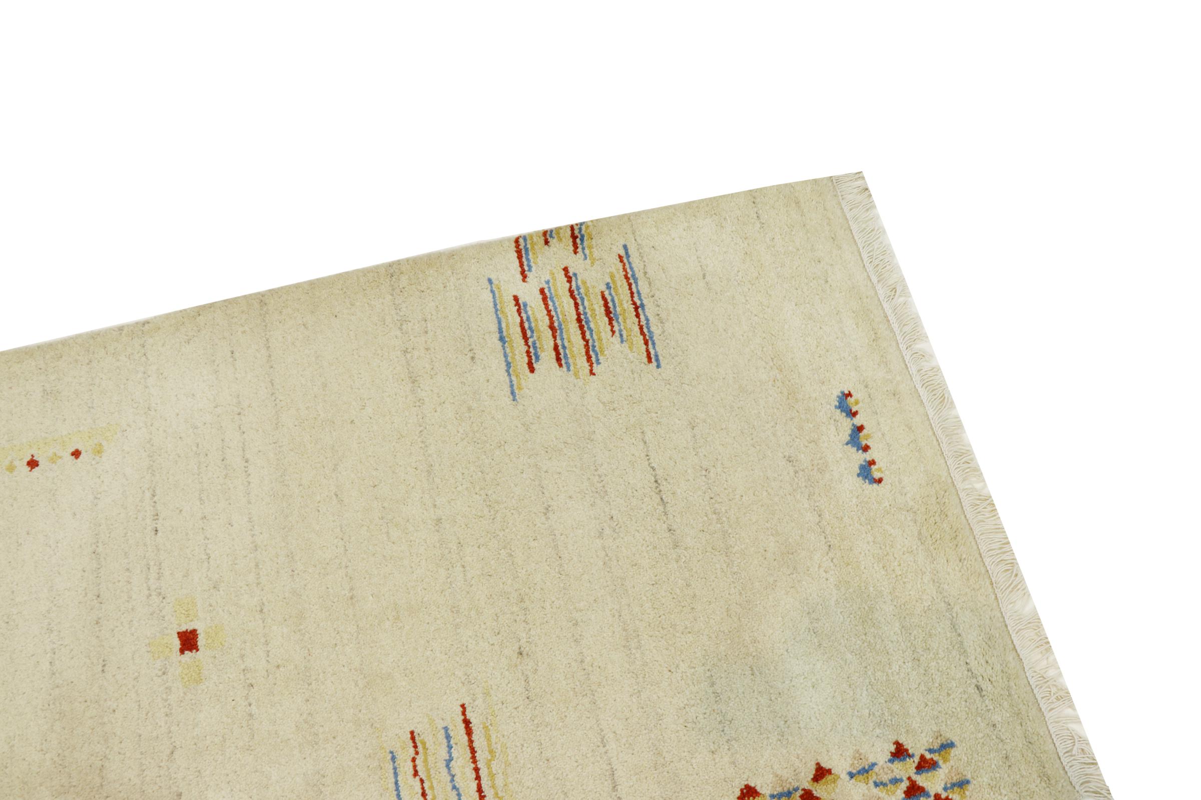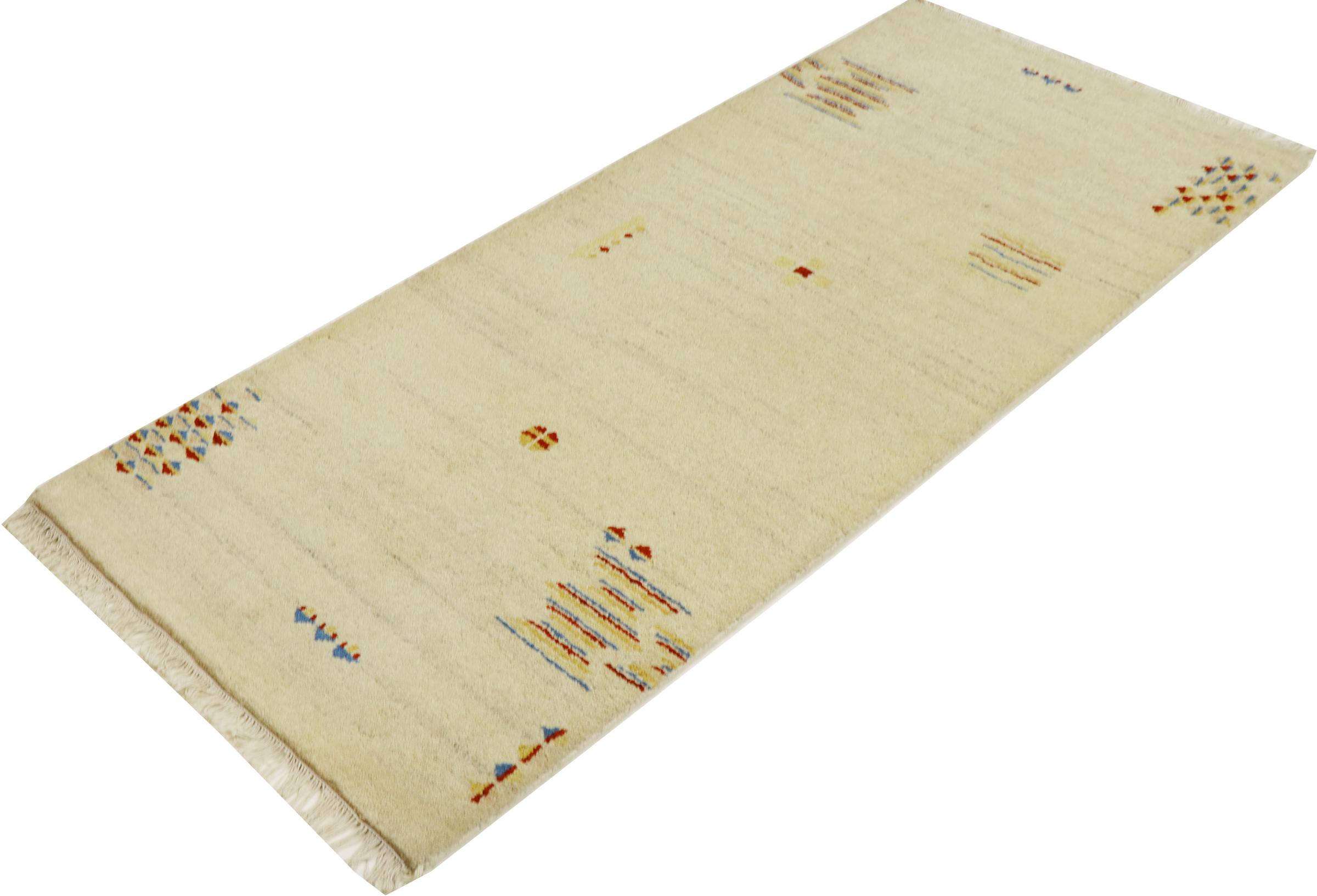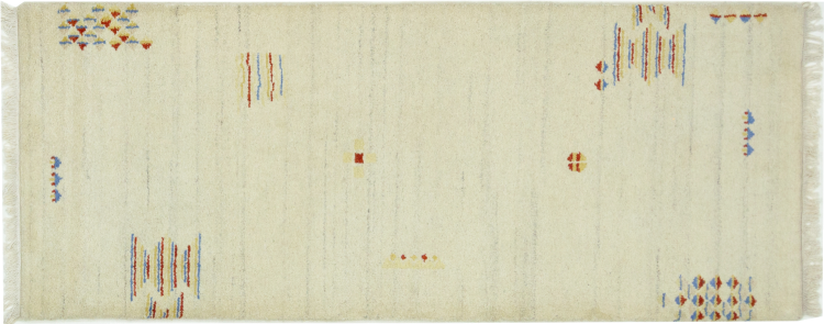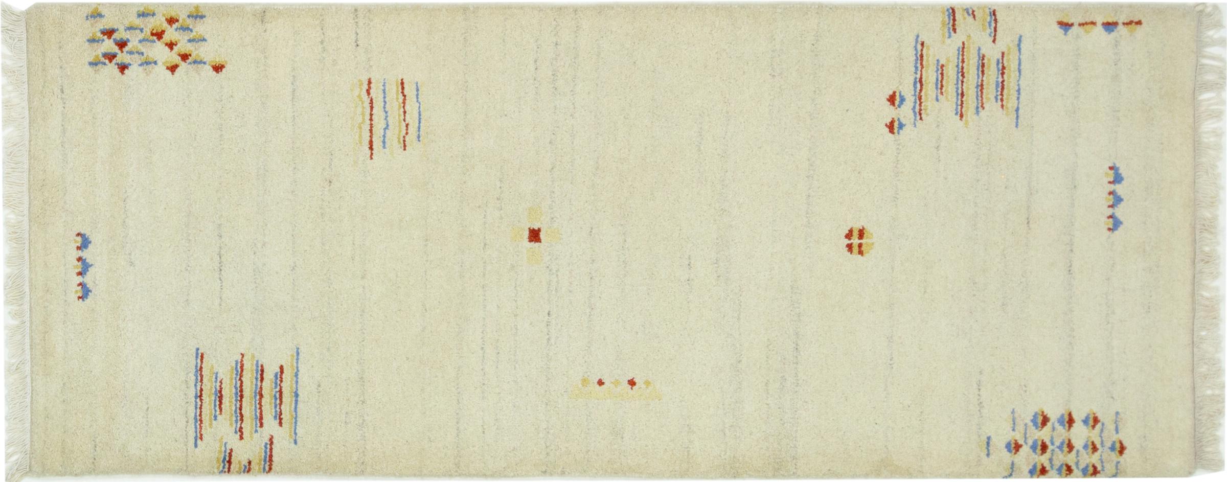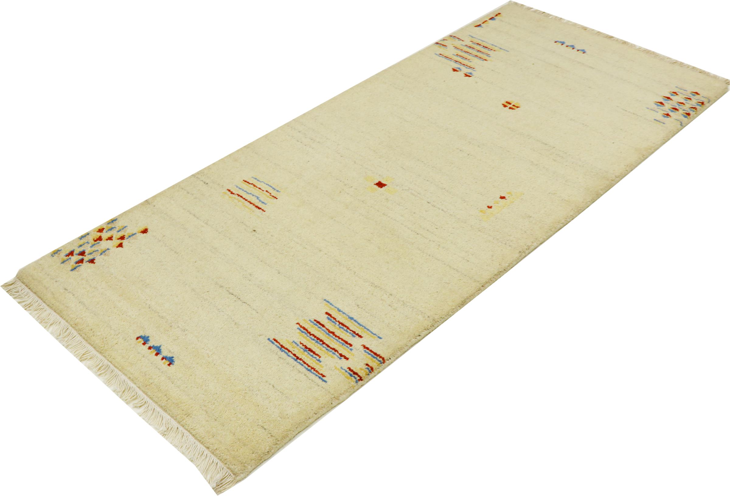 This Gabbeh rug was made by hand in India. Indian Gabbeh carpets are made of soft sheep wool, are comfortable on the feet and have heat insulating properties. Their designs are mostly simple and modern. They were inspired by nomadic tribes who incorporated very simple motifs from their environment (gardens, animals, plants) into their rugs. Indian Gabbeh rugs don't quite come close to the quality of a Persian Gabbeh, but they offer great value for money. Therefore, they make excellent hand-knotted carpets for beginners.