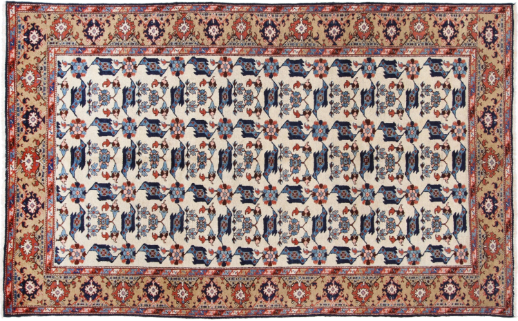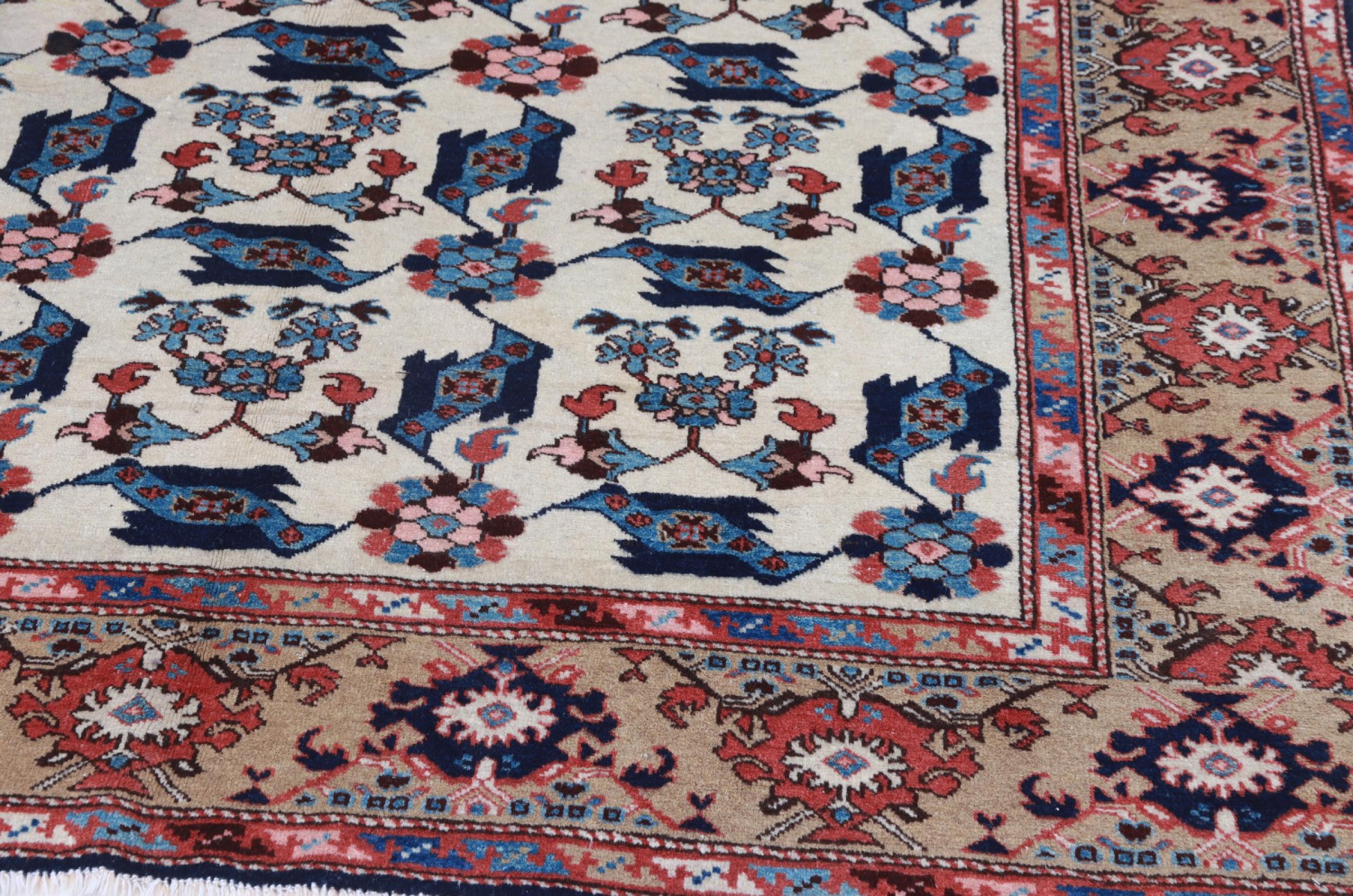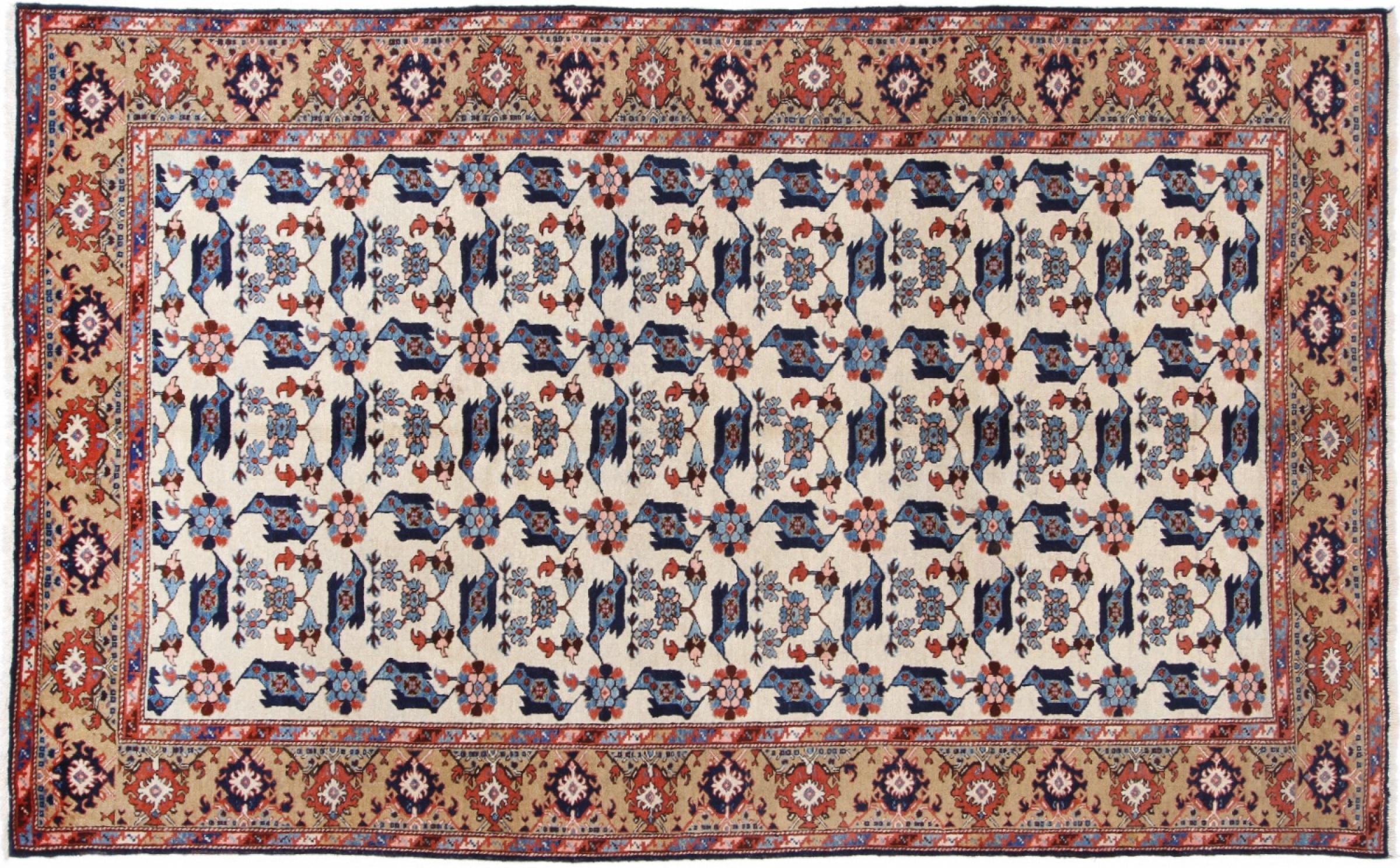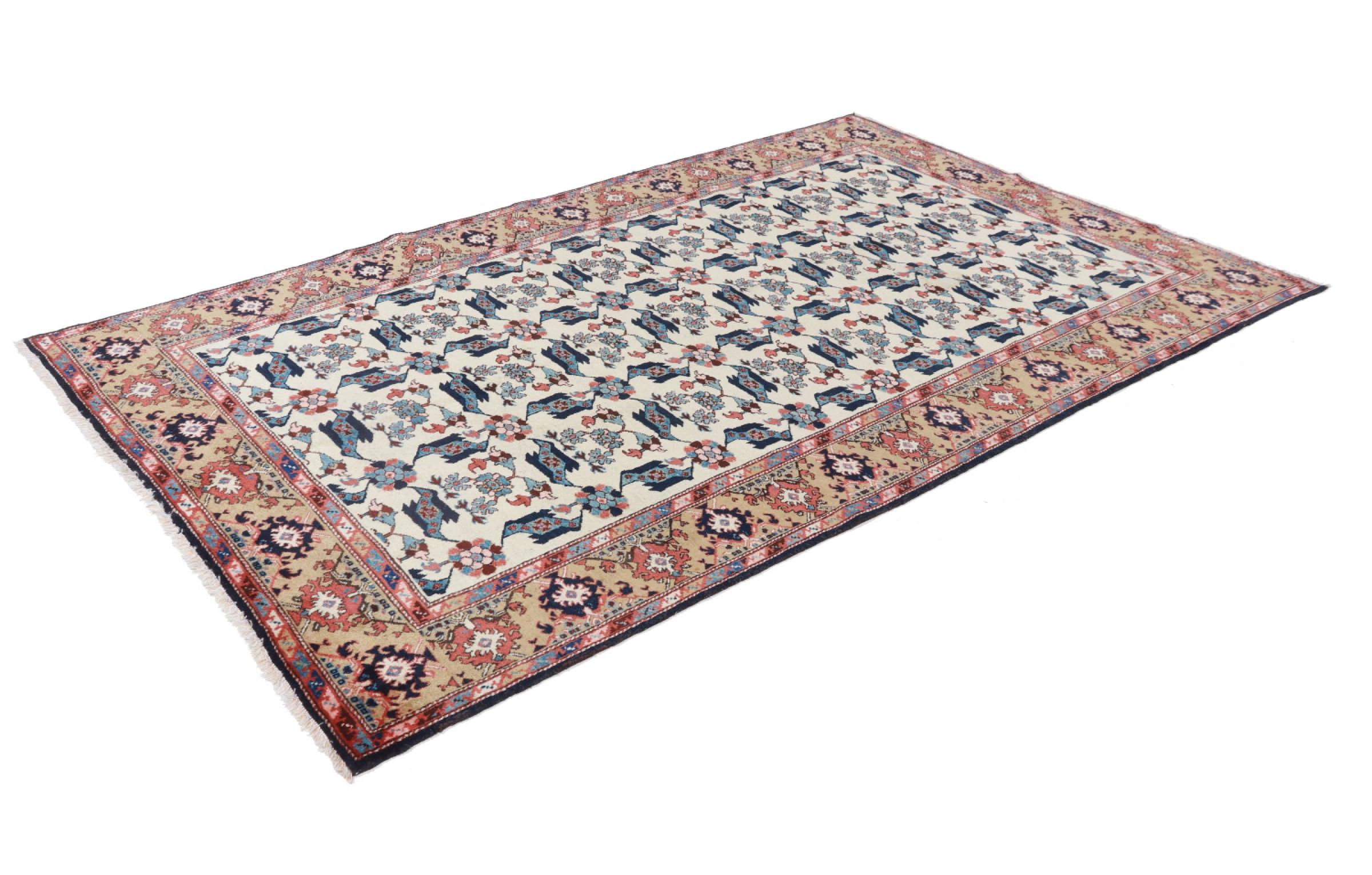 Rug ID: 224341004693001 Size: 9'1"x5'5" ft Thickness: ap. 0.31 in Knot density: 103 - 129 / square inch Manufacturing: Knotted by hand Pile: Handspun wool Warp: Cotton Origin: Persia / Iran Age: Old/Semi antique, over 50 years Weight: ap. 40 lb In stock: Unique - Only 1 in stock