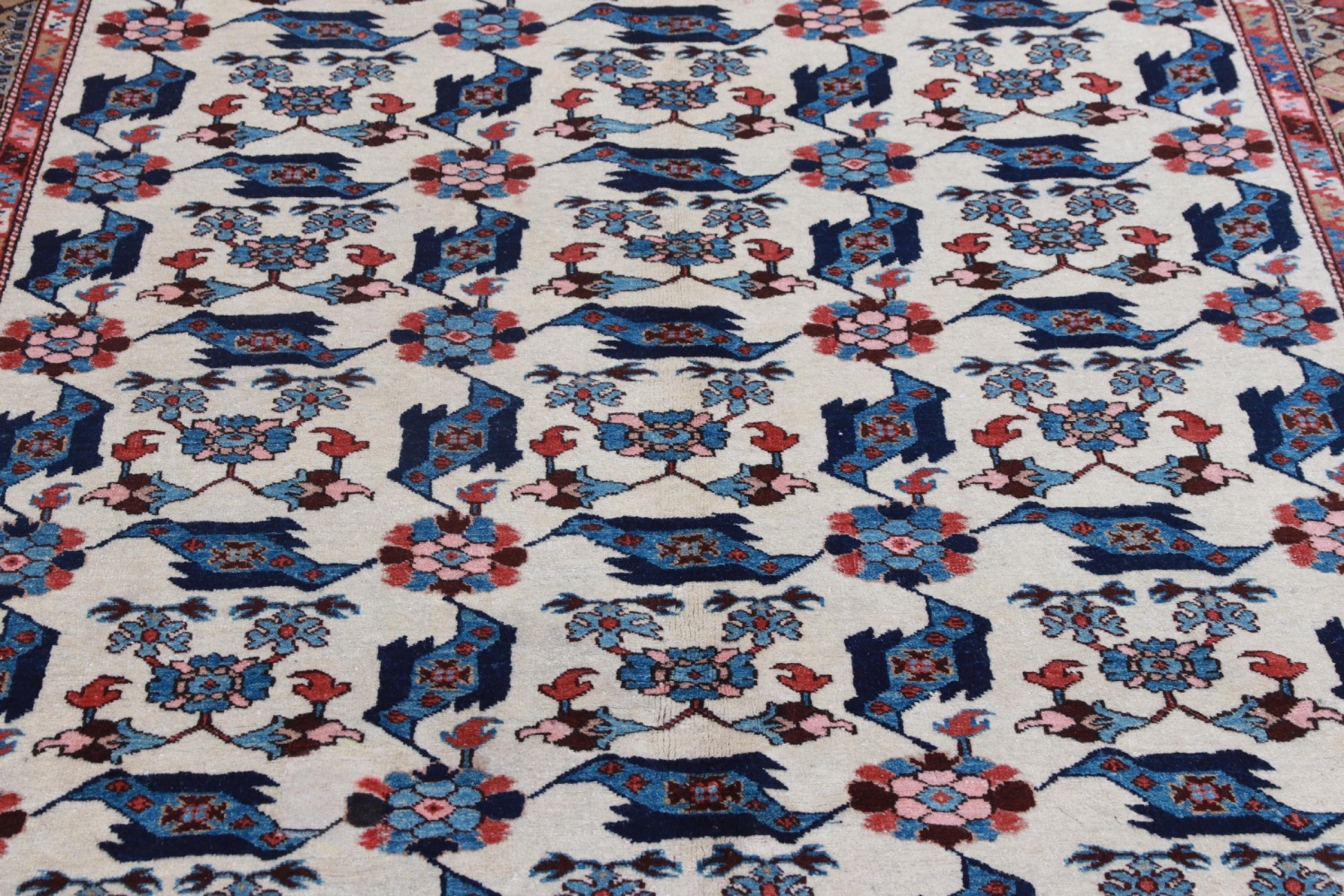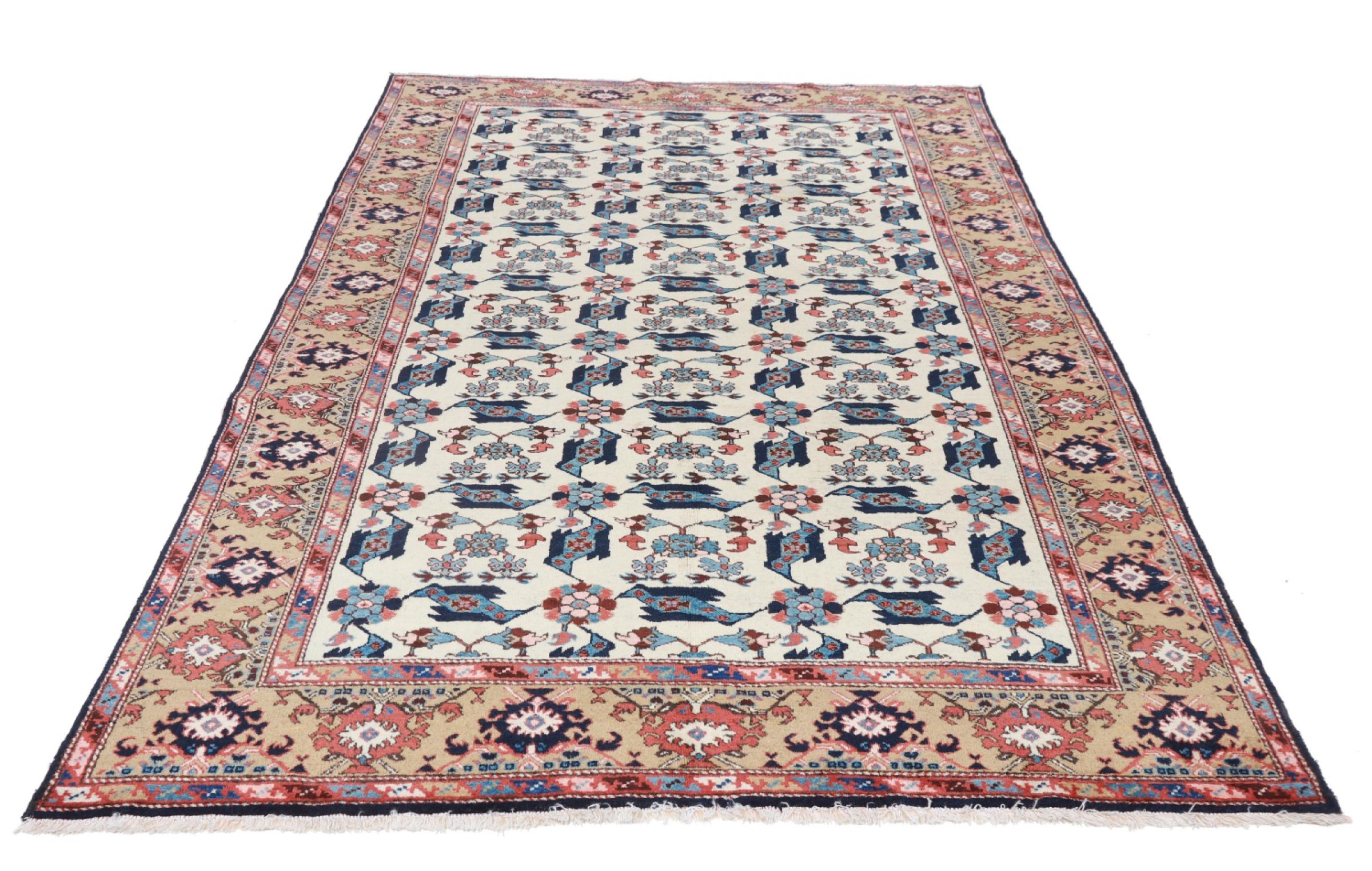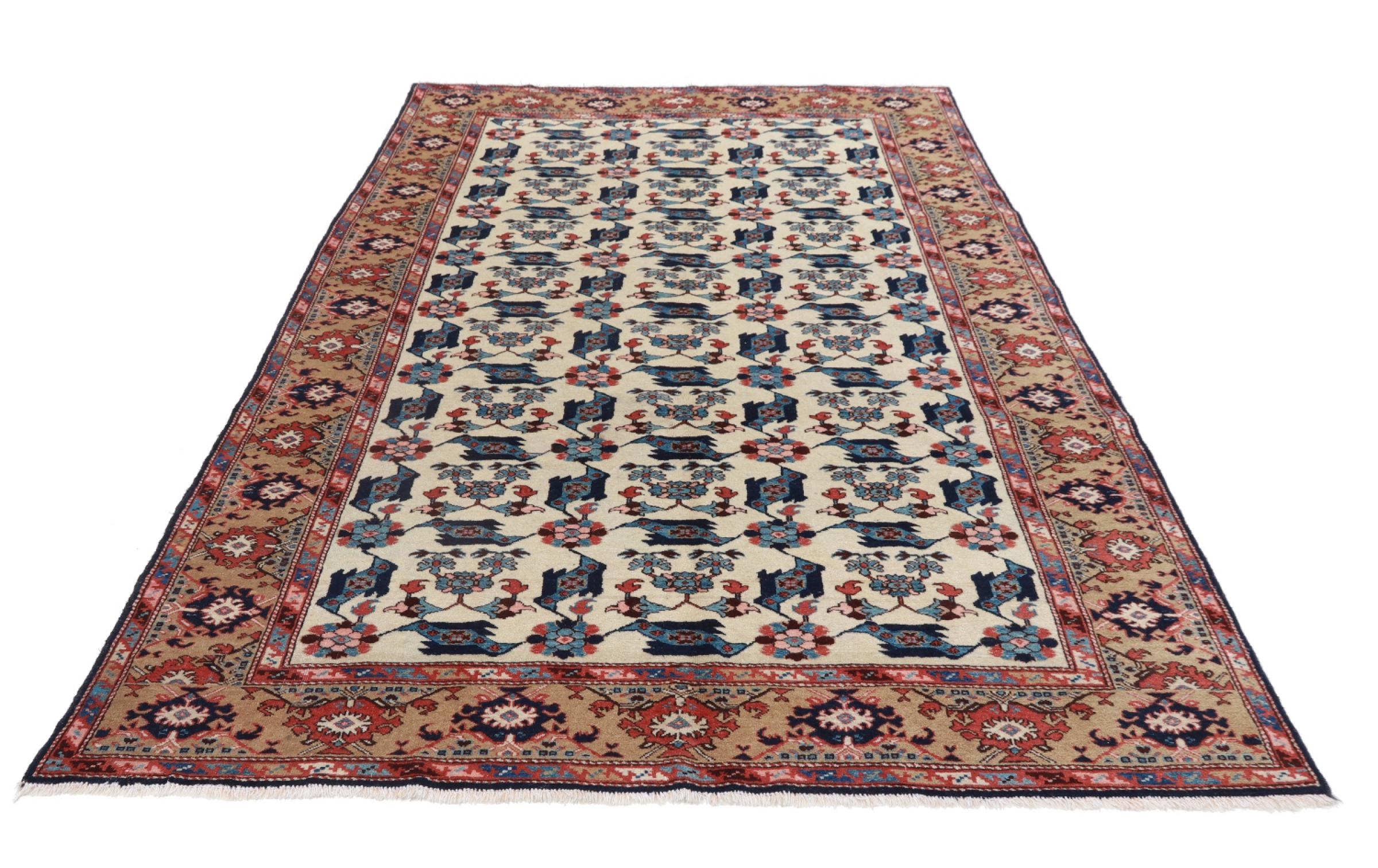 This carpet belongs to the village and nomadic carpets from Iran, the former Persia. This kind of carpets is hand knotted in smaller towns and villages in ancient tradition. Even nomads still knot Persian carpets in the open air. The carpets are knotted without a draft and entirely from memory. They are characterized by classical ornaments arranged in linear and geometric patterns. Thanks to their cultural and traditional origins, these rugs possess a unique character that embodies ancient Persia.
