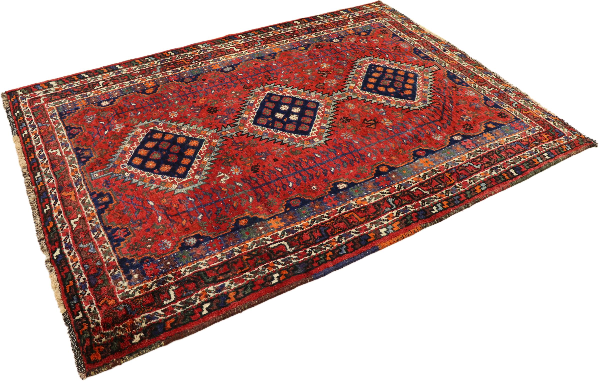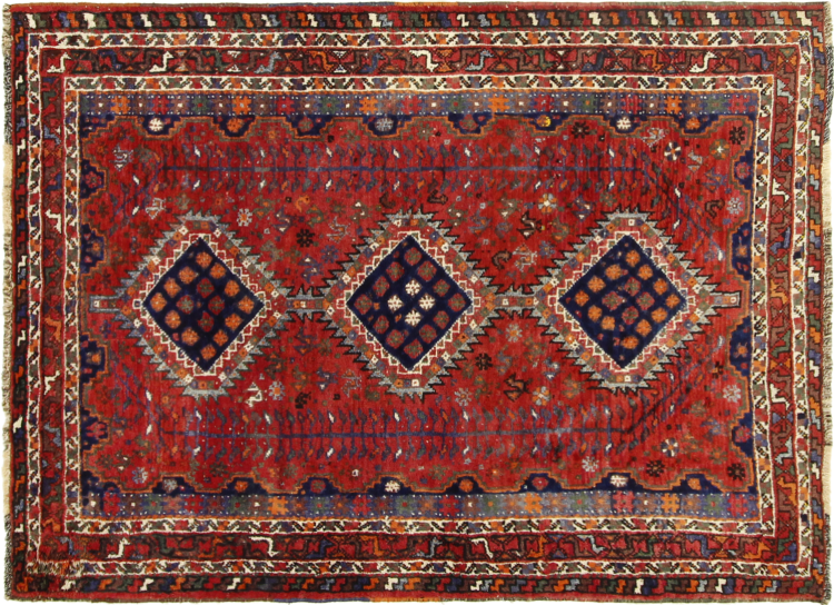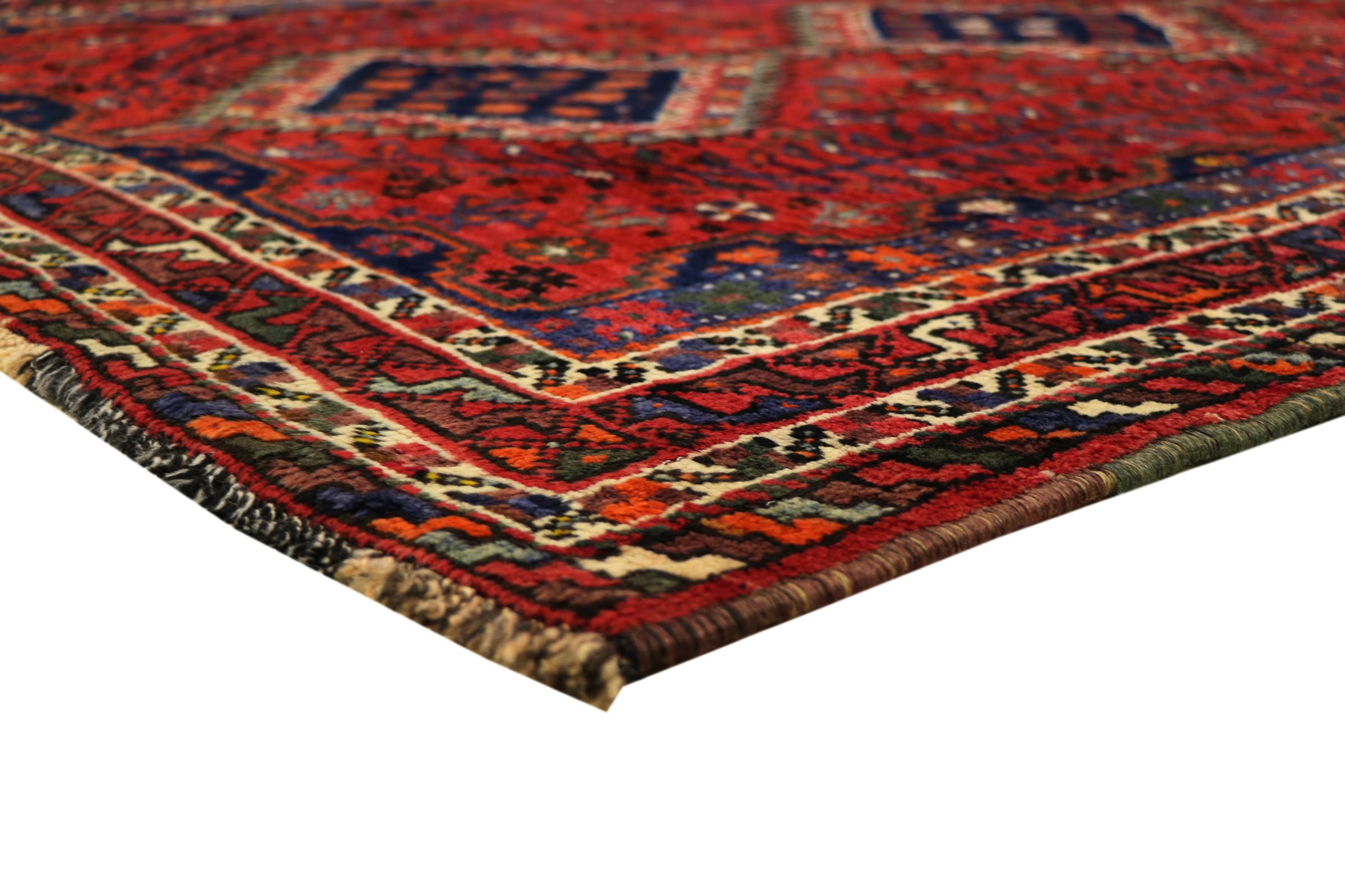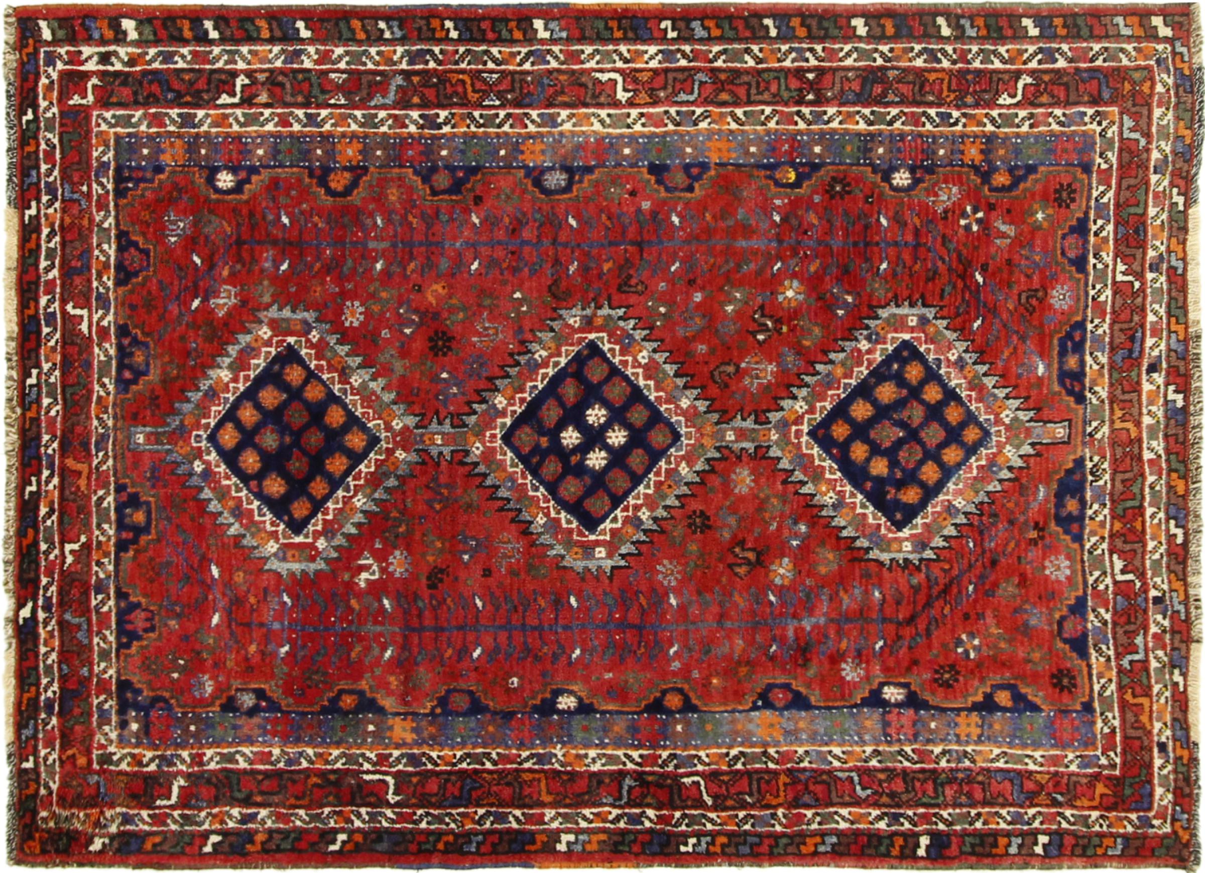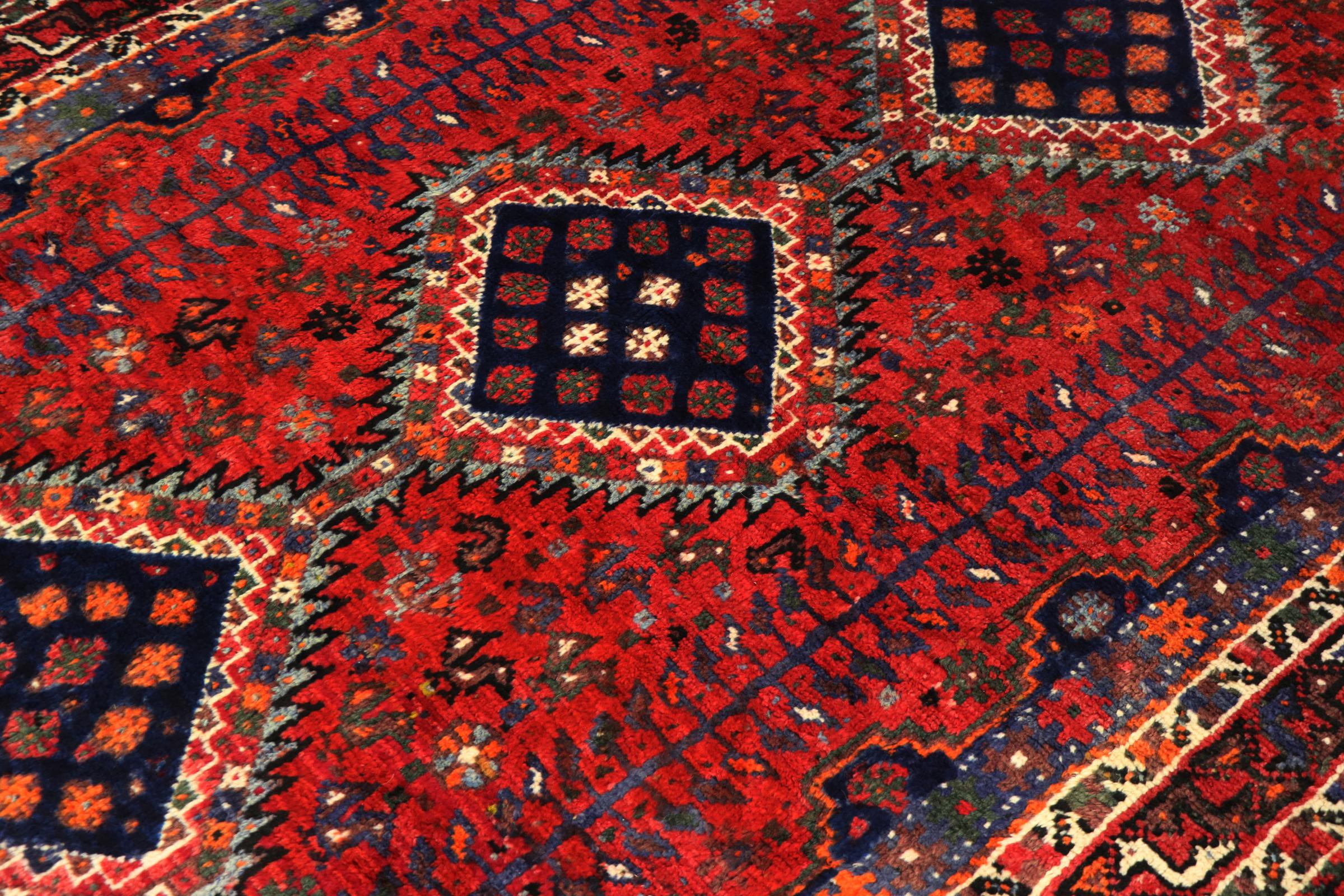 This Persian Ghashghai (Qashqai) rug has been knotted by nomads. Beautiful shades of red, beige and dark blue are characteristic for this type. The rug is handmade and unique. Its colors are natural, dyed in old tradition. The rug's wool comes from sheep of the nomads.