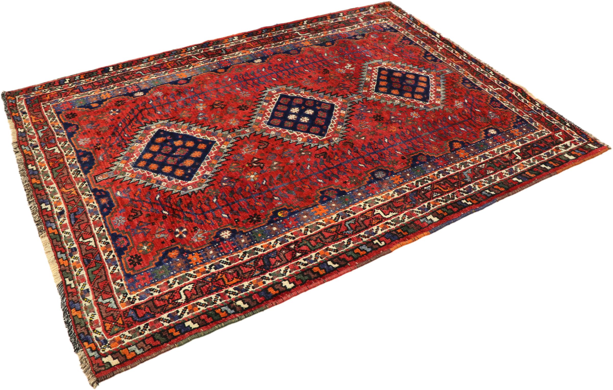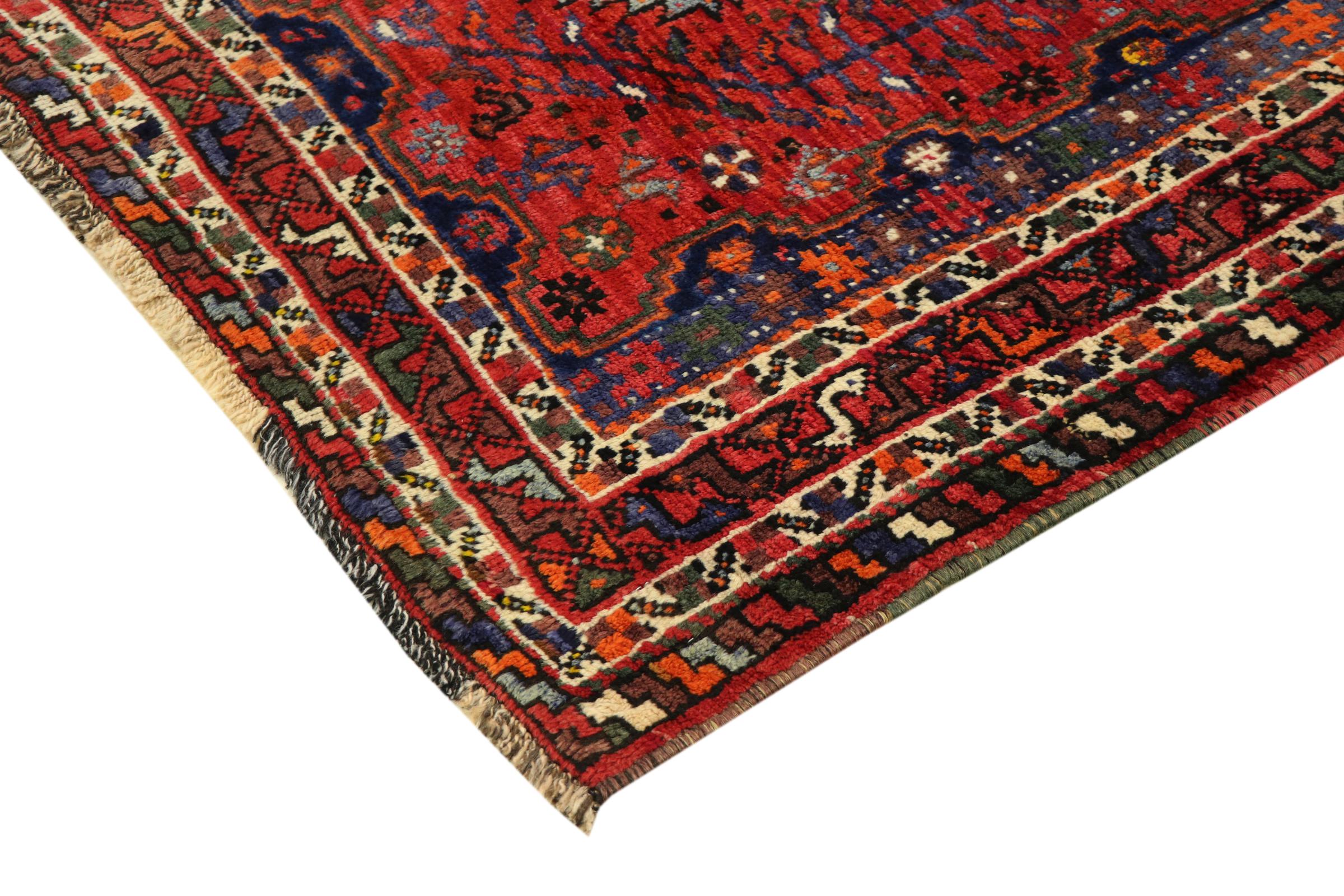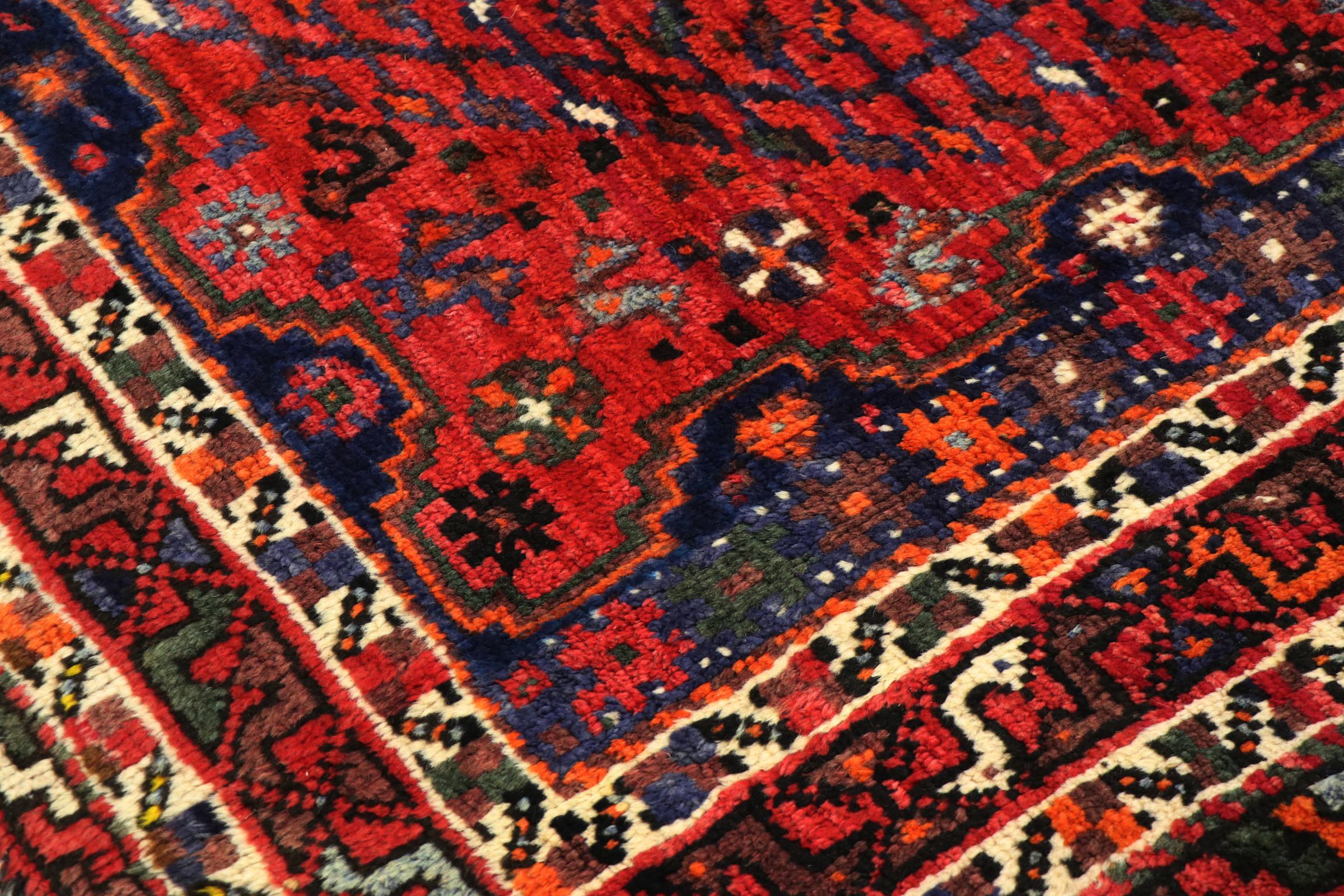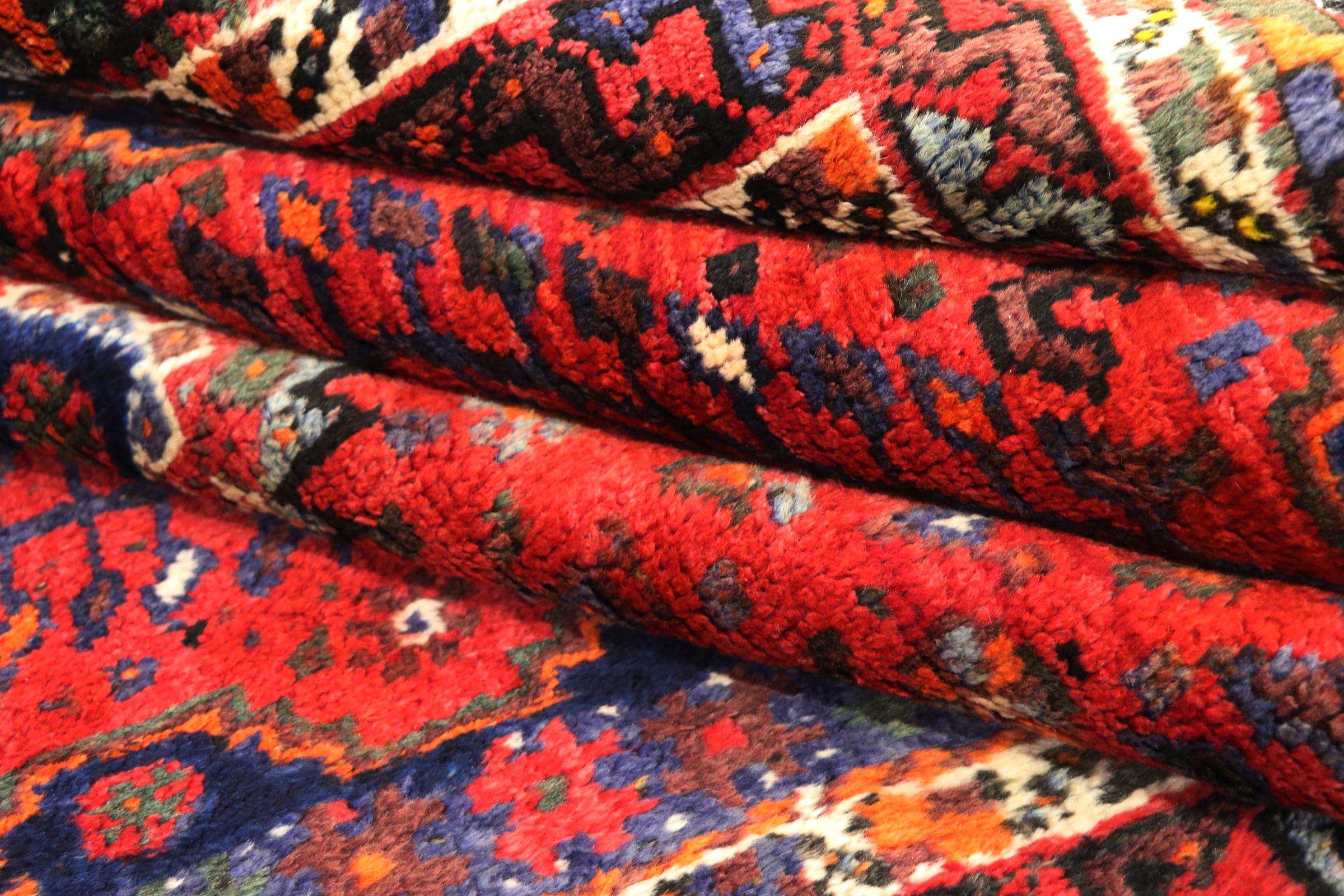 This carpet belongs to the village and nomadic carpets from Iran, the former Persia. This kind of carpets is hand knotted in smaller towns and villages in ancient tradition. Even nomads still knot Persian carpets in the open air. The carpets are knotted without a draft and entirely from memory. They are characterized by classical ornaments arranged in linear and geometric patterns. Thanks to their cultural and traditional origins, these rugs possess a unique character that embodies ancient Persia.