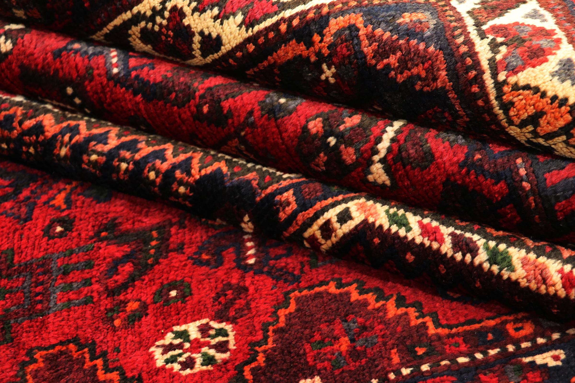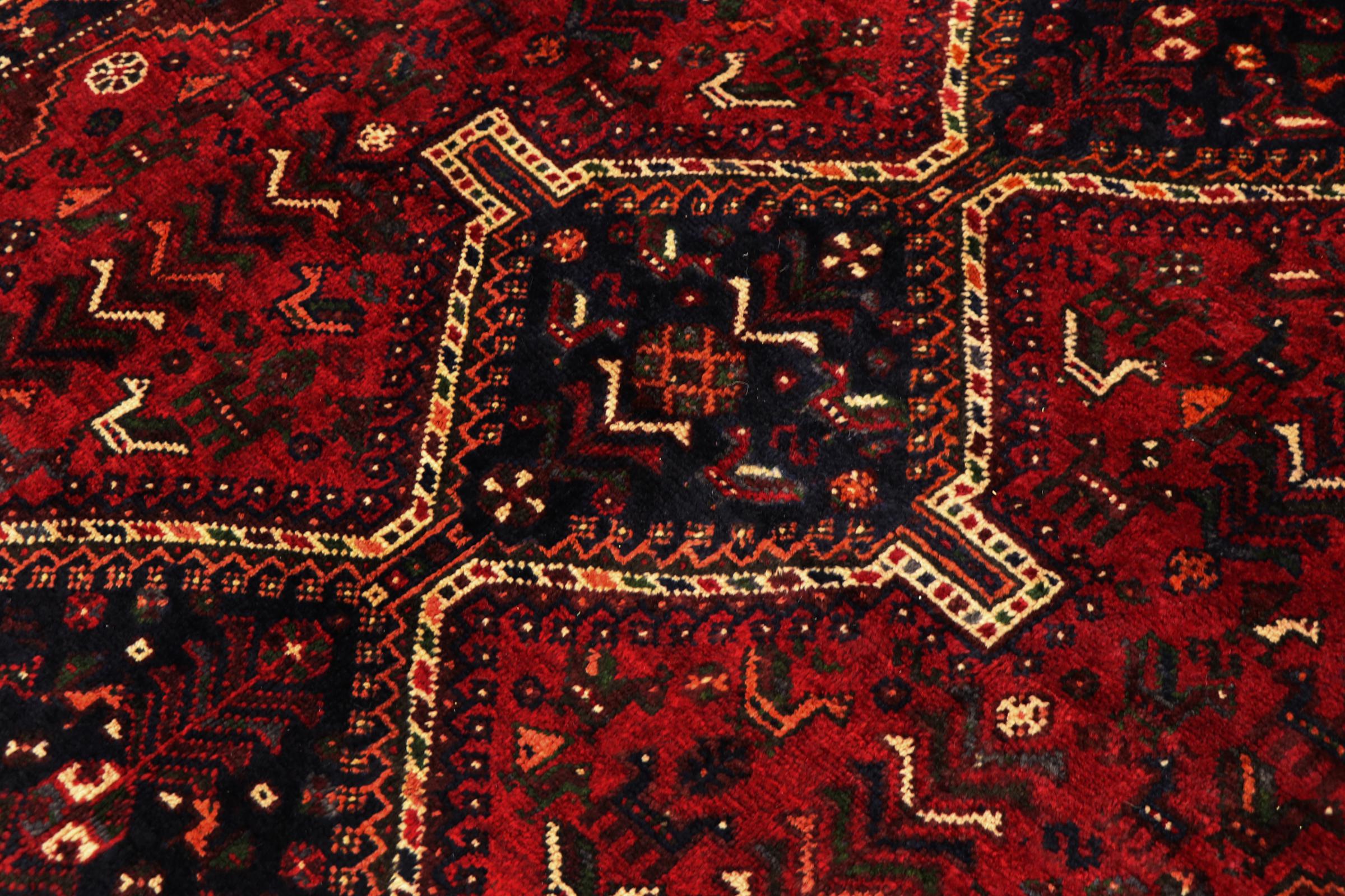 This Persian Ghashghai (Qashqai) rug has been knotted by nomads. Beautiful shades of red, beige and dark blue are characteristic for this type. The rug is handmade and unique. Its colors are natural, dyed in old tradition. The rug's wool comes from sheep of the nomads.