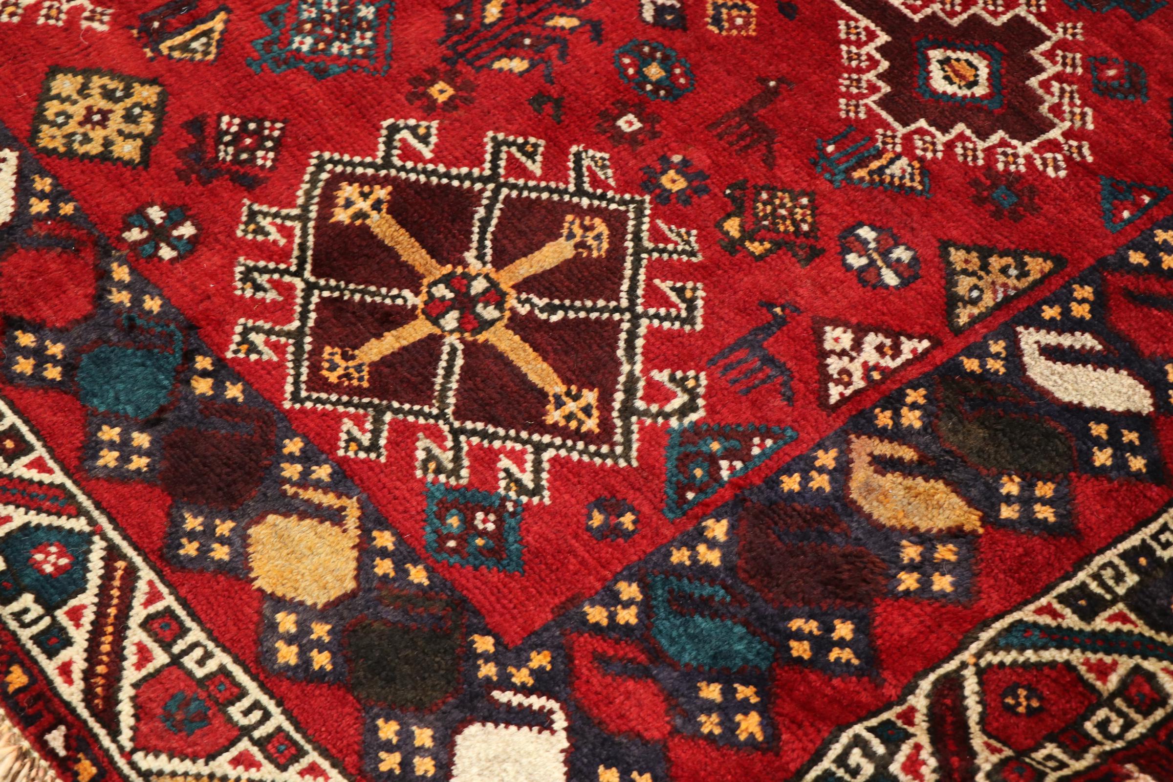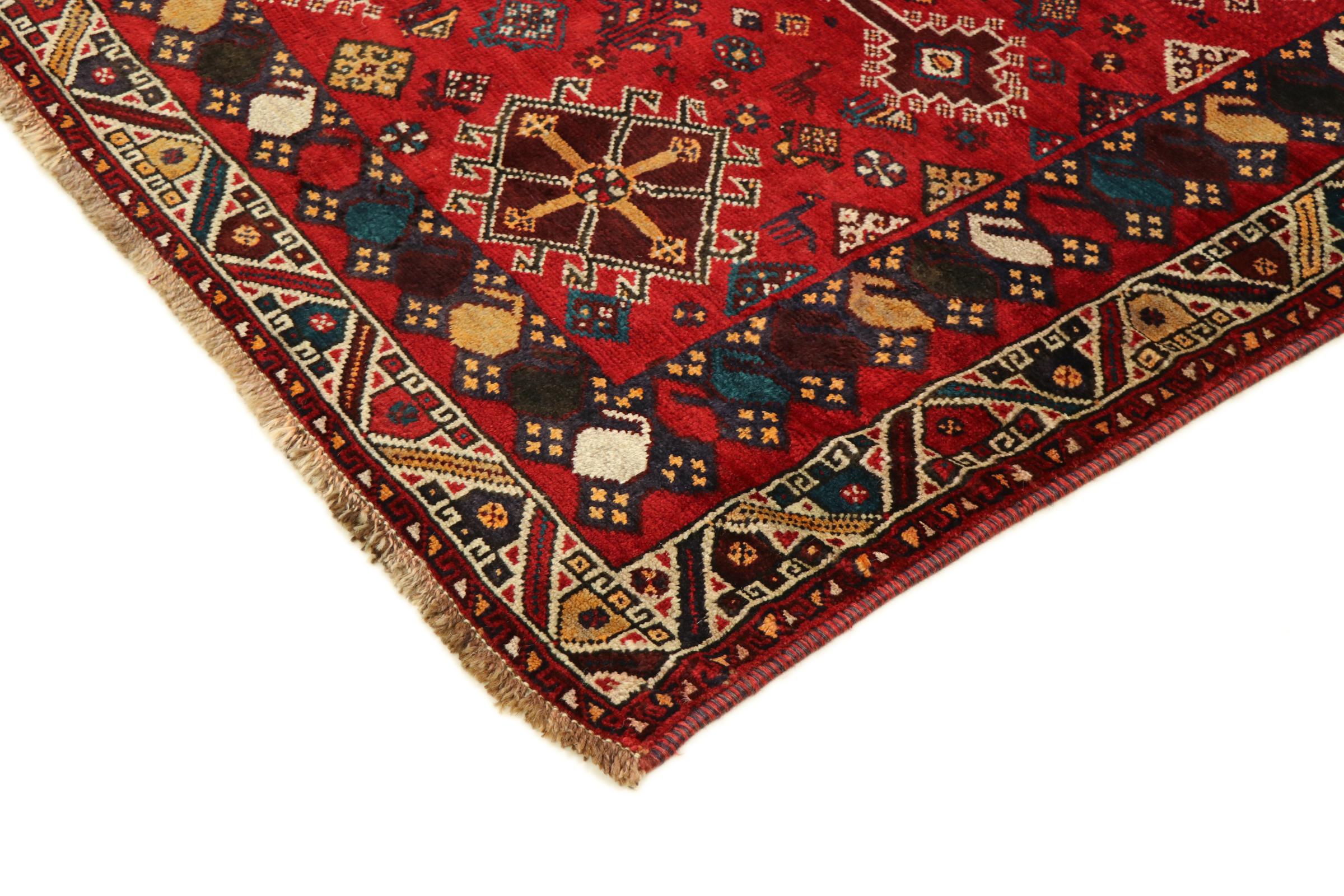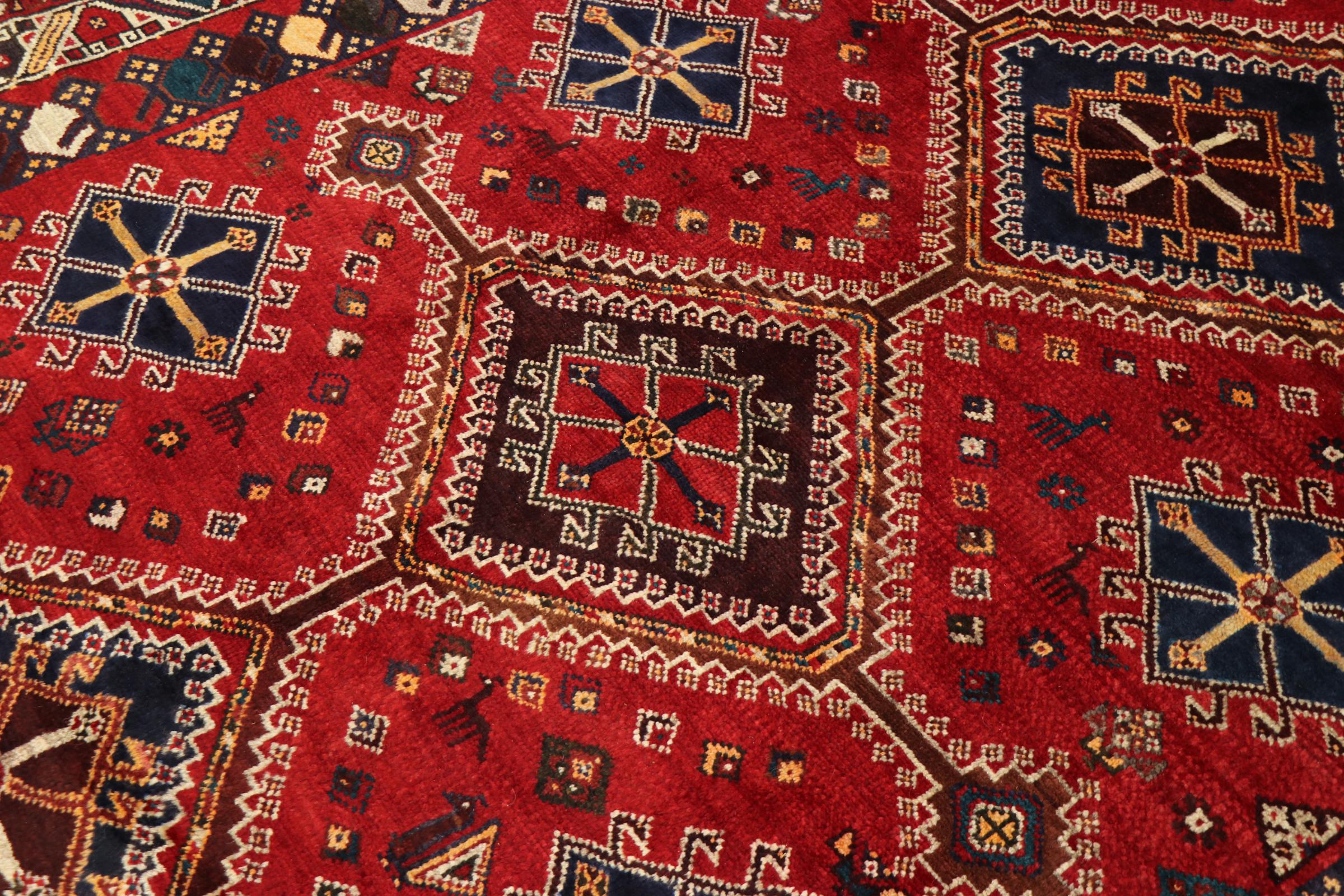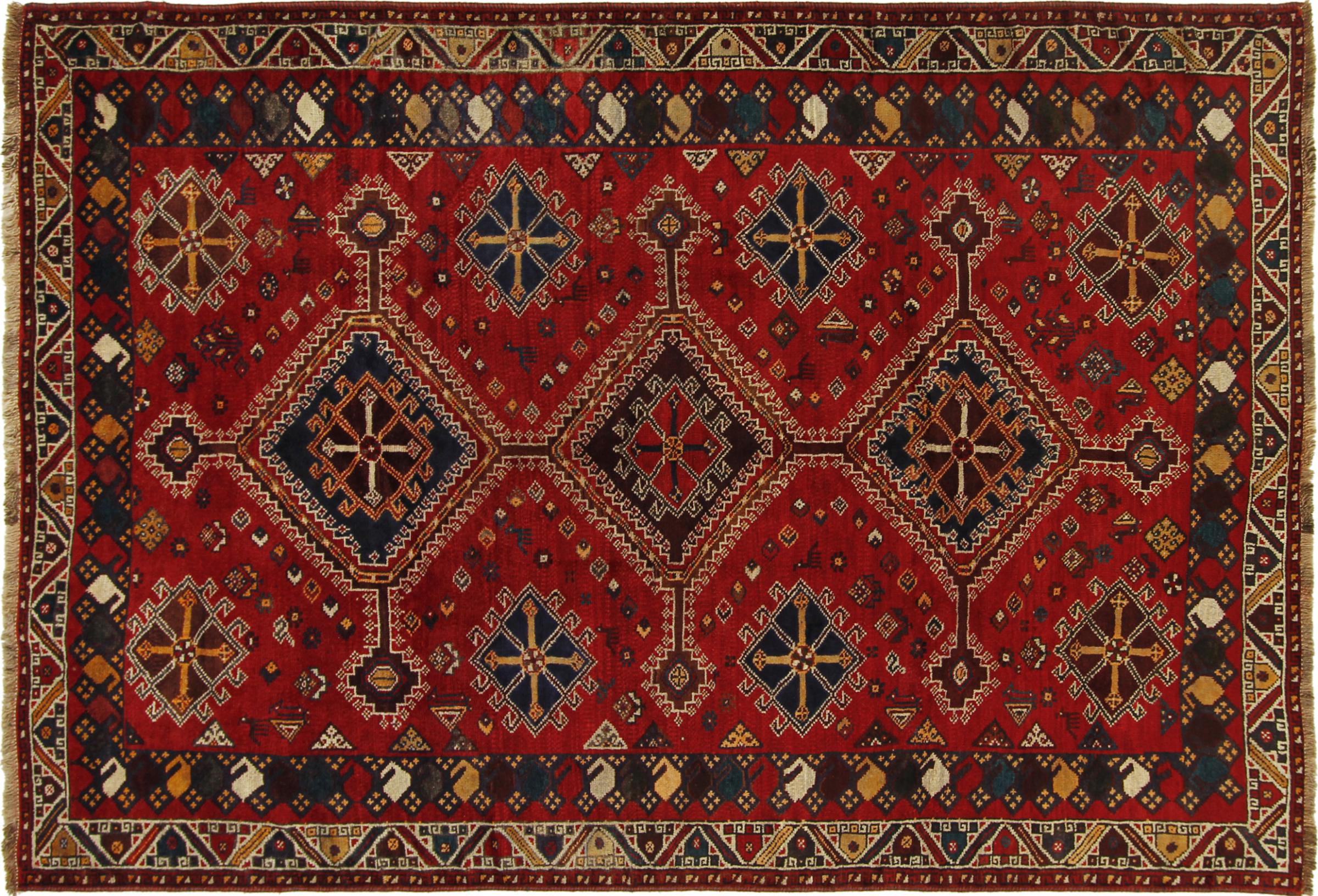 This Persian Ghashghai (Qashqai) rug has been knotted by nomads. Beautiful shades of red, beige and dark blue are characteristic for this type. The rug is handmade and unique. Its colors are natural, dyed in old tradition. The rug's wool comes from sheep of the nomads.