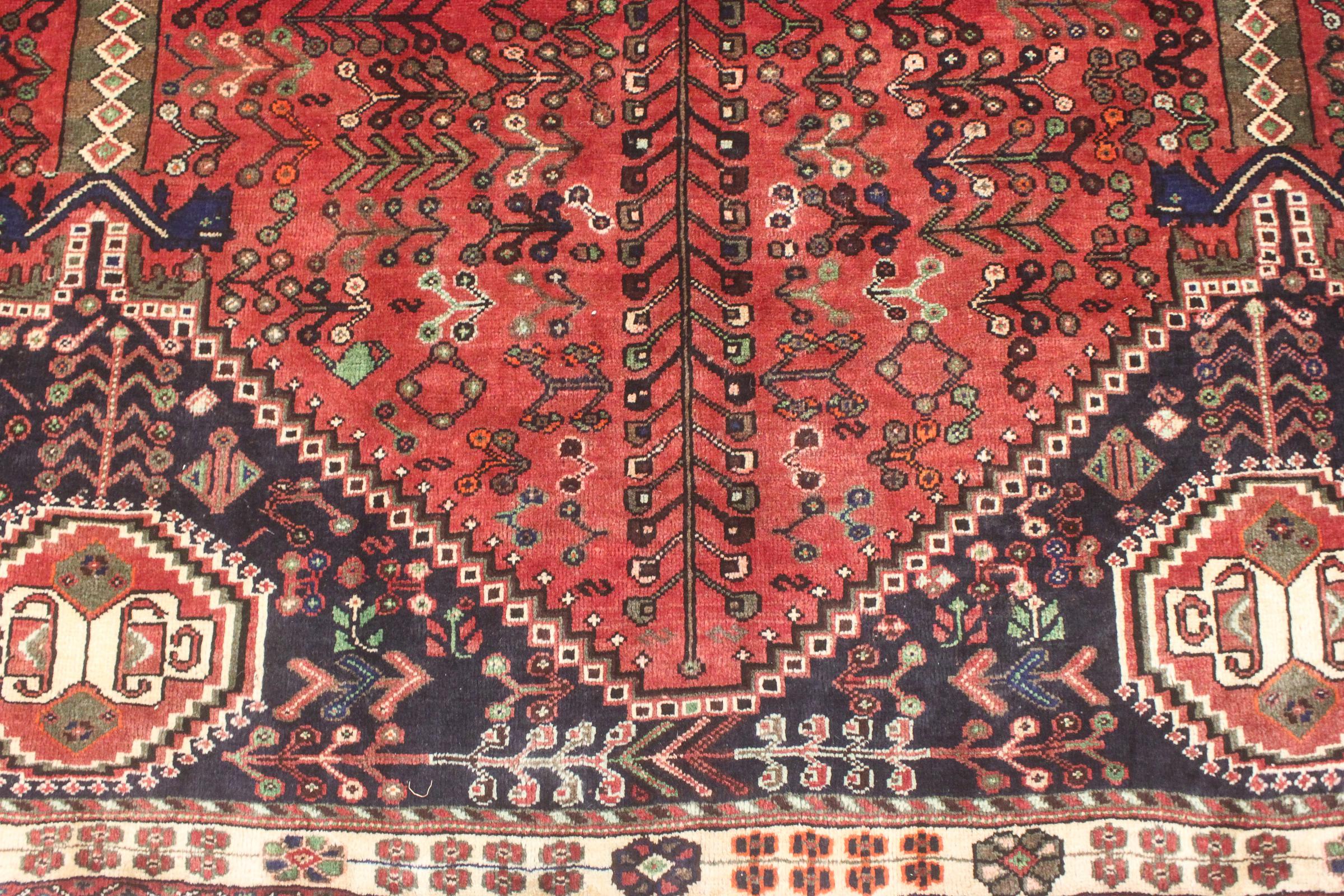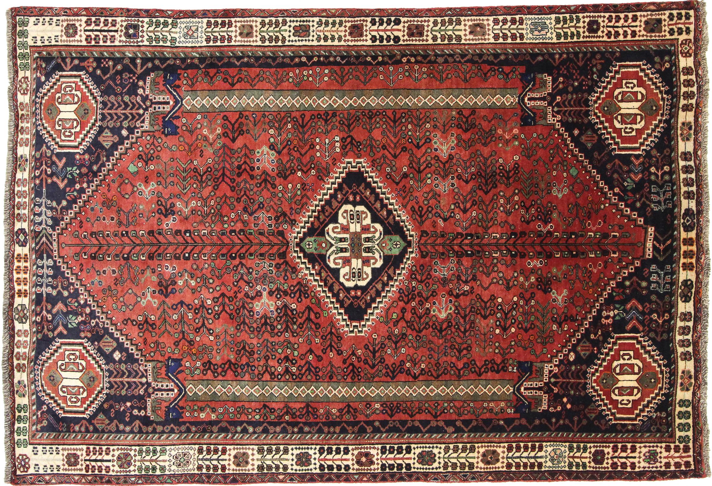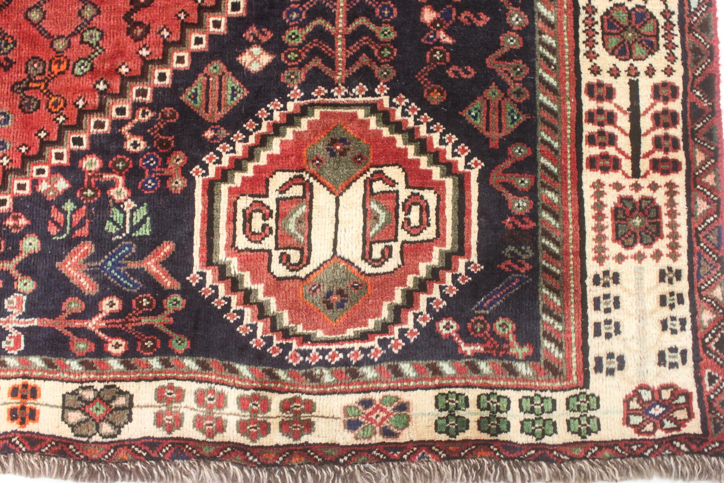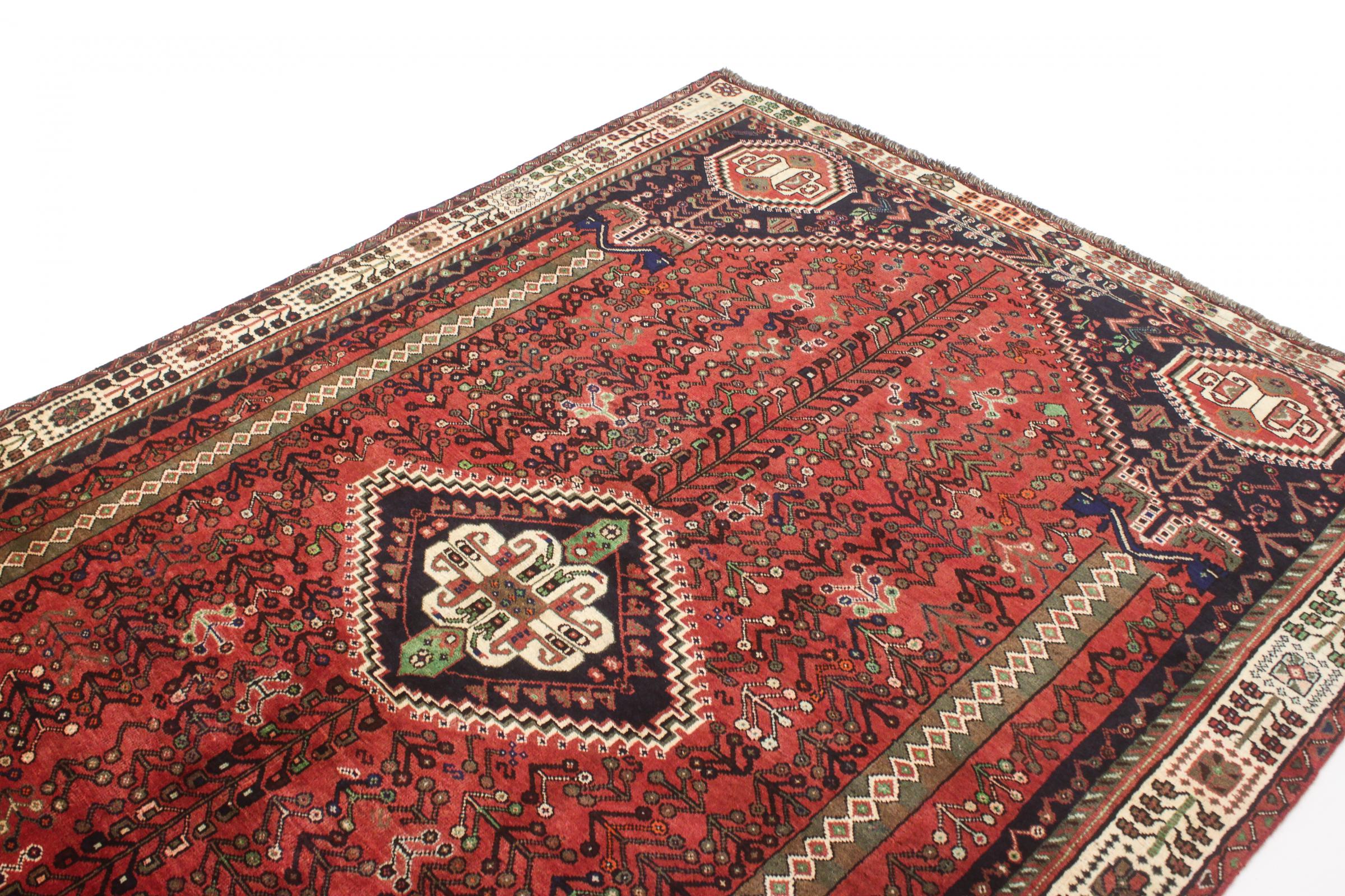 This Persian Ghashghai (Qashqai) rug has been knotted by nomads. Beautiful shades of red, beige and dark blue are characteristic for this type. The rug is handmade and unique. Its colors are natural, dyed in old tradition. The rug's wool comes from sheep of the nomads.