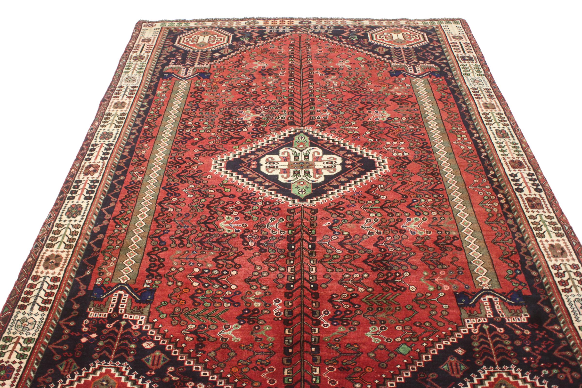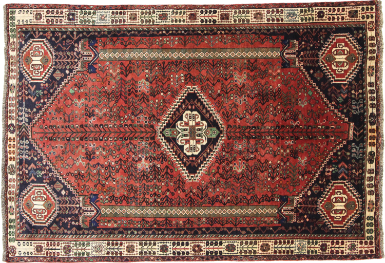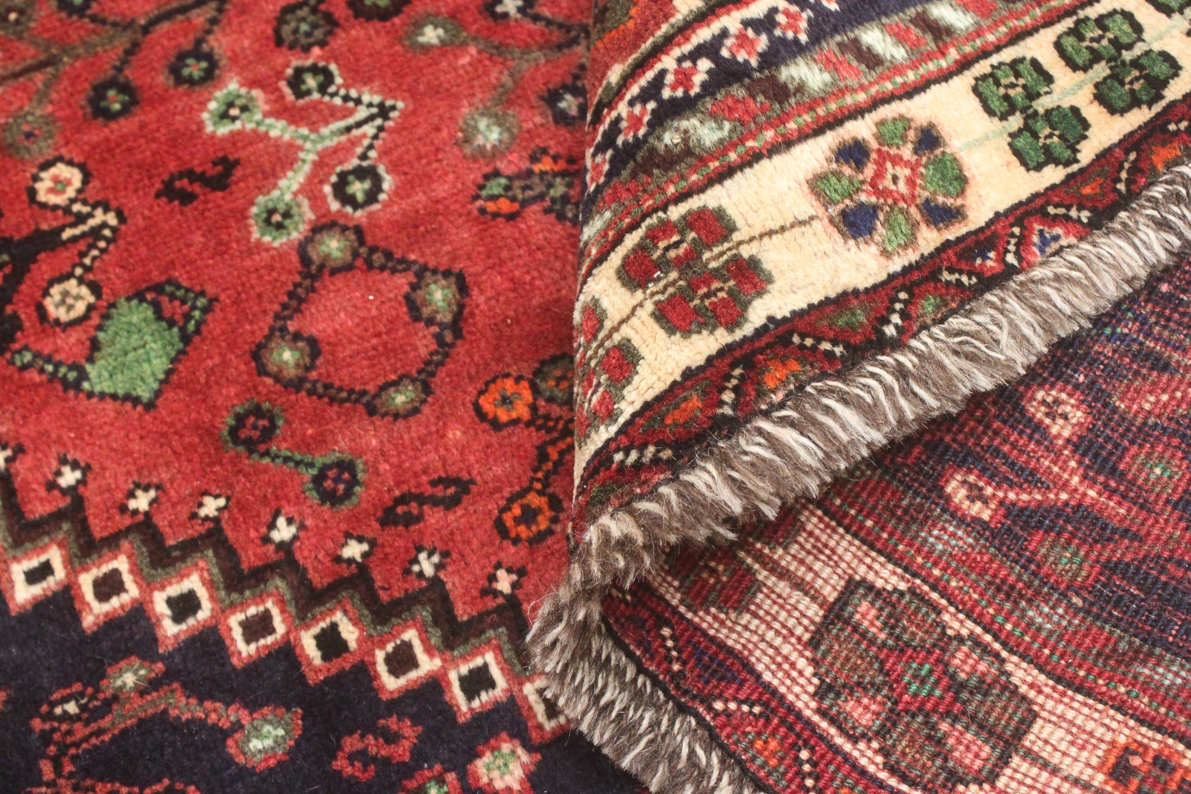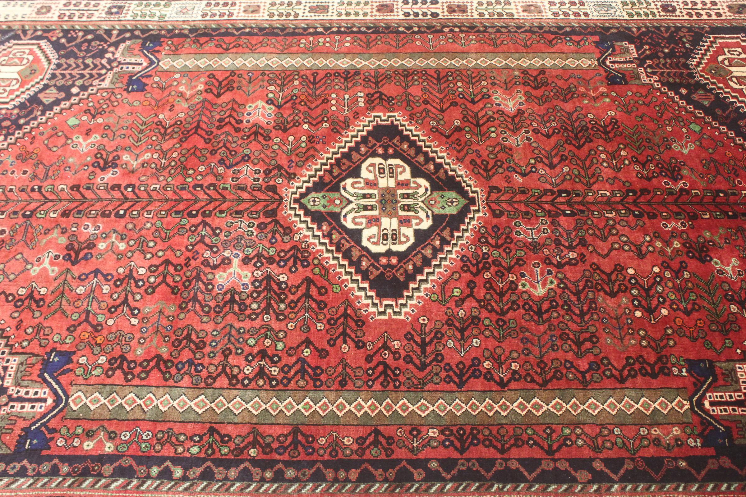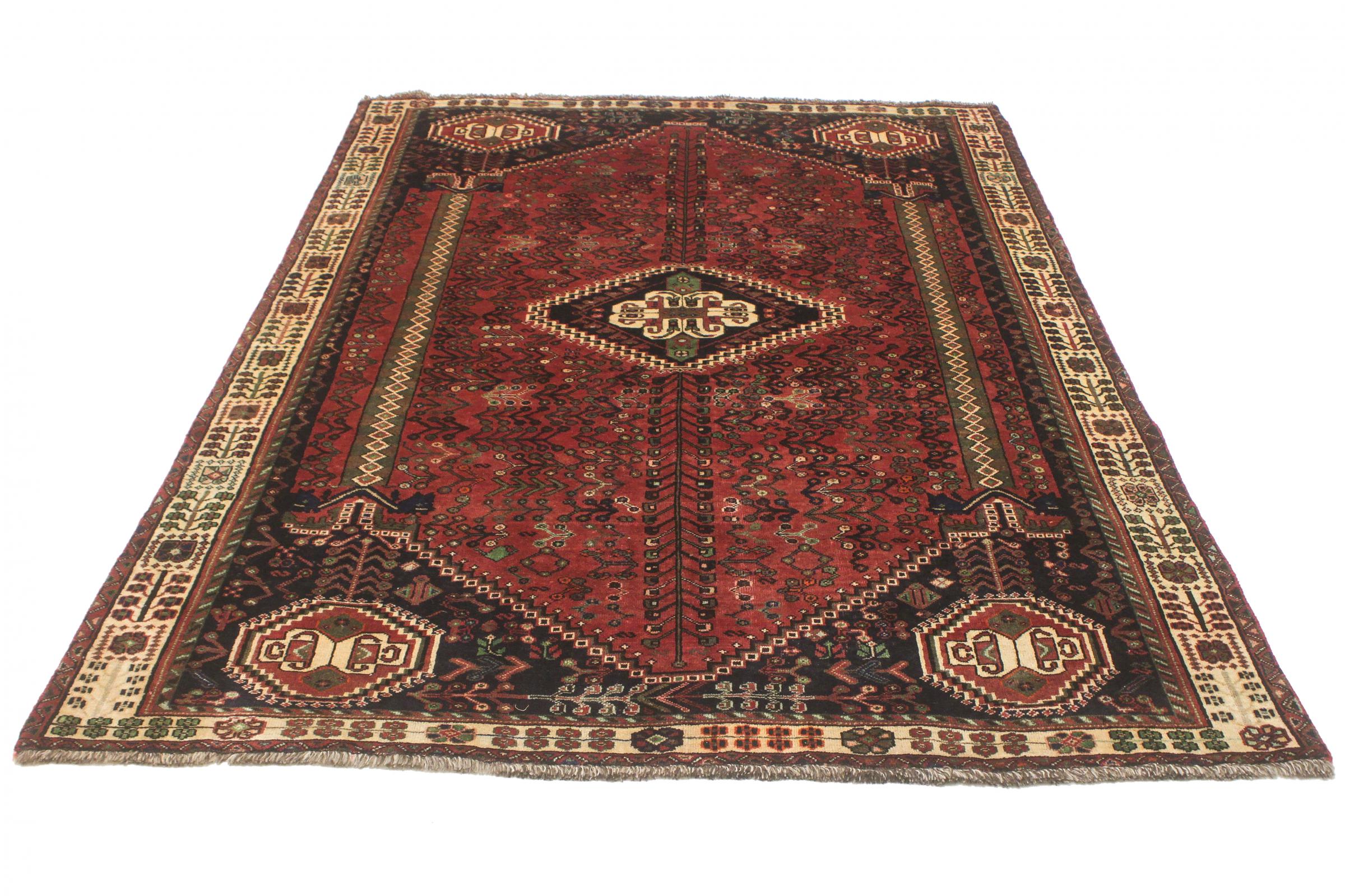 This Persian Ghashghai (Qashqai) rug has been knotted by nomads. Beautiful shades of red, beige and dark blue are characteristic for this type. The rug is handmade and unique. Its colors are natural, dyed in old tradition. The rug's wool comes from sheep of the nomads.
