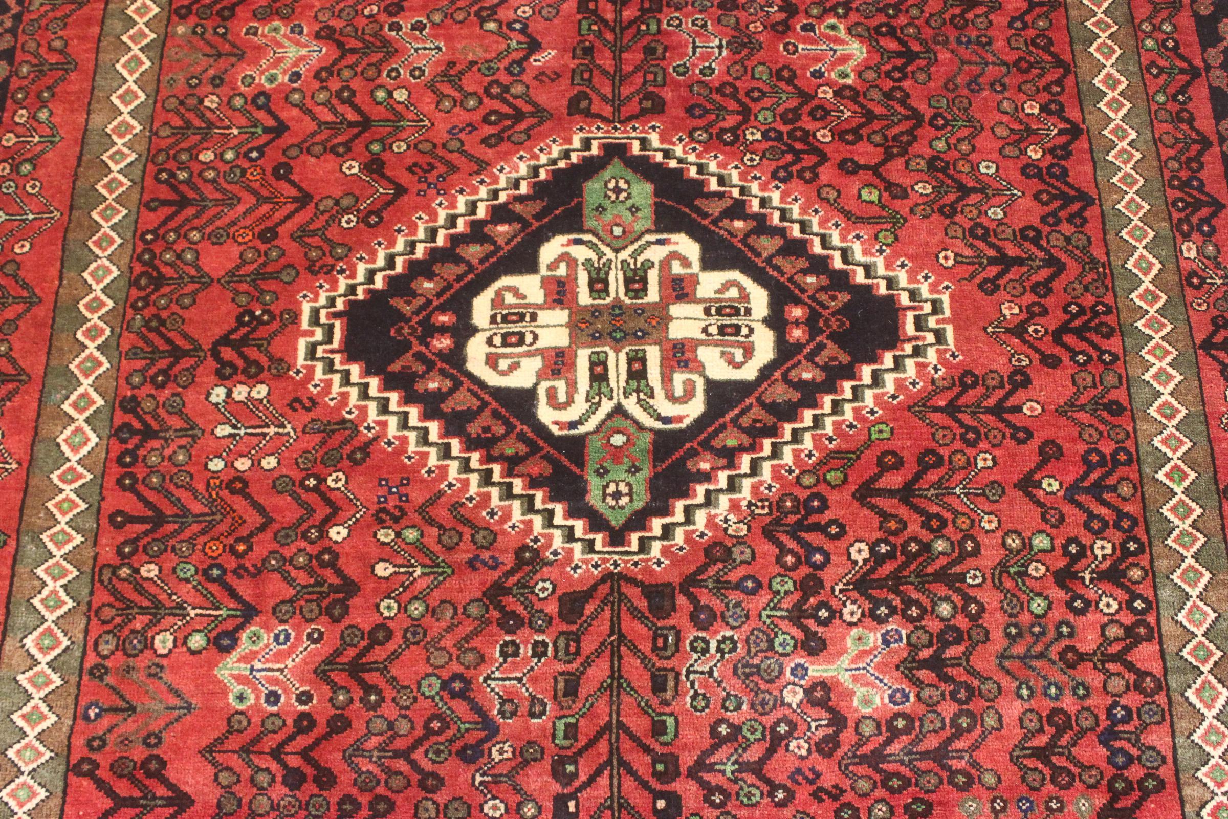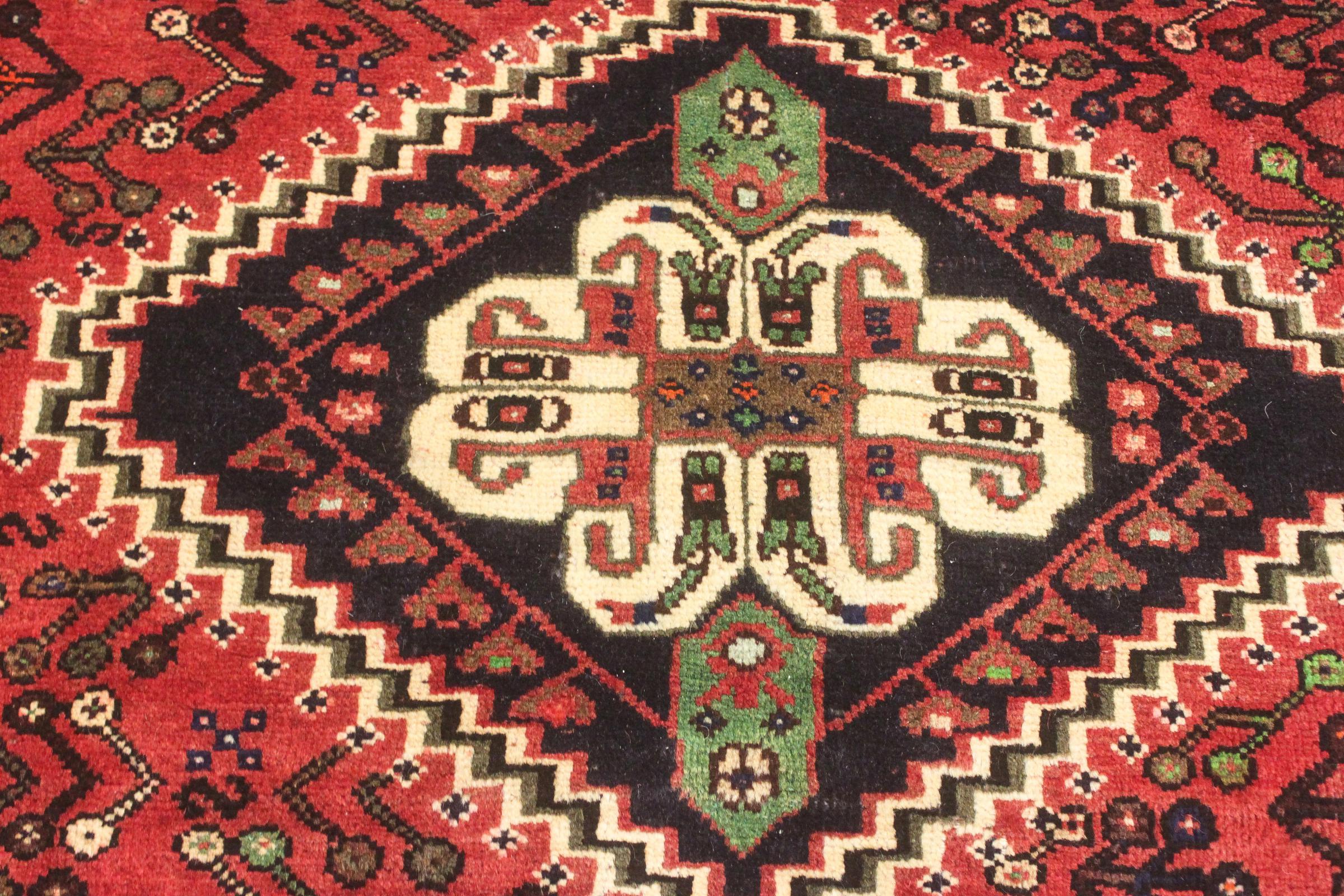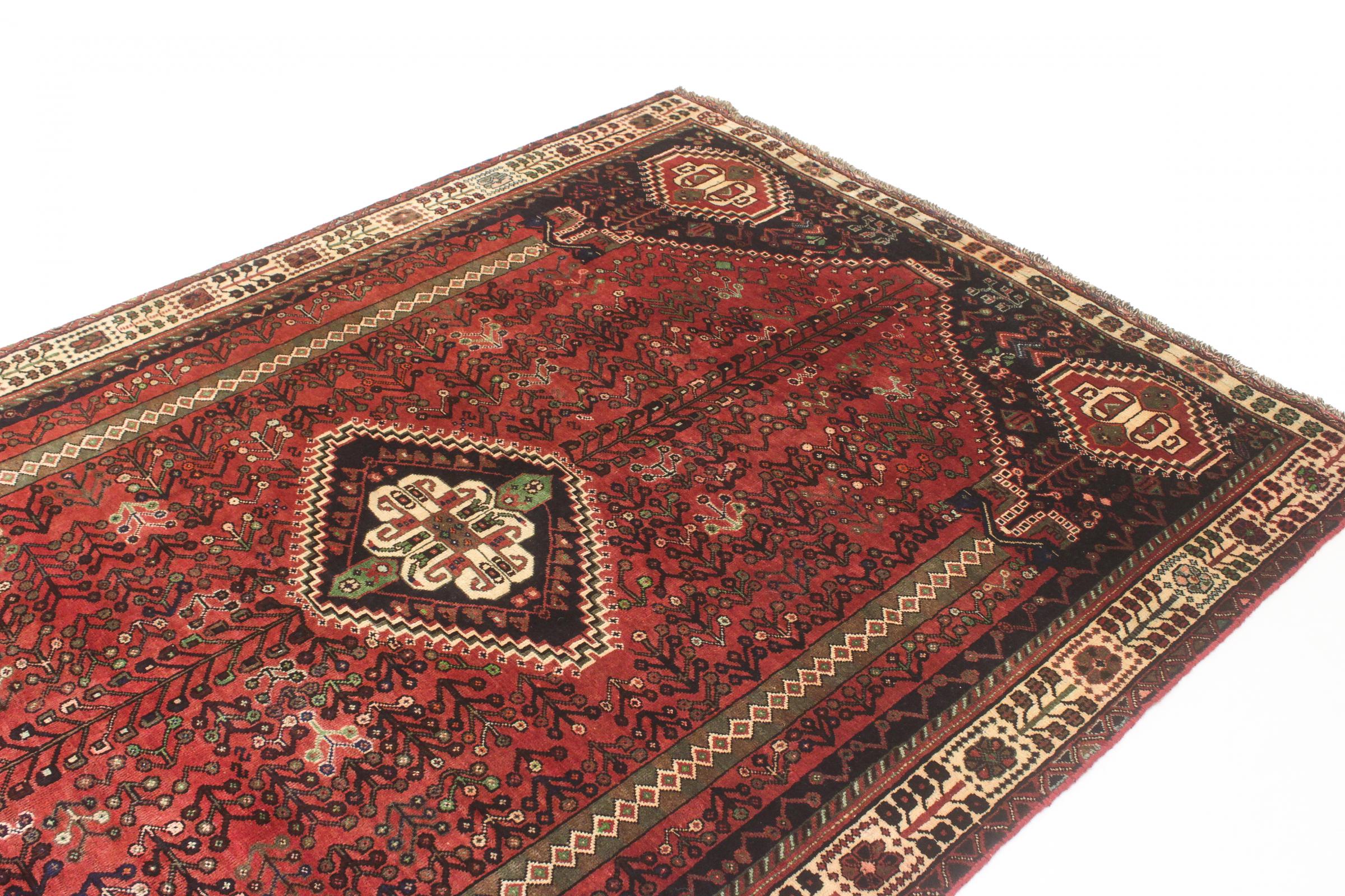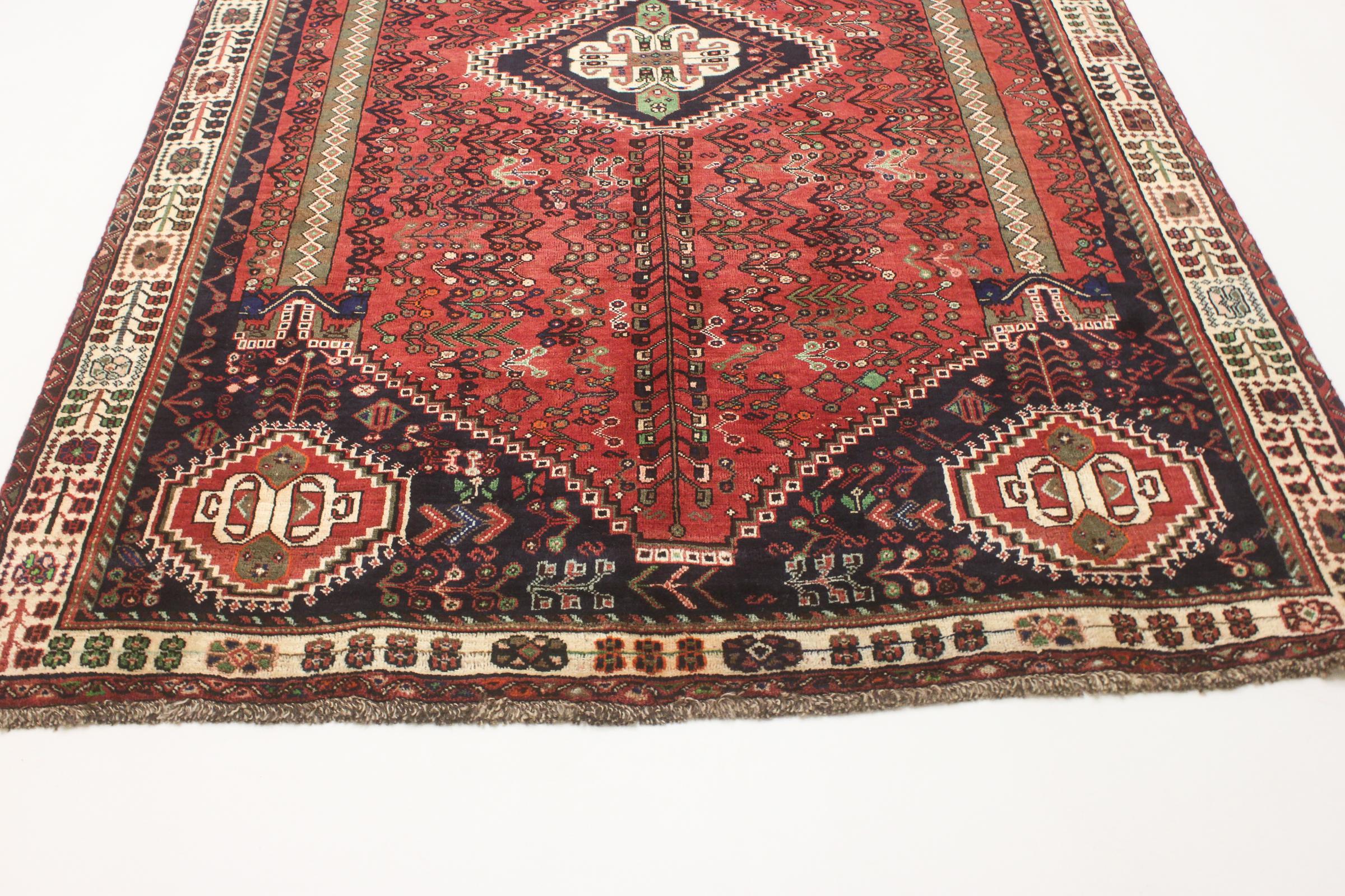 This Persian Ghashghai (Qashqai) rug has been knotted by nomads. Beautiful shades of red, beige and dark blue are characteristic for this type. The rug is handmade and unique. Its colors are natural, dyed in old tradition. The rug's wool comes from sheep of the nomads.