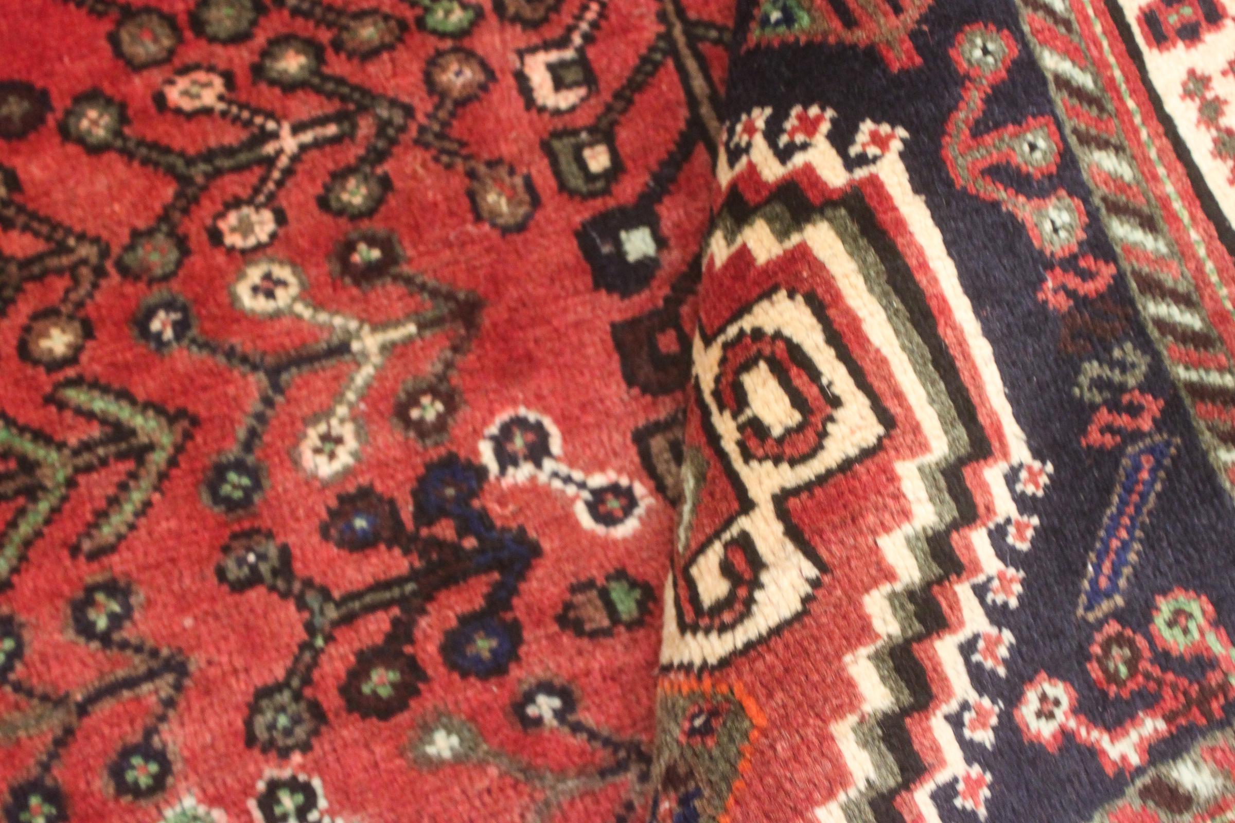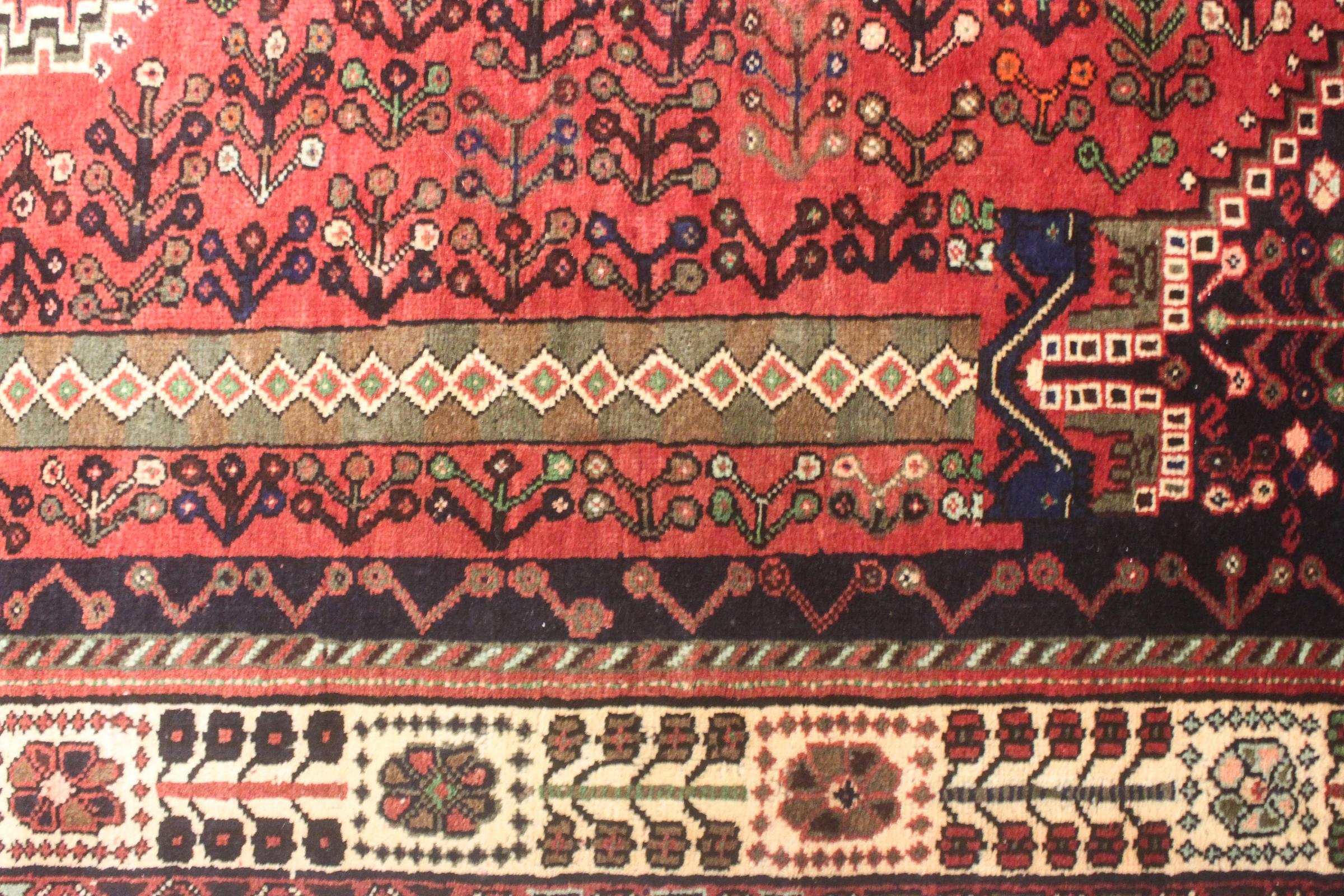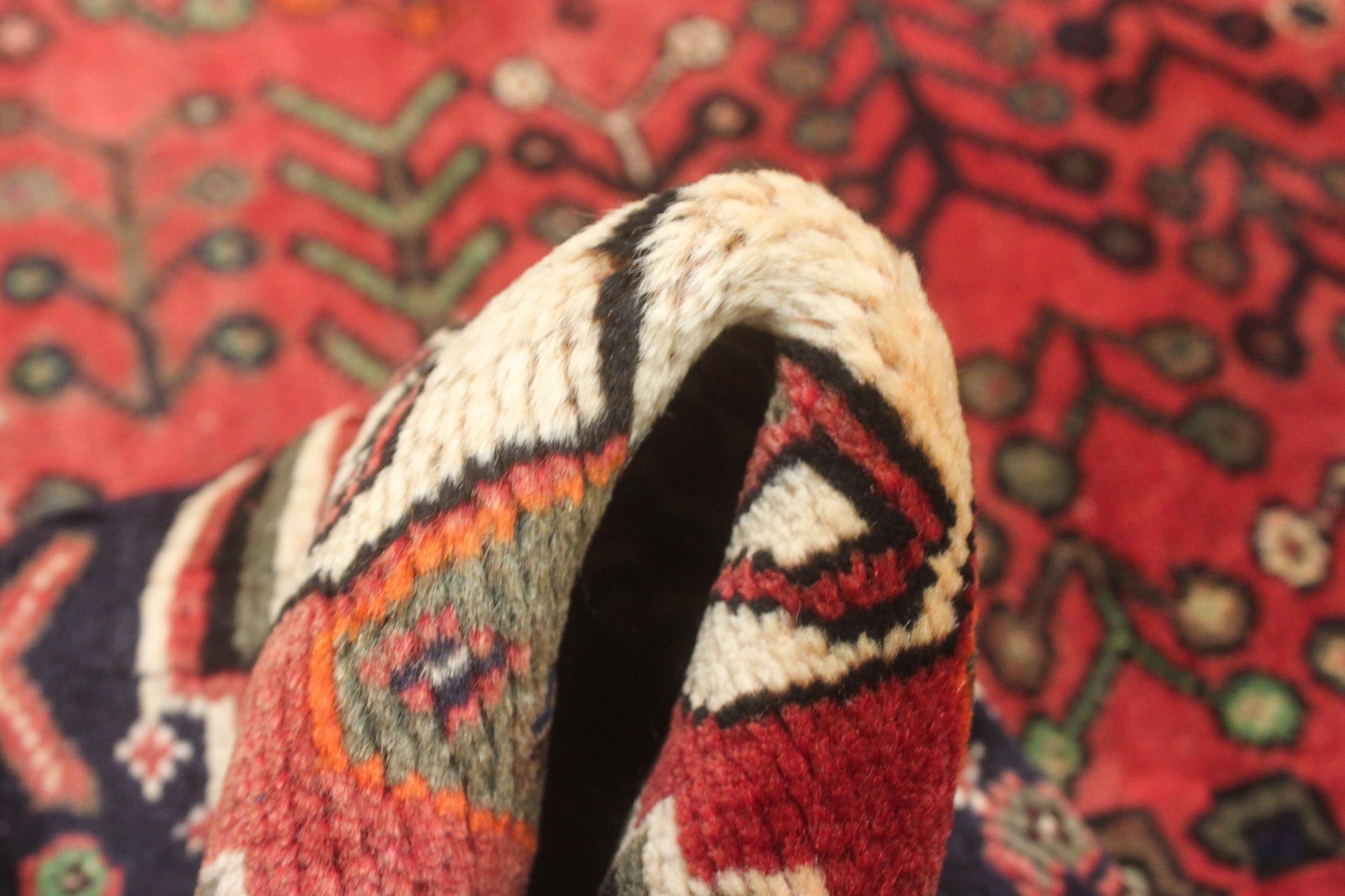 This carpet belongs to the village and nomadic carpets from Iran, the former Persia. This kind of carpets is hand knotted in smaller towns and villages in ancient tradition. Even nomads still knot Persian carpets in the open air. The carpets are knotted without a draft and entirely from memory. They are characterized by classical ornaments arranged in linear and geometric patterns. Thanks to their cultural and traditional origins, these rugs possess a unique character that embodies ancient Persia.