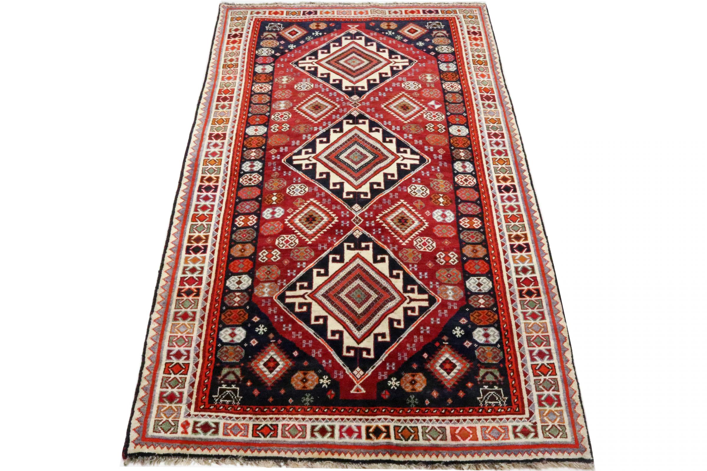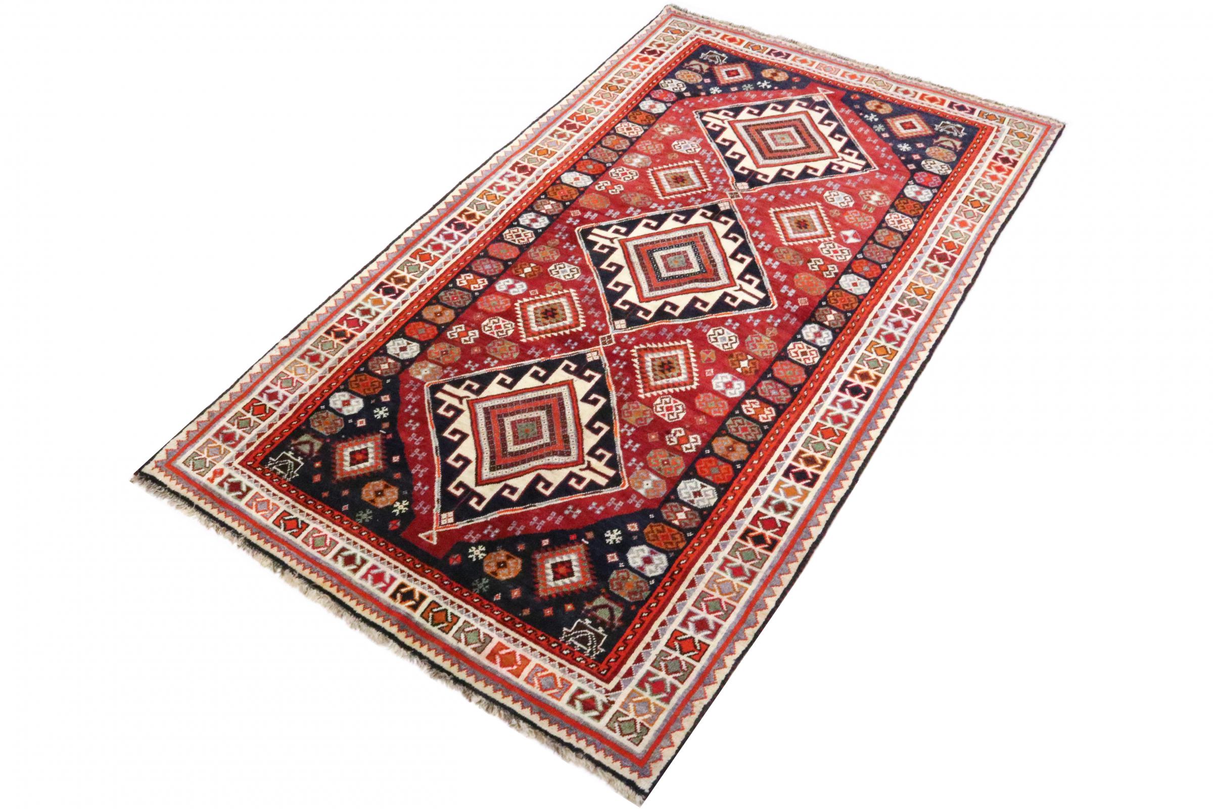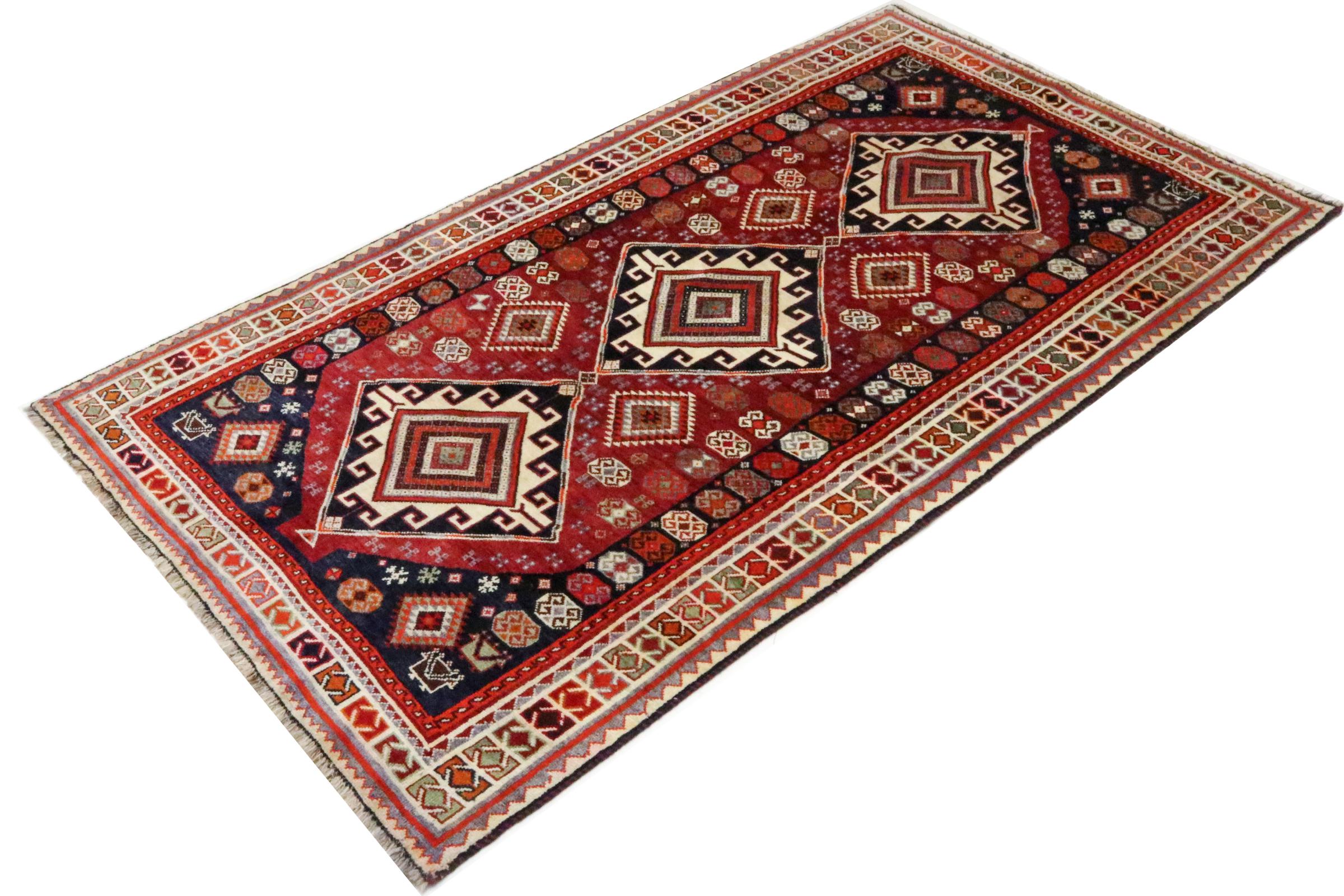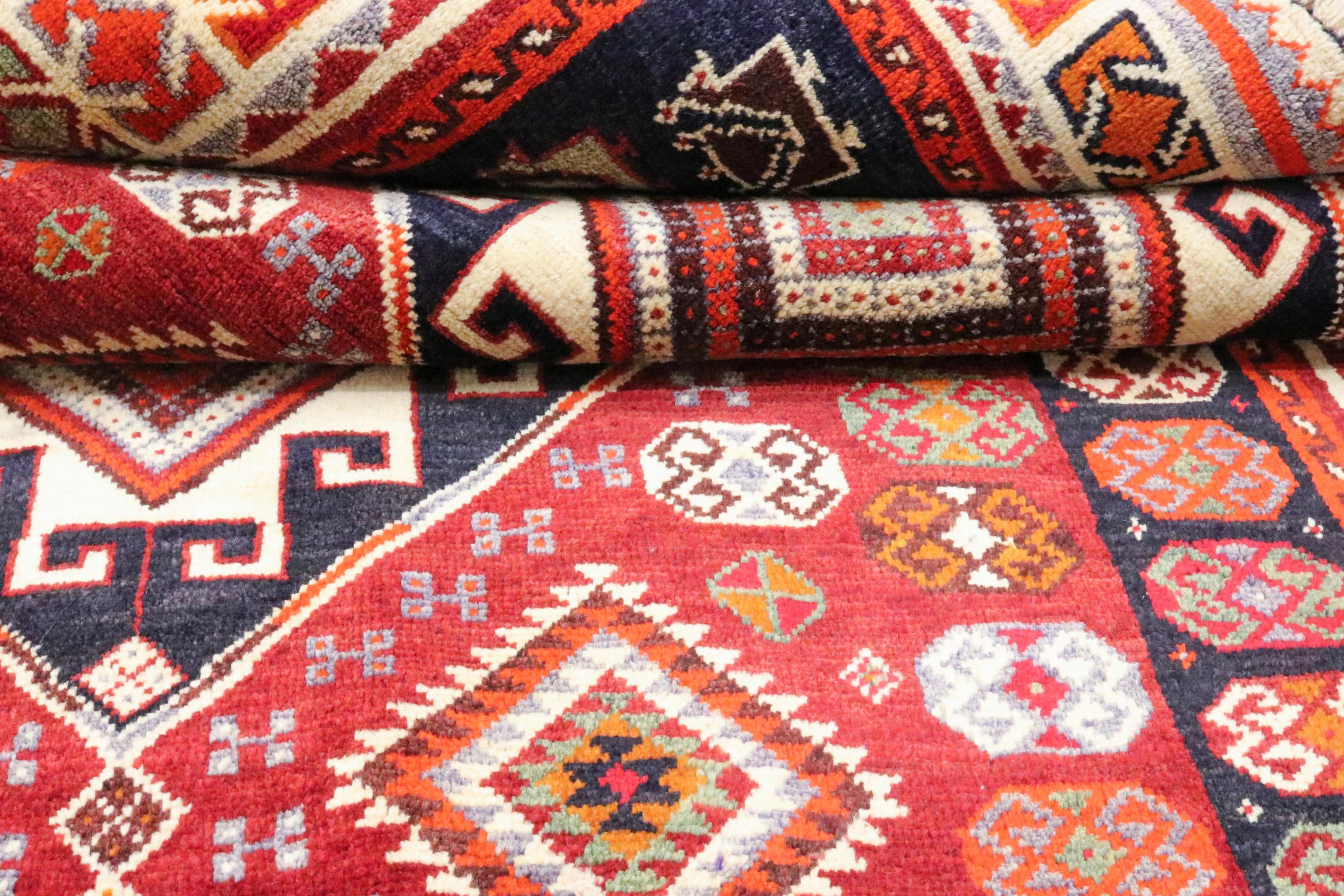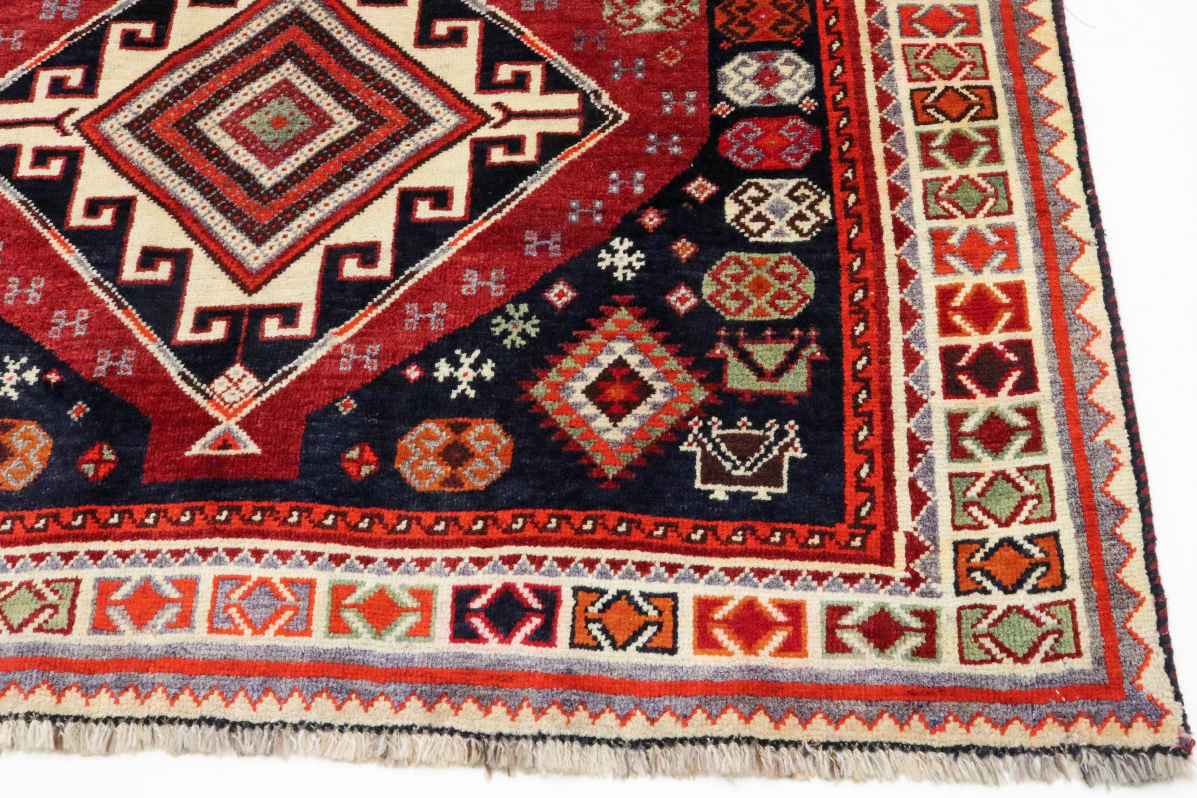 This Persian Ghashghai (Qashqai) rug has been knotted by nomads. Beautiful shades of red, beige and dark blue are characteristic for this type. The rug is handmade and unique. Its colors are natural, dyed in old tradition. The rug's wool comes from sheep of the nomads.