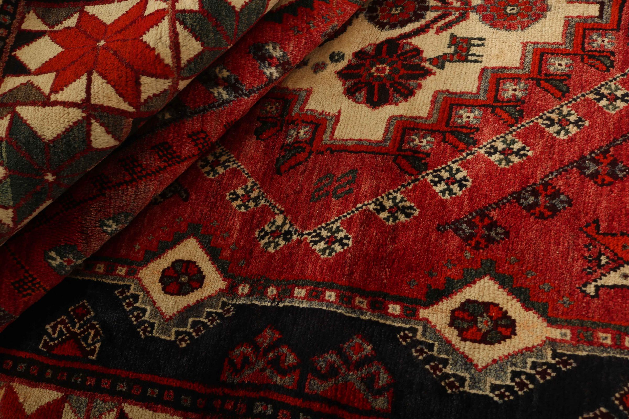 This Persian Ghashghai (Qashqai) rug has been knotted by nomads. Beautiful shades of red, beige and dark blue are characteristic for this type. The rug is handmade and unique. Its colors are natural, dyed in old tradition. The rug's wool comes from sheep of the nomads.