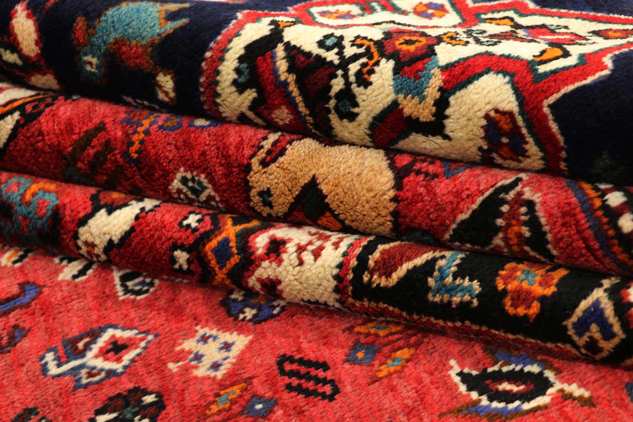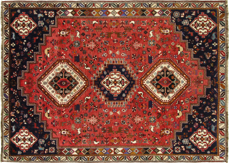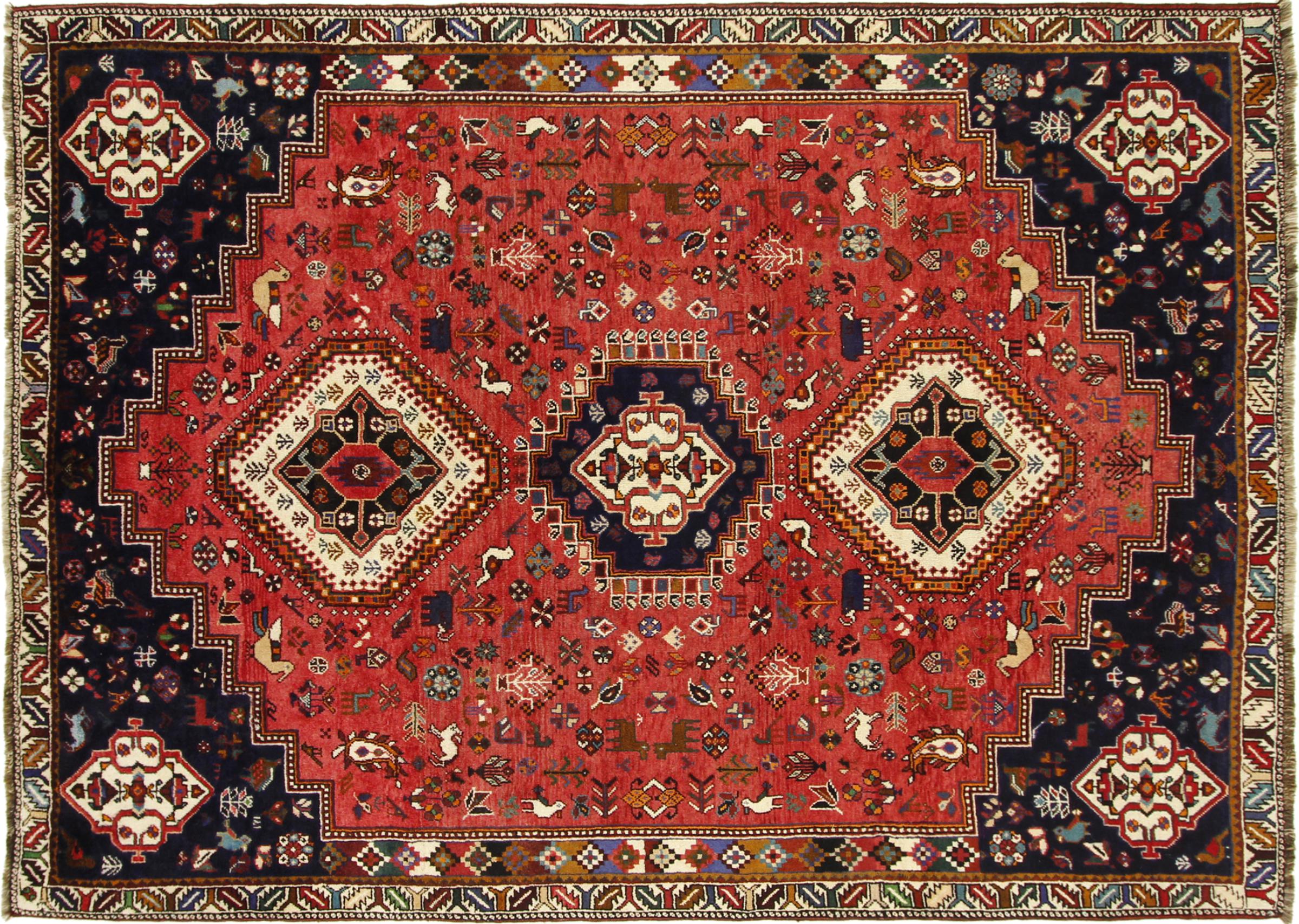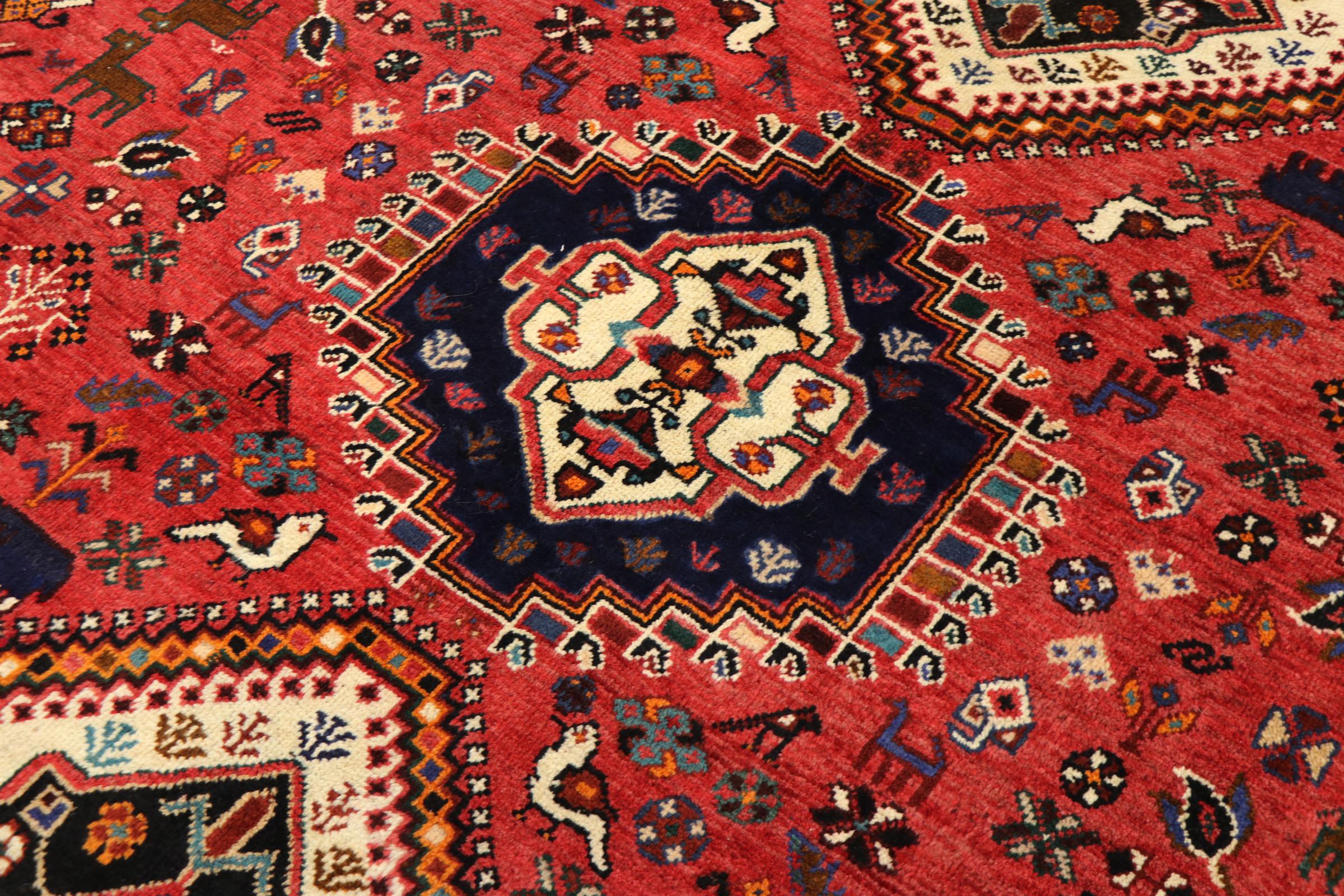 This Persian Ghashghai (Qashqai) rug has been knotted by nomads. Beautiful shades of red, beige and dark blue are characteristic for this type. The rug is handmade and unique. Its colors are natural, dyed in old tradition. The rug's wool comes from sheep of the nomads.