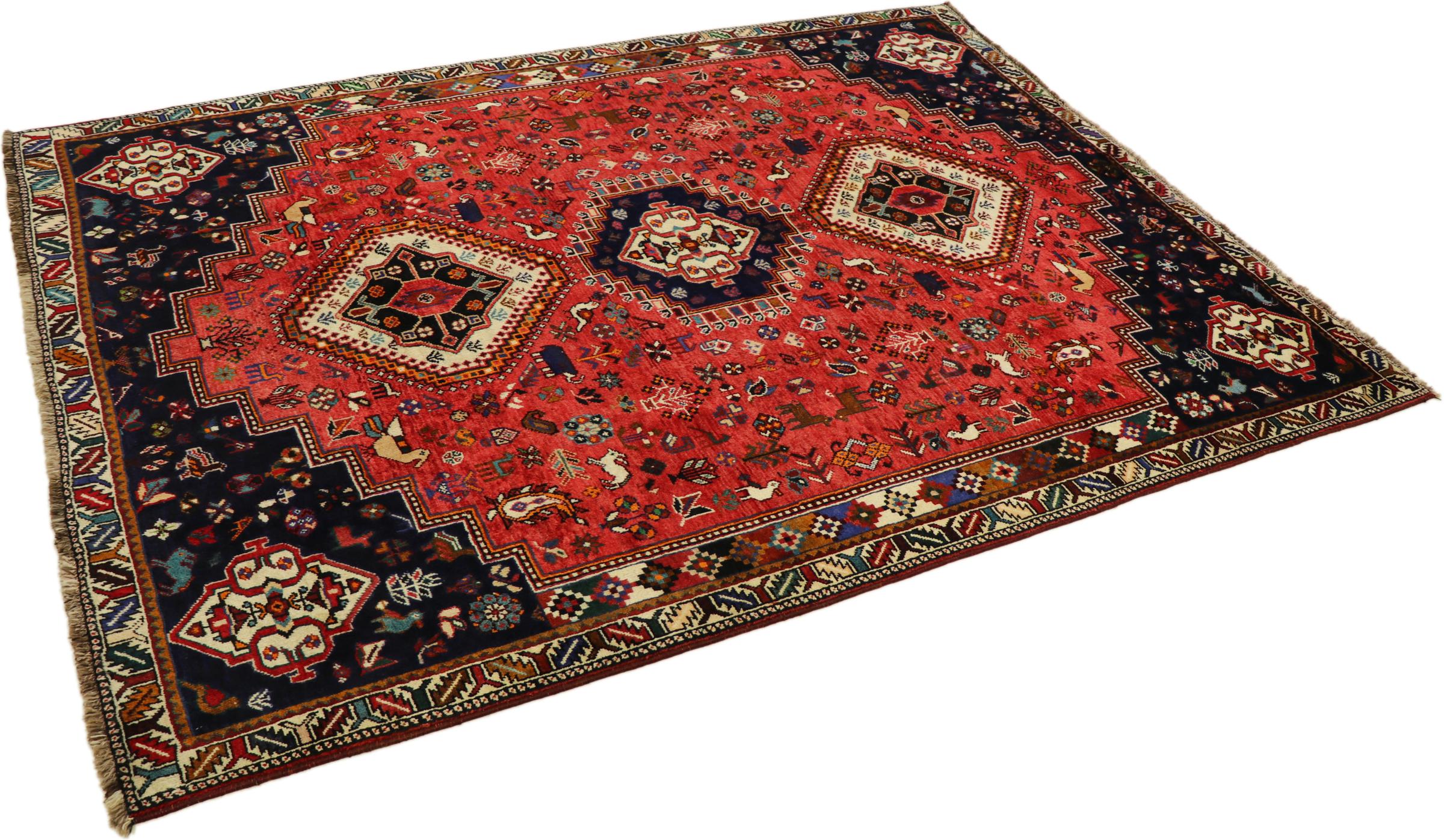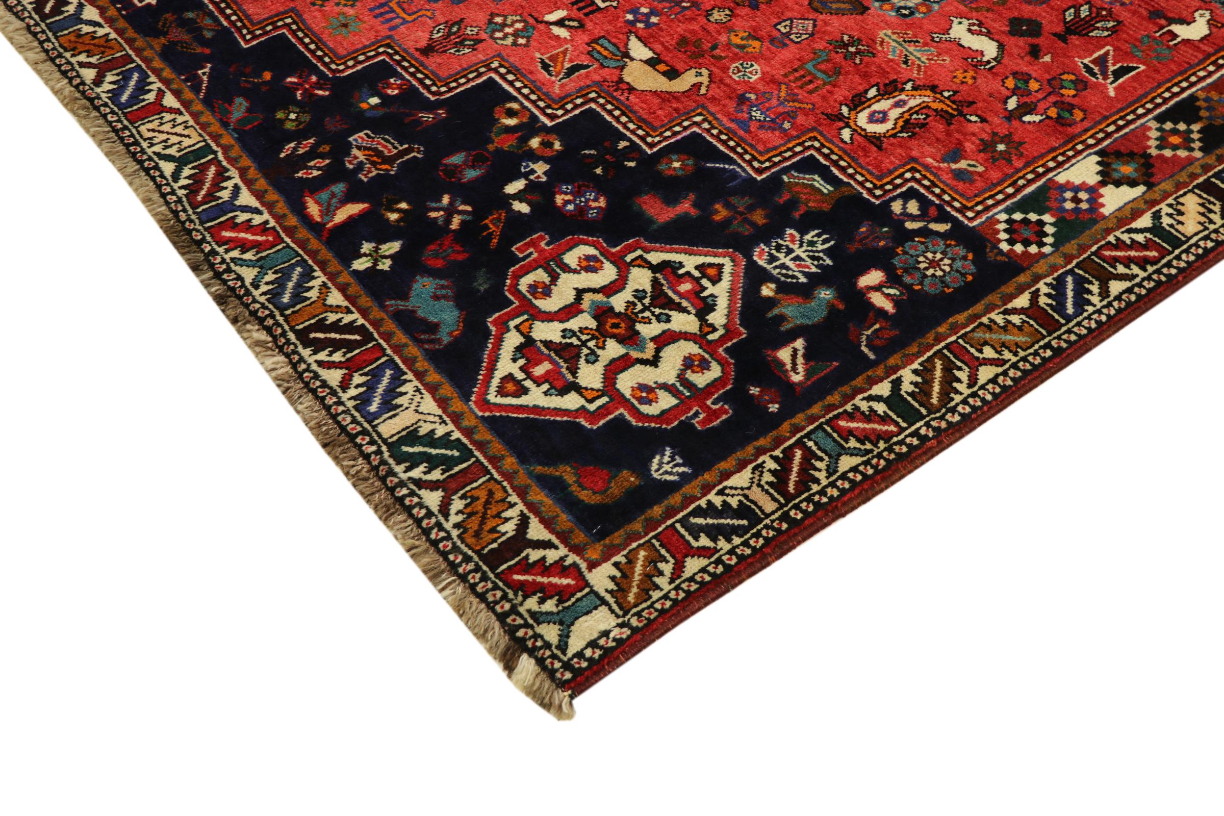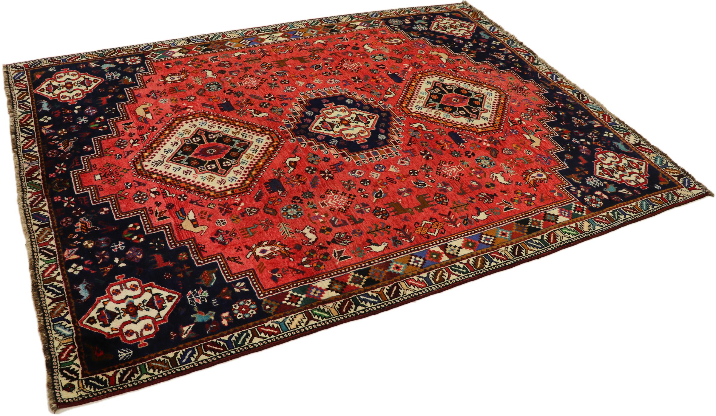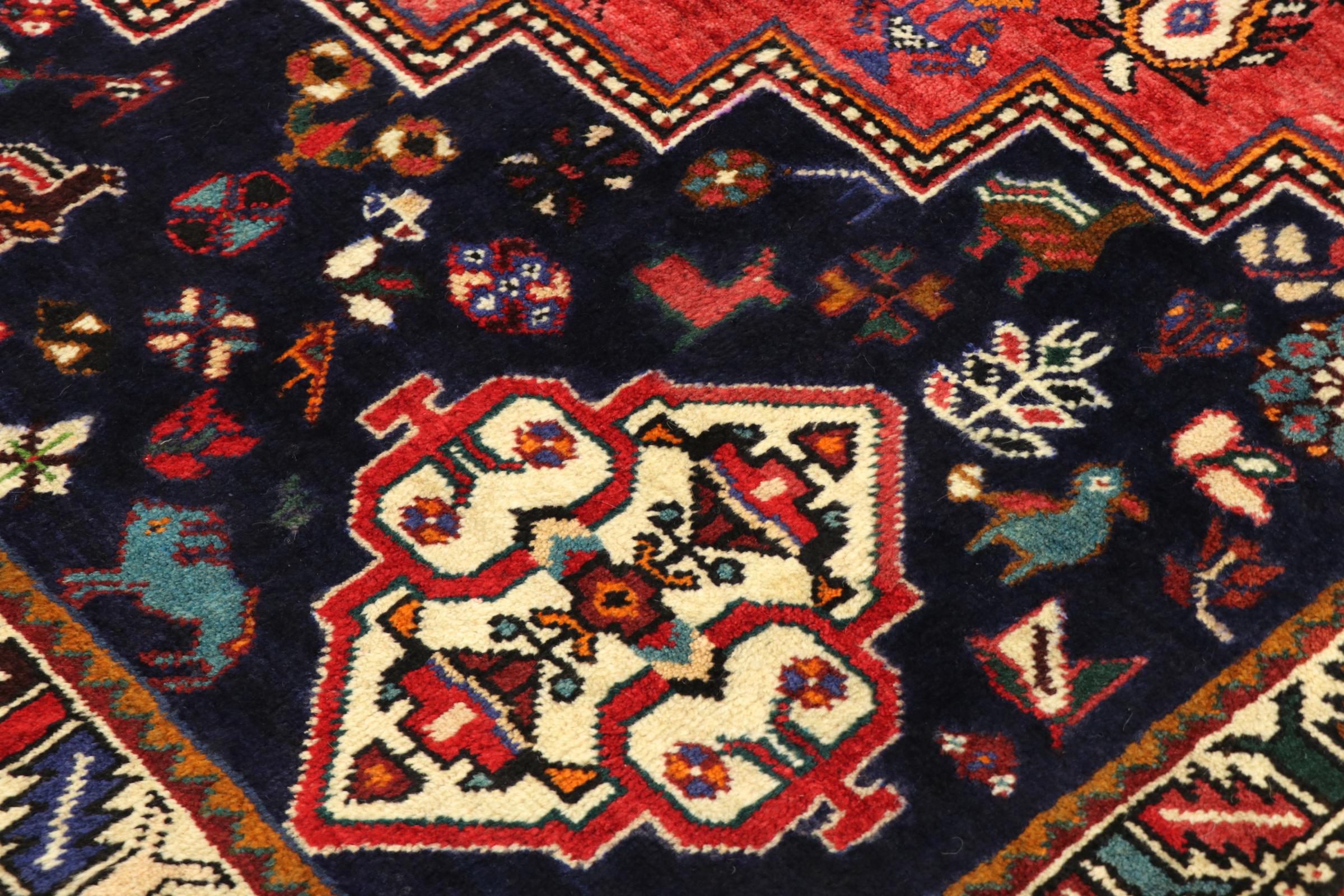 This Persian Ghashghai (Qashqai) rug has been knotted by nomads. Beautiful shades of red, beige and dark blue are characteristic for this type. The rug is handmade and unique. Its colors are natural, dyed in old tradition. The rug's wool comes from sheep of the nomads.