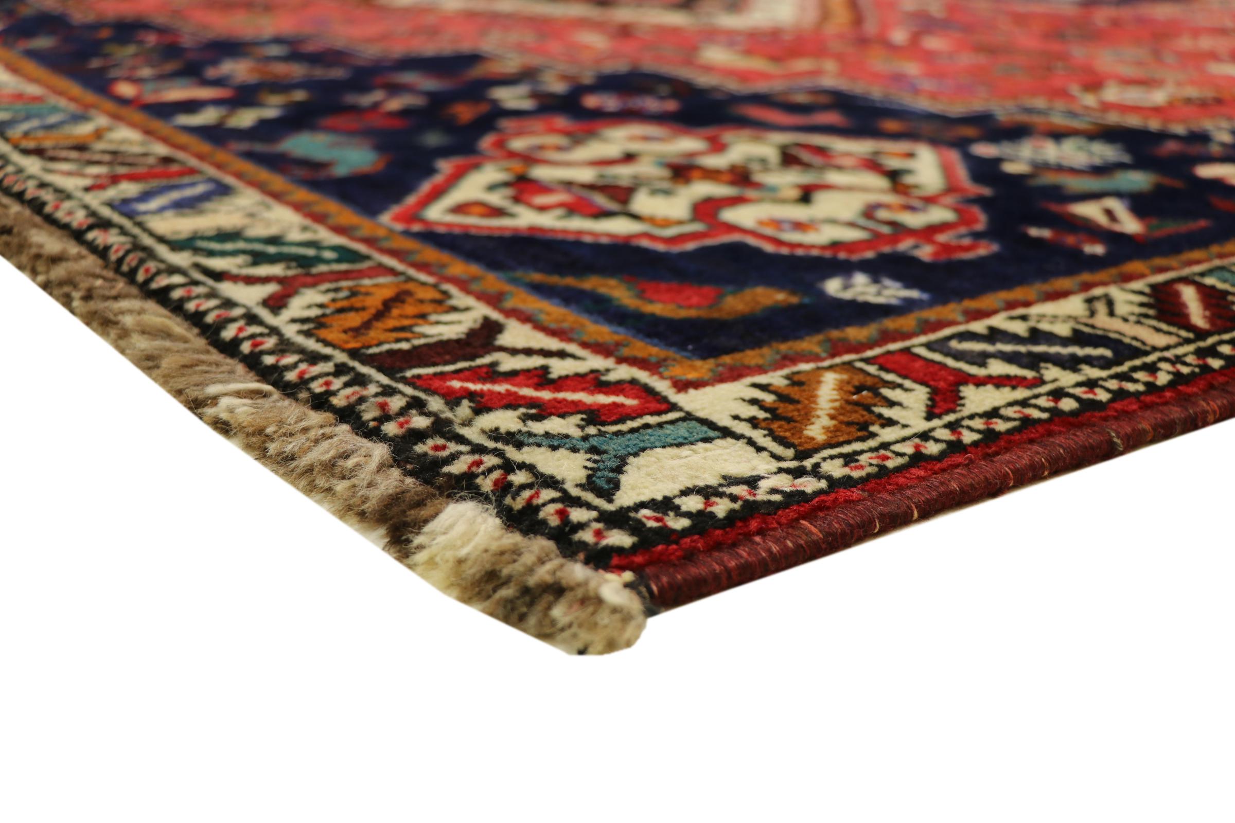 This carpet belongs to the village and nomadic carpets from Iran, the former Persia. This kind of carpets is hand knotted in smaller towns and villages in ancient tradition. Even nomads still knot Persian carpets in the open air. The carpets are knotted without a draft and entirely from memory. They are characterized by classical ornaments arranged in linear and geometric patterns. Thanks to their cultural and traditional origins, these rugs possess a unique character that embodies ancient Persia.