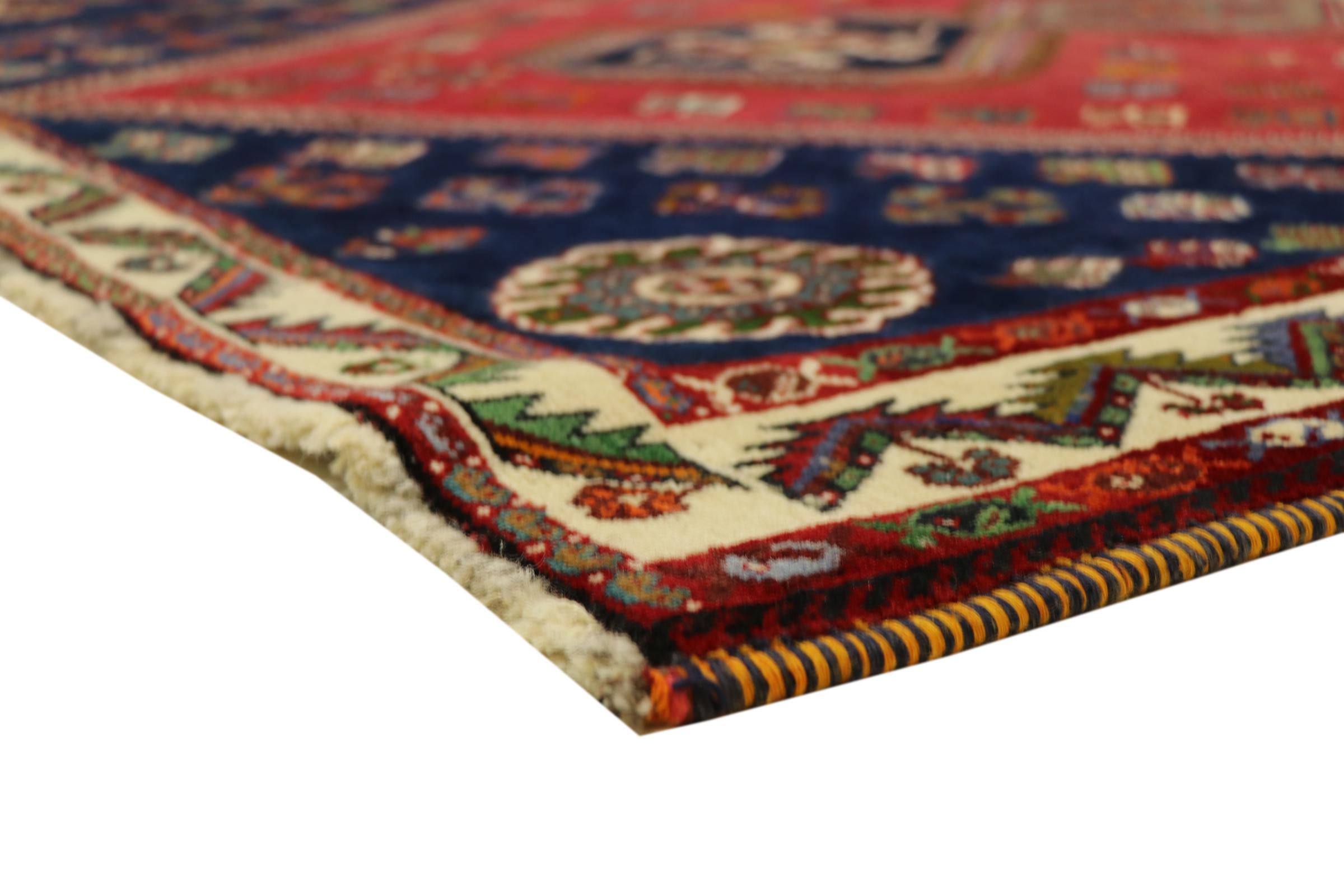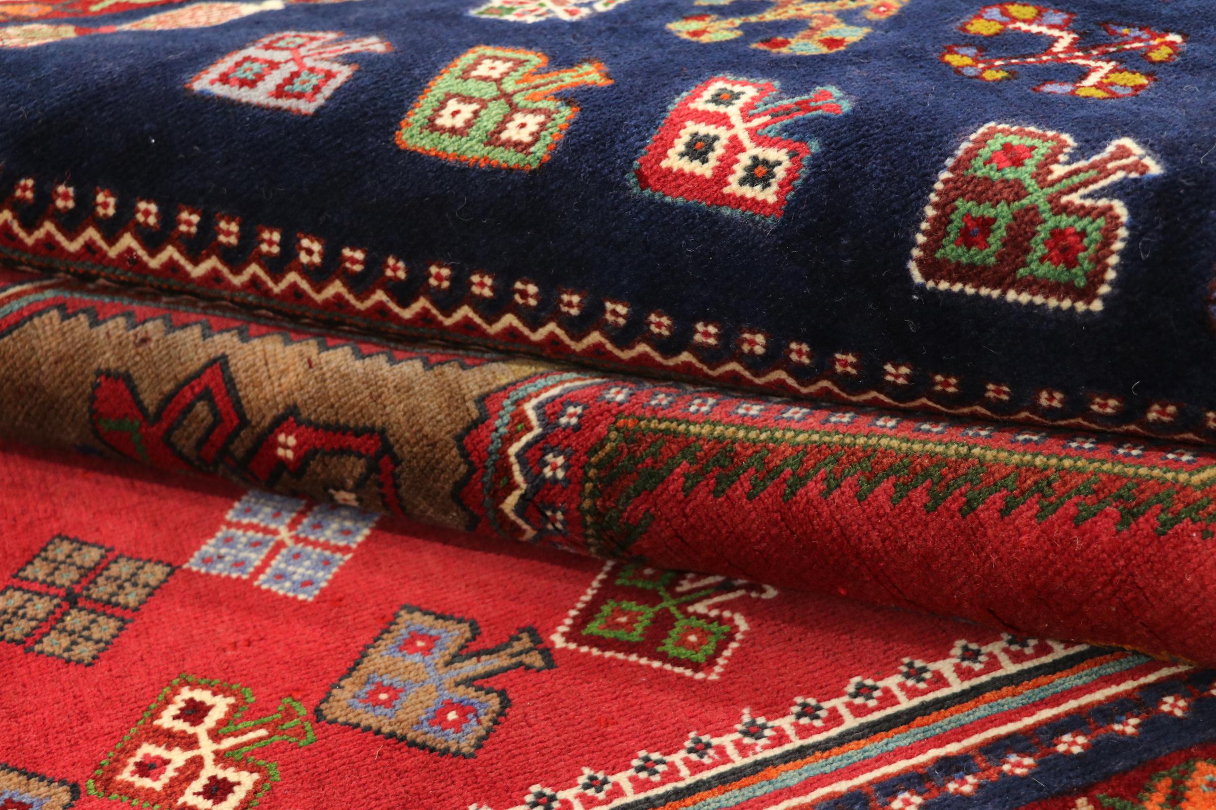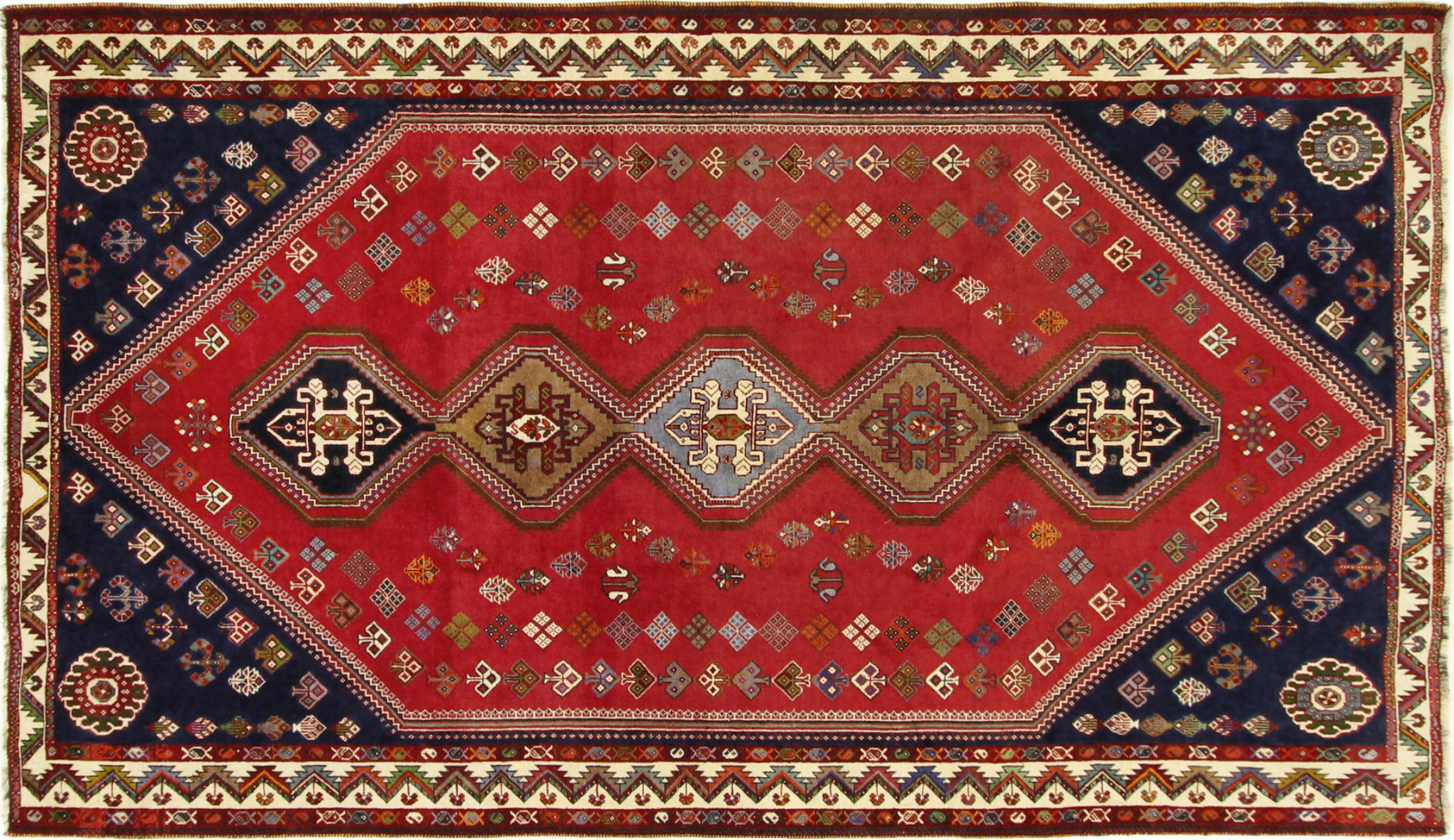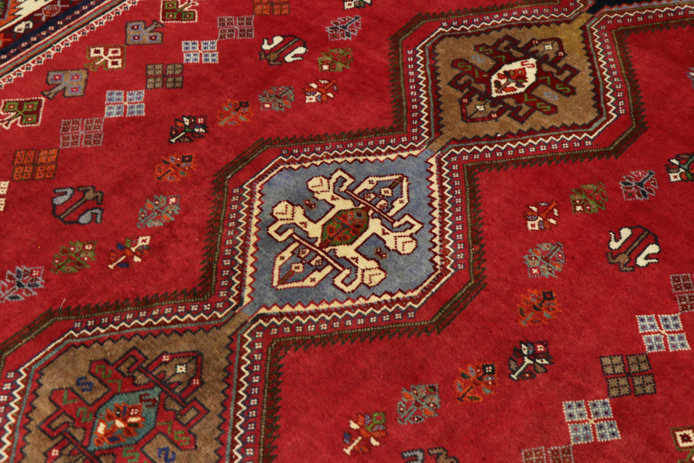 This Persian Ghashghai (Qashqai) rug has been knotted by nomads. Beautiful shades of red, beige and dark blue are characteristic for this type. The rug is handmade and unique. Its colors are natural, dyed in old tradition. The rug's wool comes from sheep of the nomads.