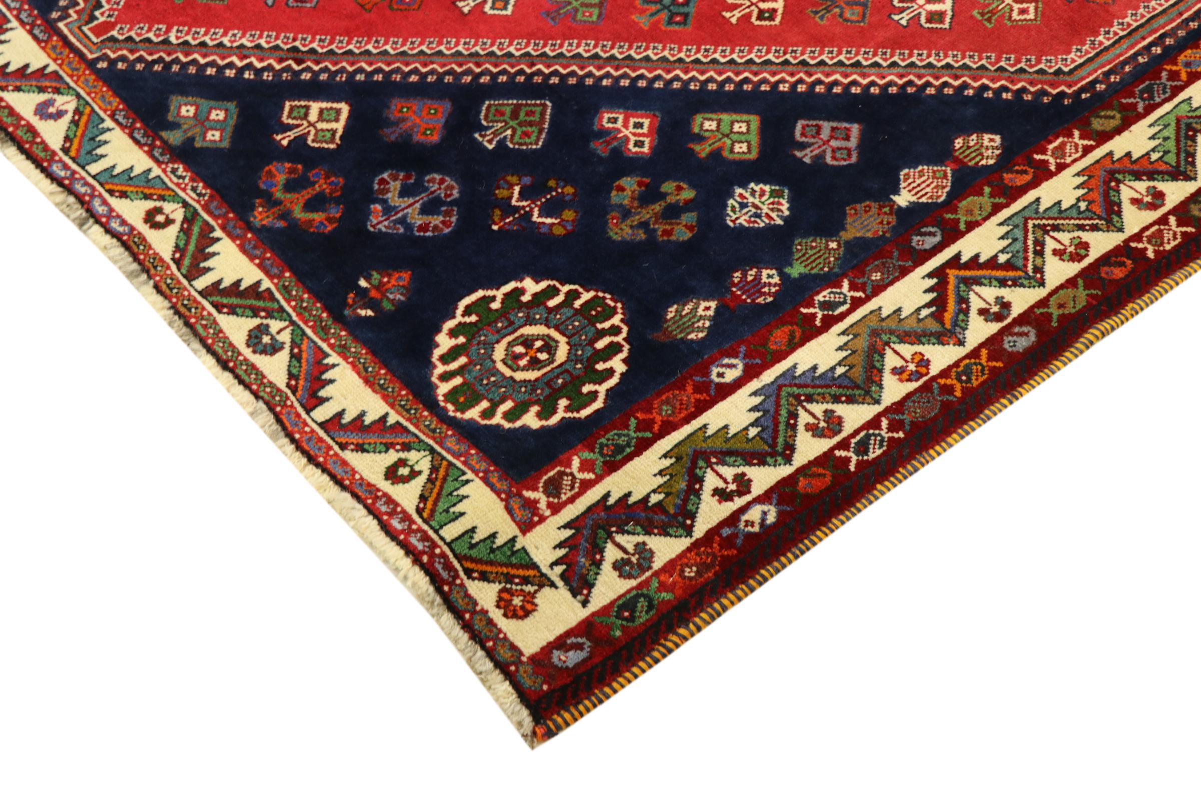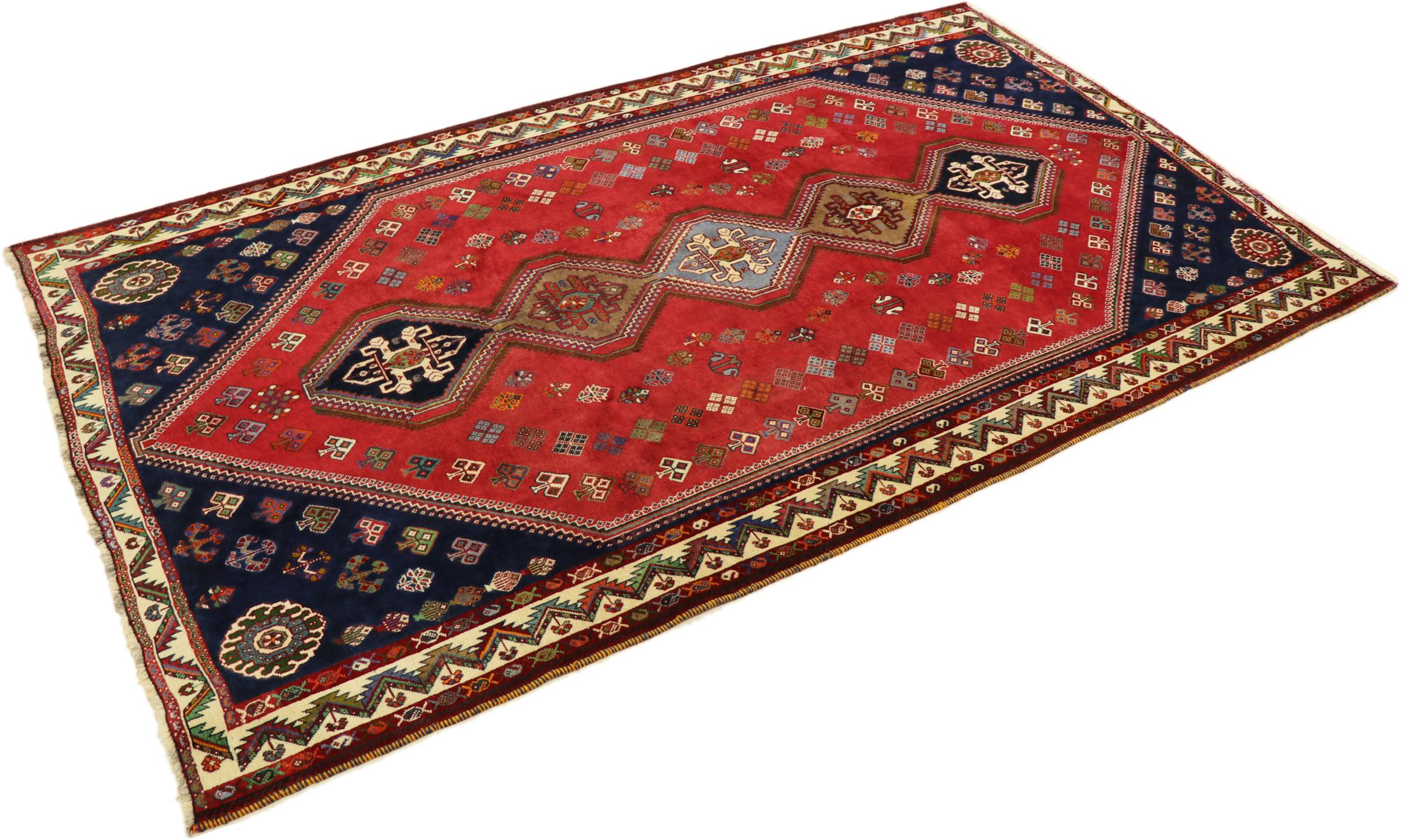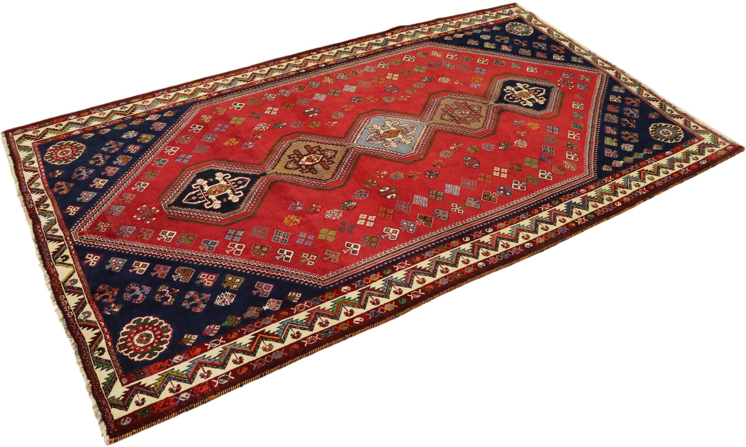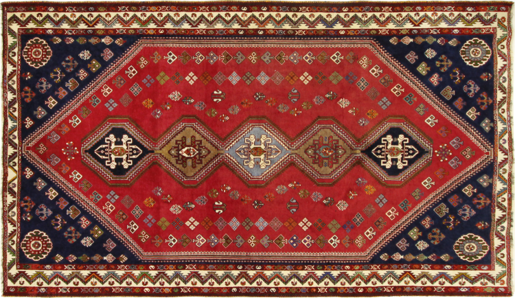 This Persian Ghashghai (Qashqai) rug has been knotted by nomads. Beautiful shades of red, beige and dark blue are characteristic for this type. The rug is handmade and unique. Its colors are natural, dyed in old tradition. The rug's wool comes from sheep of the nomads.