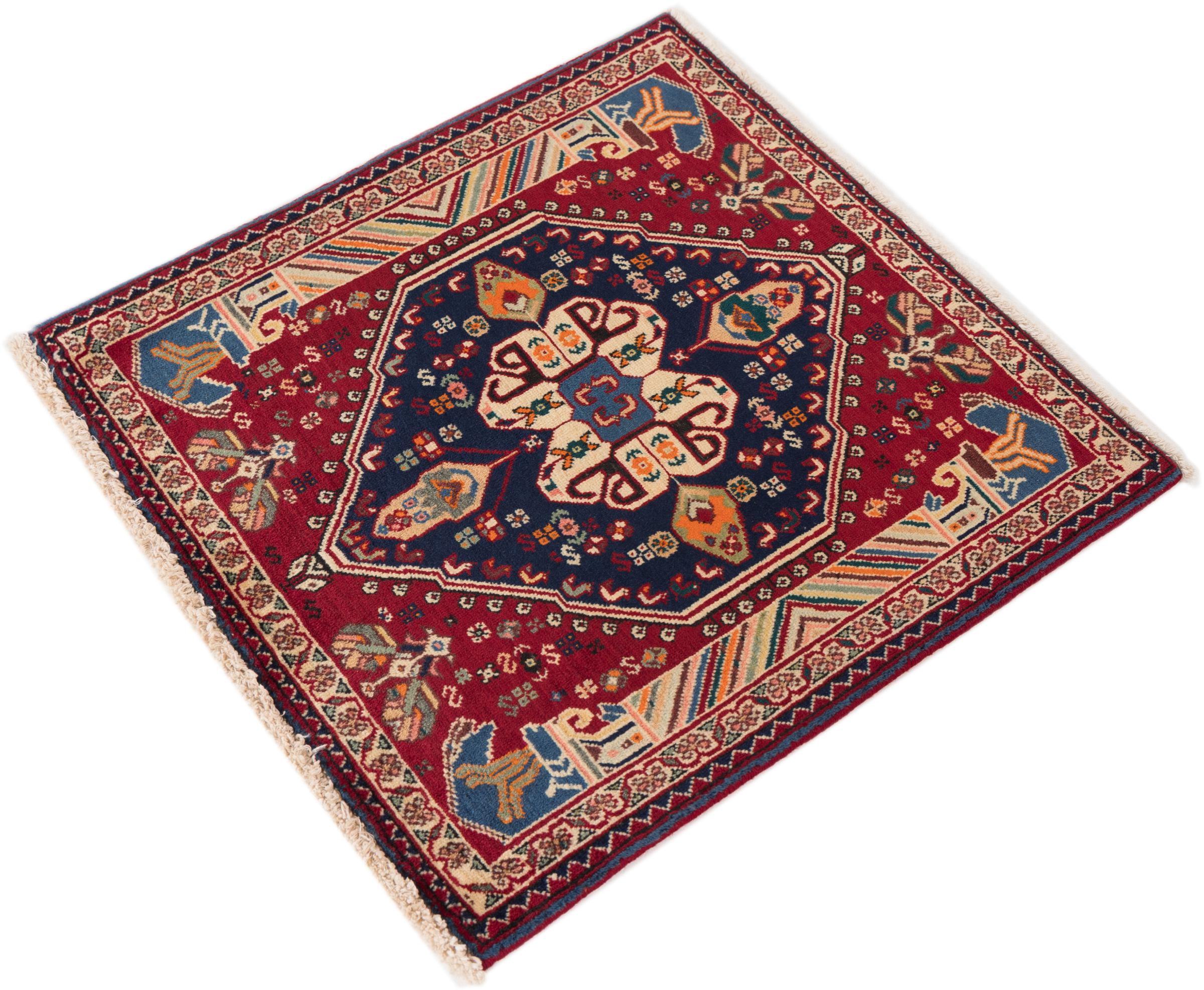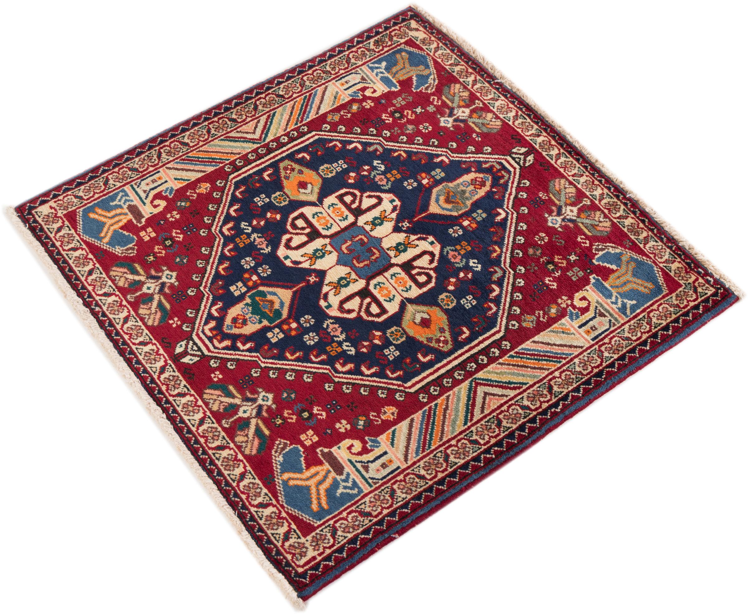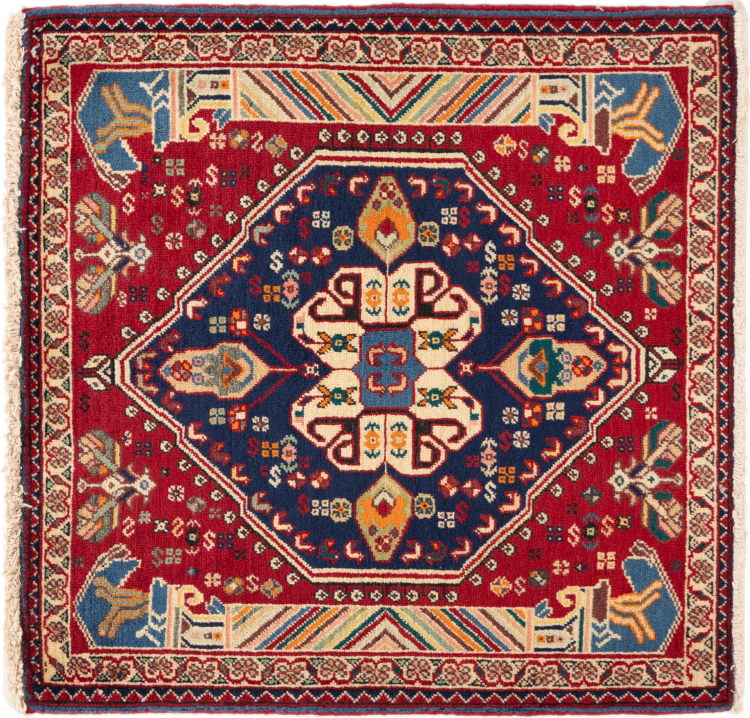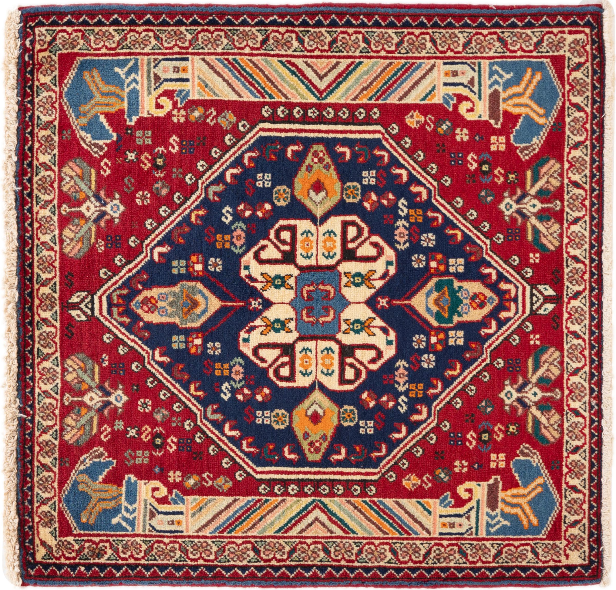 Rug ID: 295587003993 Size: 2'2"x2'1" ft Thickness: ap. 0.47 in Knot density: 129 - 161 / square inch Manufacturing: Knotted by hand Pile: Handspun wool Warp: Cotton Origin: Persia / Iran Age: Old/Semi antique, over 50 years Weight: ap. 2 lb Also know as Qashqai, Gaschgai, Gashghai, Kashgai In stock: Unique - Only 1 in stock