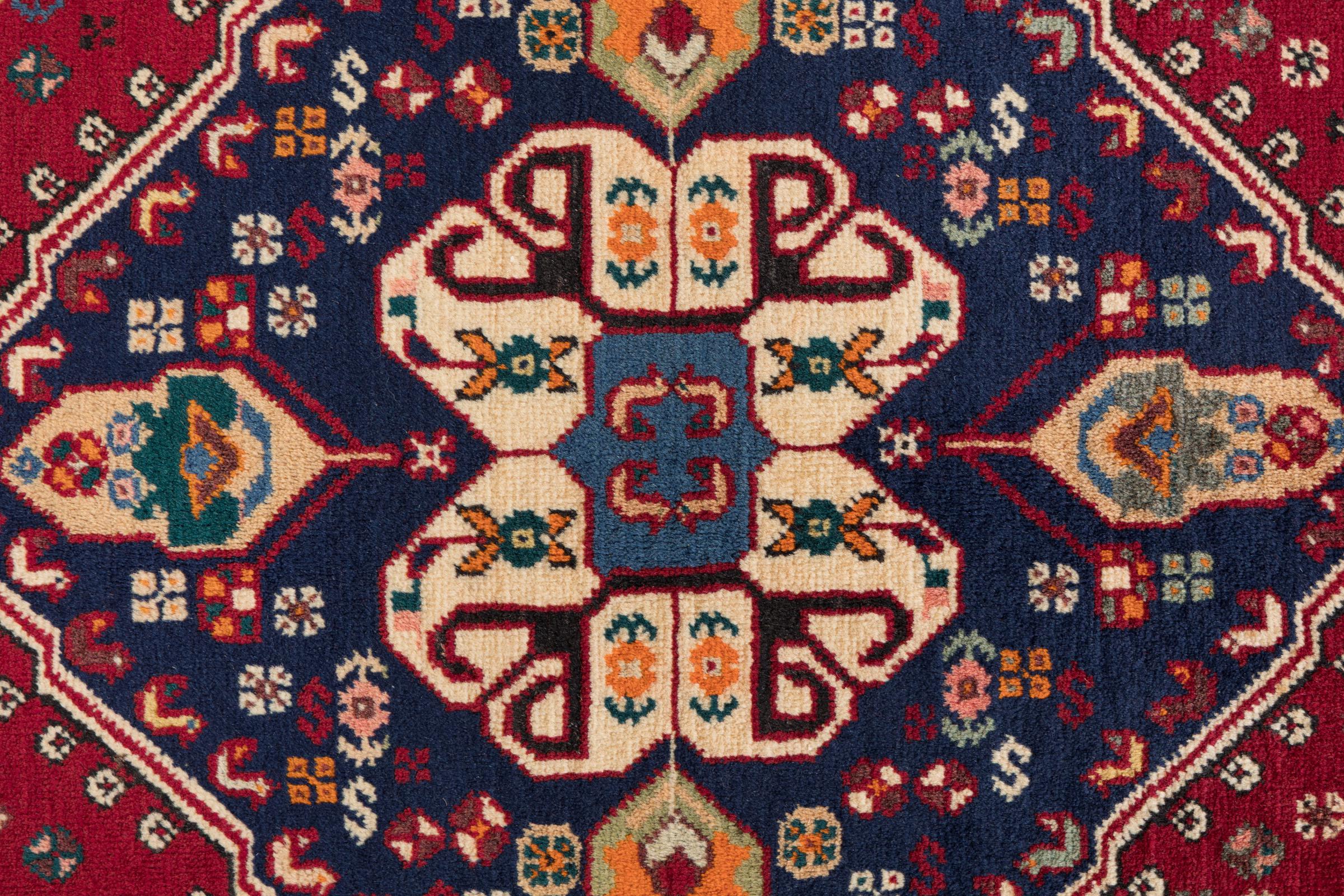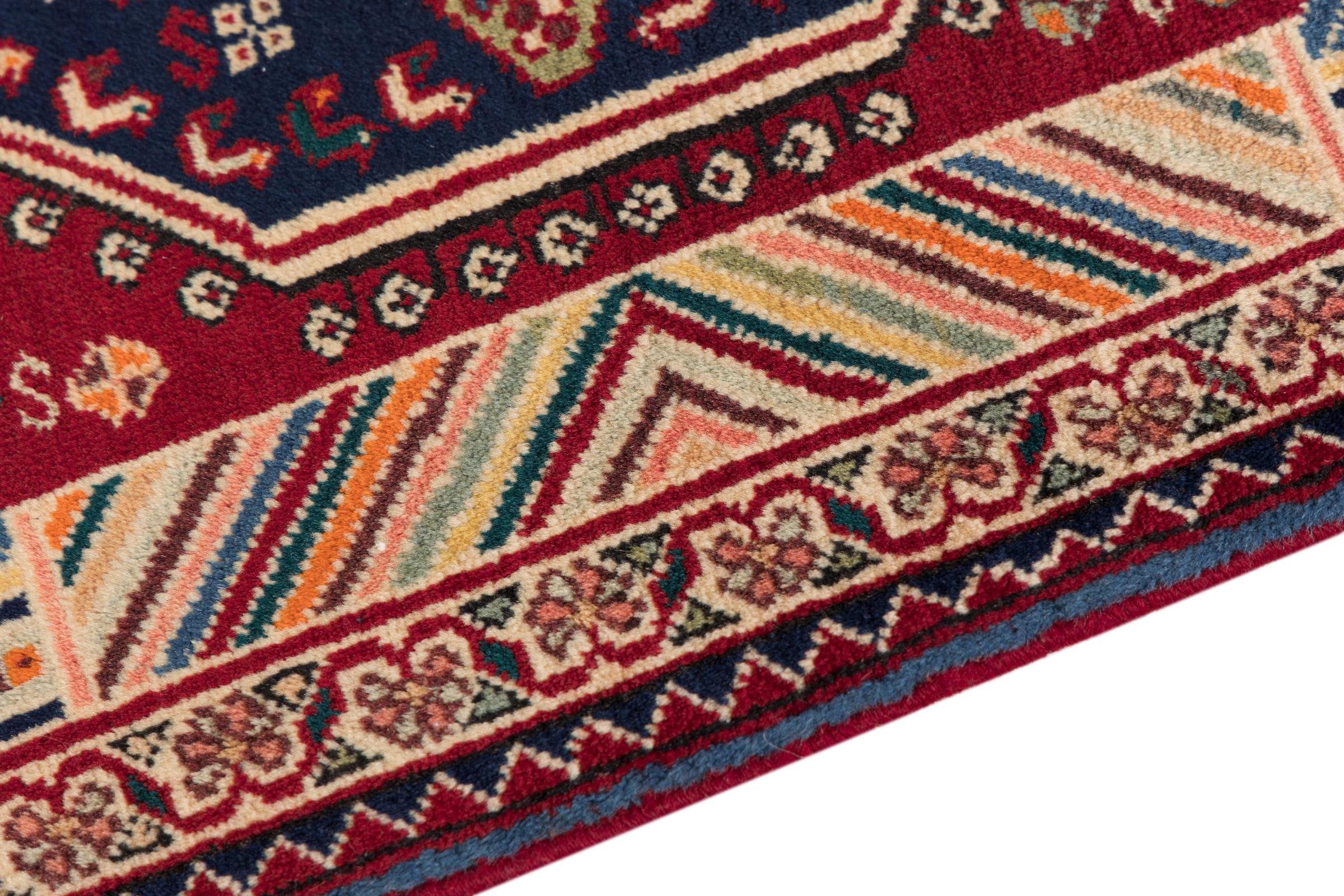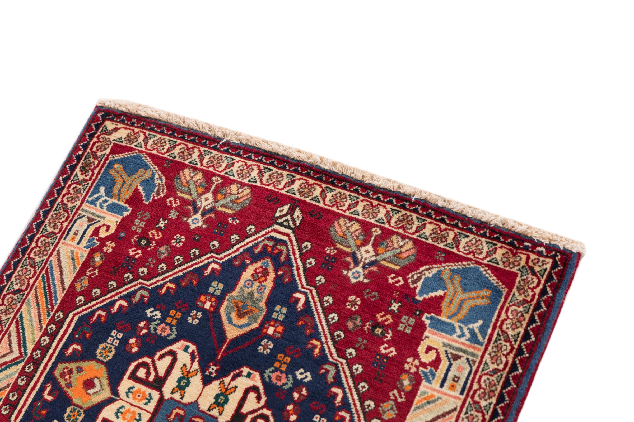 This Persian Ghashghai (Qashqai) rug has been knotted by nomads. Beautiful shades of red, beige and dark blue are characteristic for this type. The rug is handmade and unique. Its colors are natural, dyed in old tradition. The rug's wool comes from sheep of the nomads.