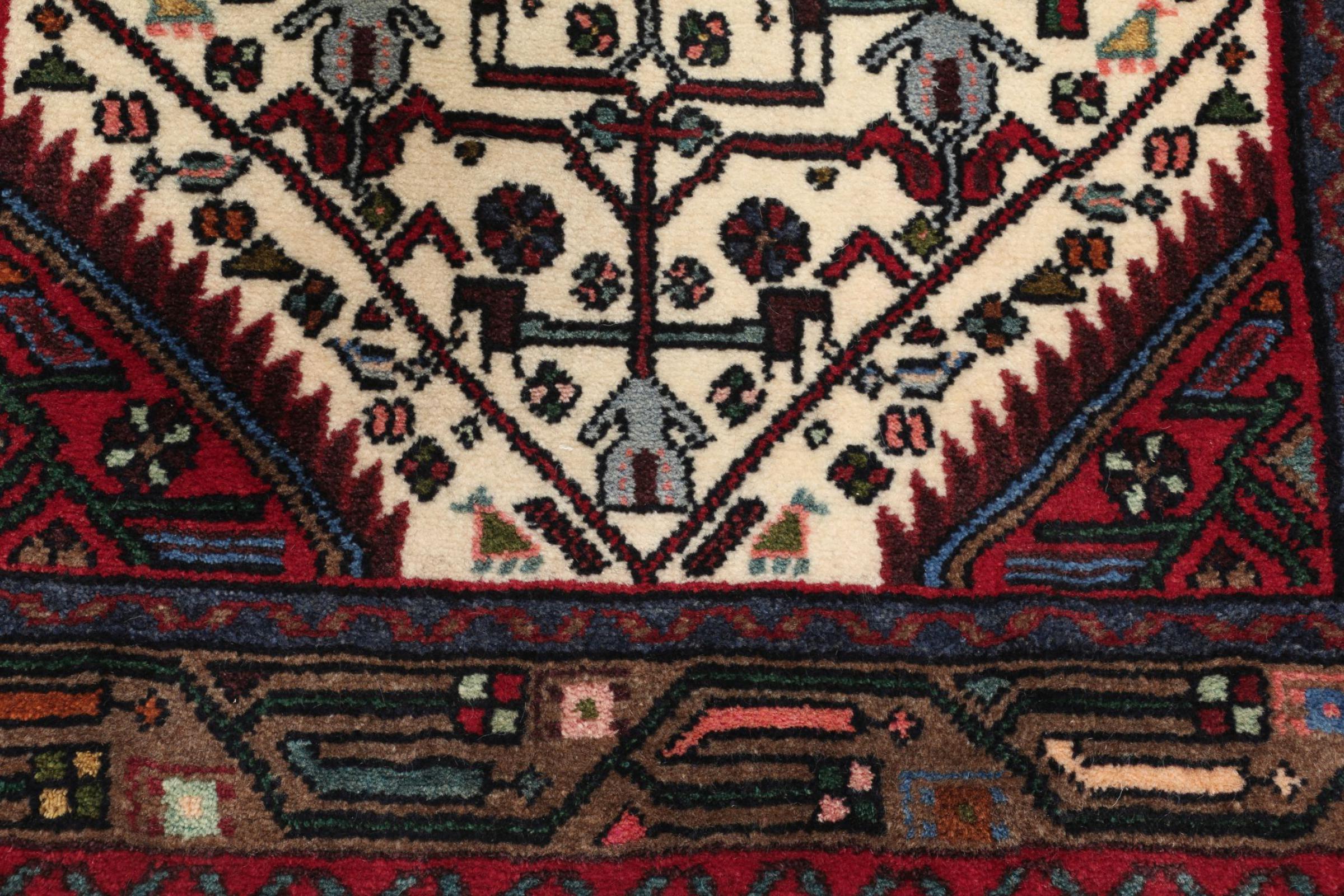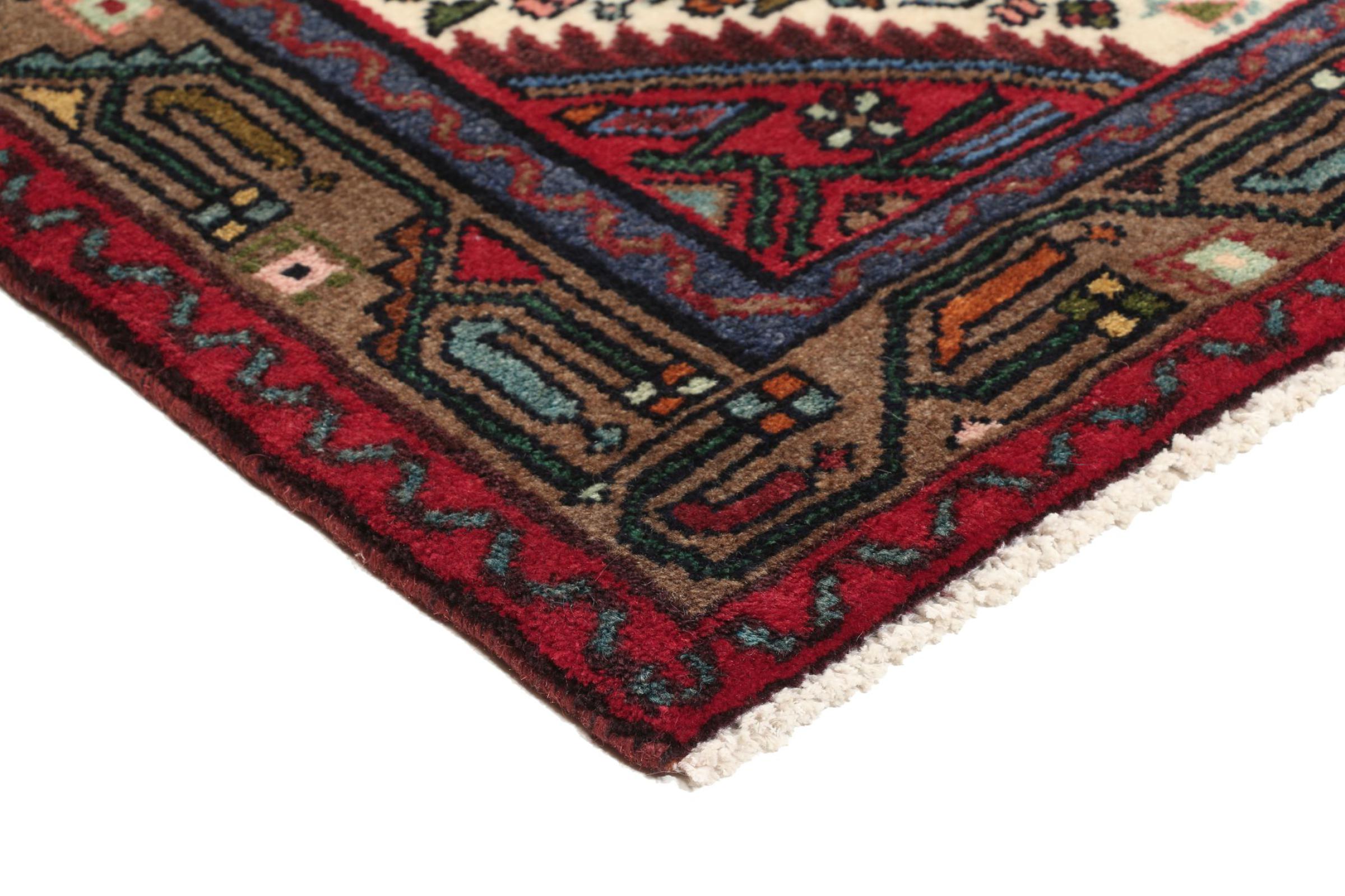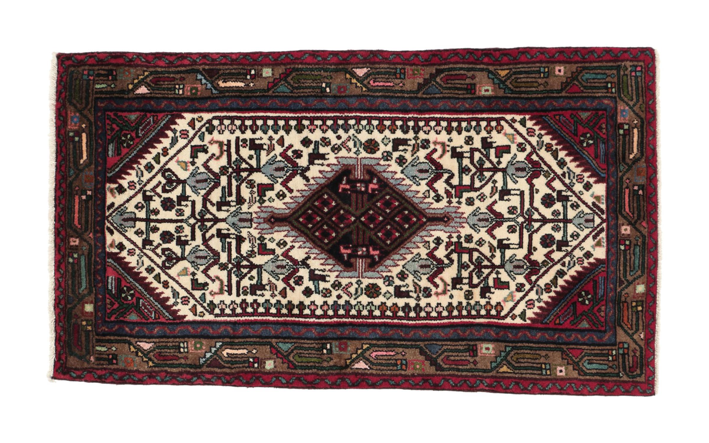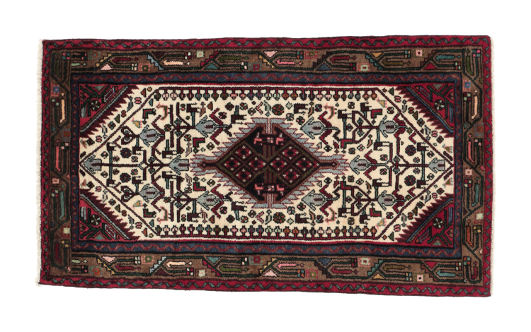 This Persian rug from Hamadan possesses typical geometric patterns with beautiful shades of red, brown and blue. It has been knotted by hand in the small town Hamadan in Persia. This rug is extremely robust and durable.