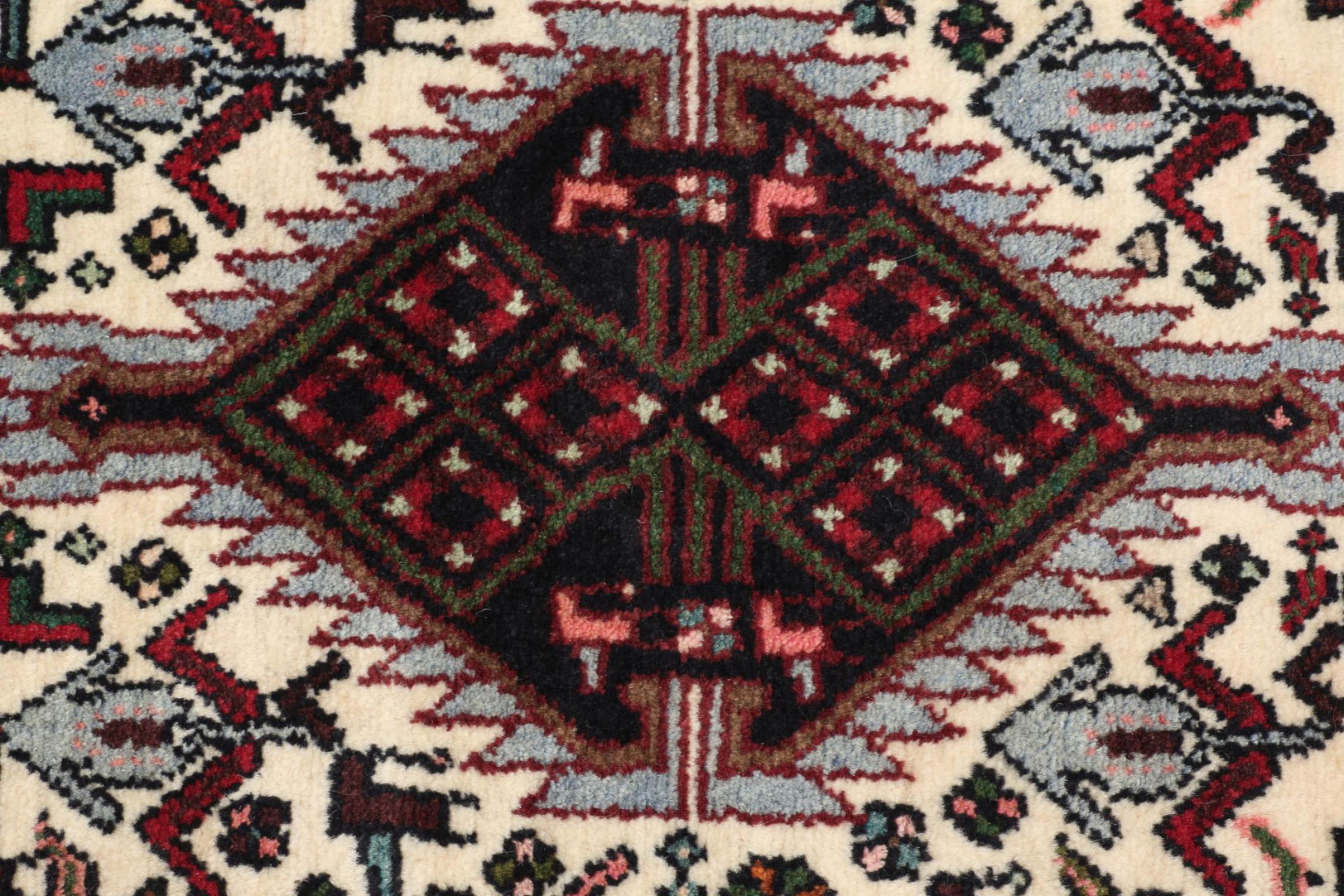 This carpet belongs to the village and nomadic carpets from Iran, the former Persia. This kind of carpets is hand knotted in smaller towns and villages in ancient tradition. Even nomads still knot Persian carpets in the open air. The carpets are knotted without a draft and entirely from memory. They are characterized by classical ornaments arranged in linear and geometric patterns. Thanks to their cultural and traditional origins, these rugs possess a unique character that embodies ancient Persia.