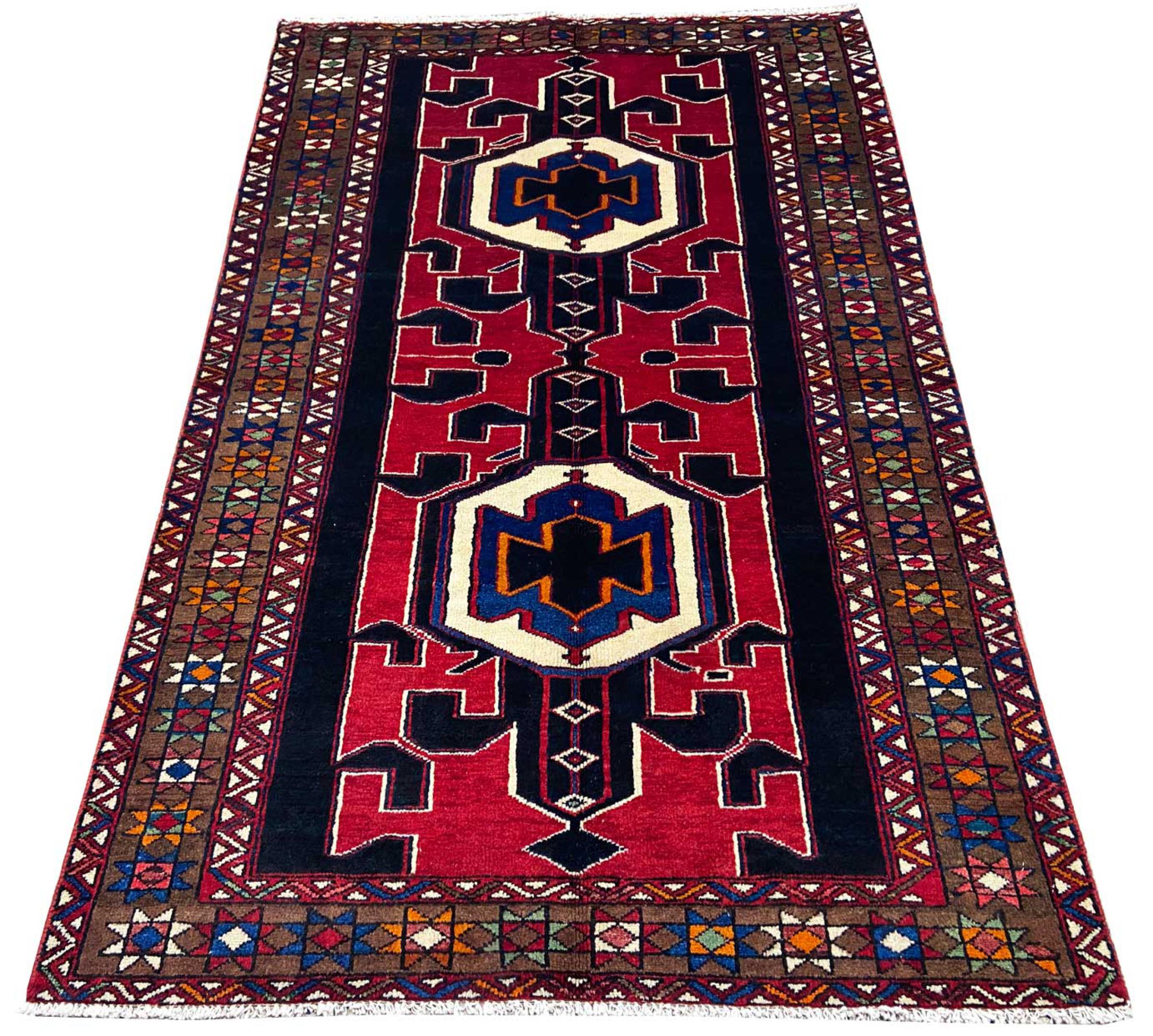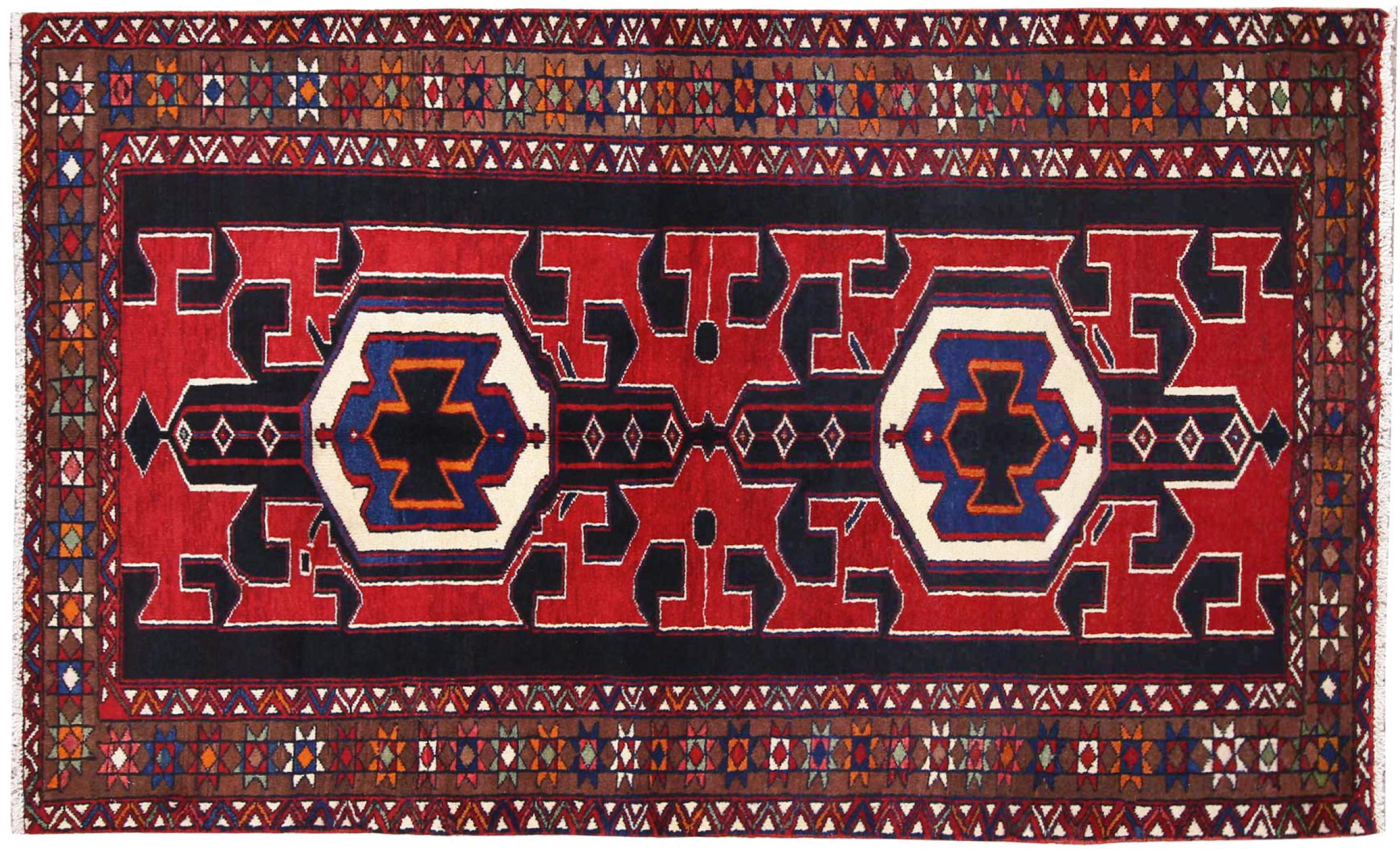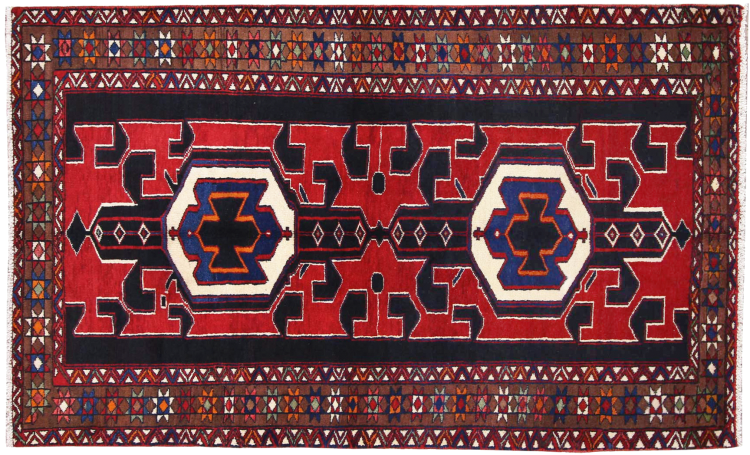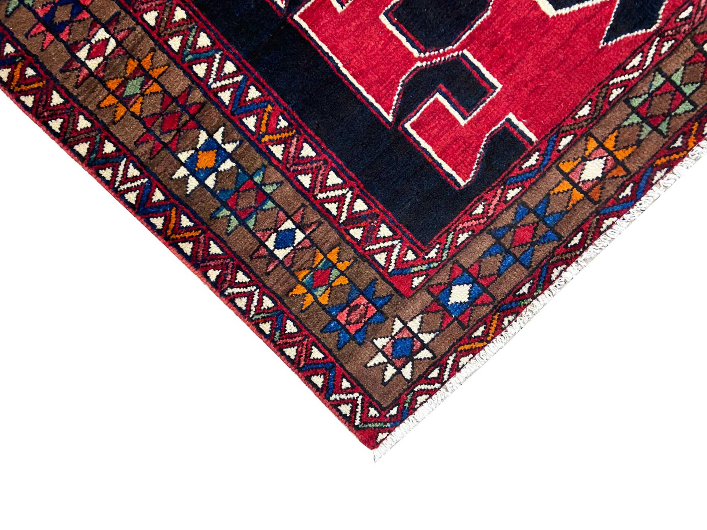 This Persian rug from Hamadan possesses typical geometric patterns with beautiful shades of red, brown and blue. It has been knotted by hand in the small town Hamadan in Persia. This rug is extremely robust and durable.