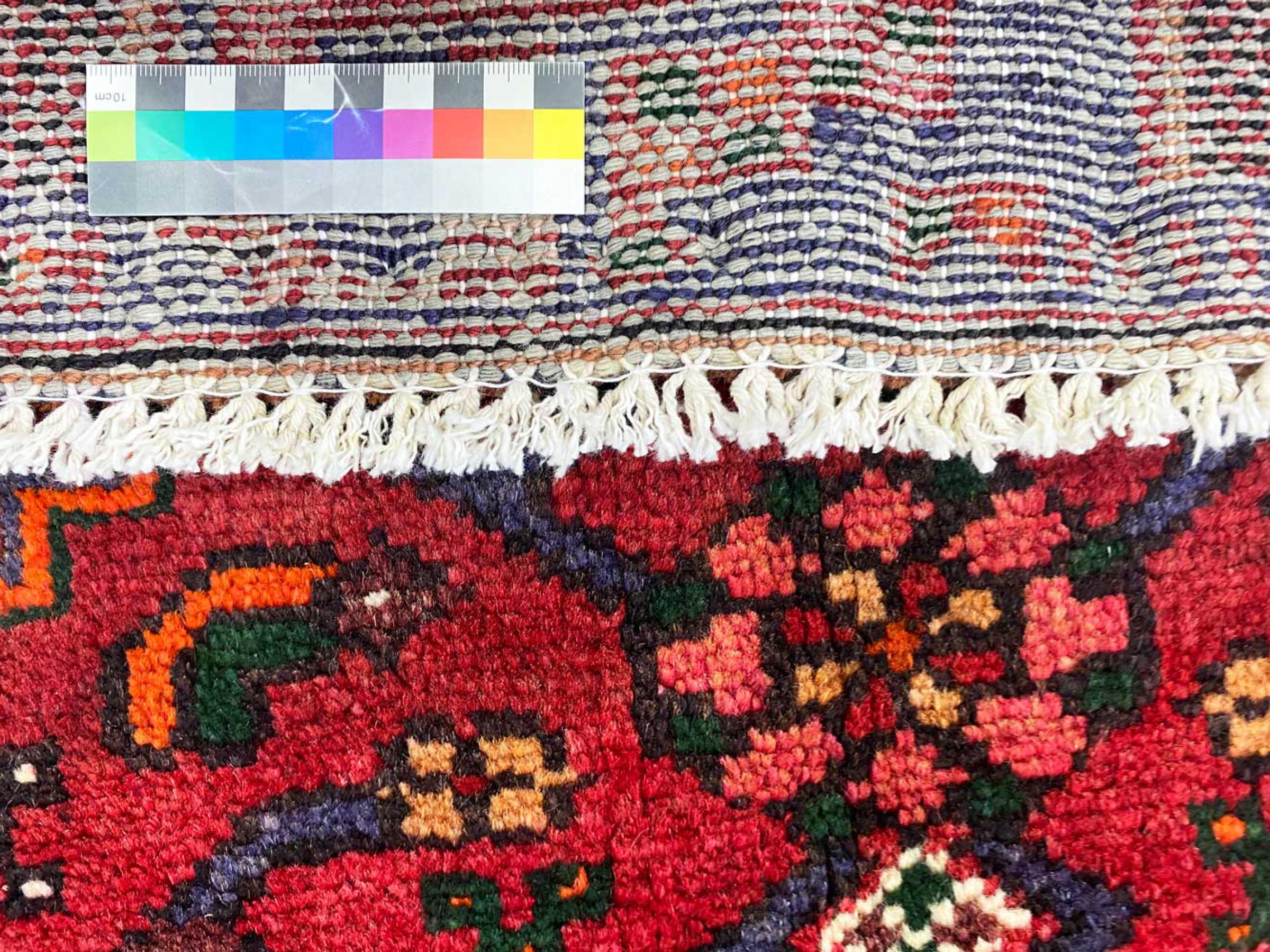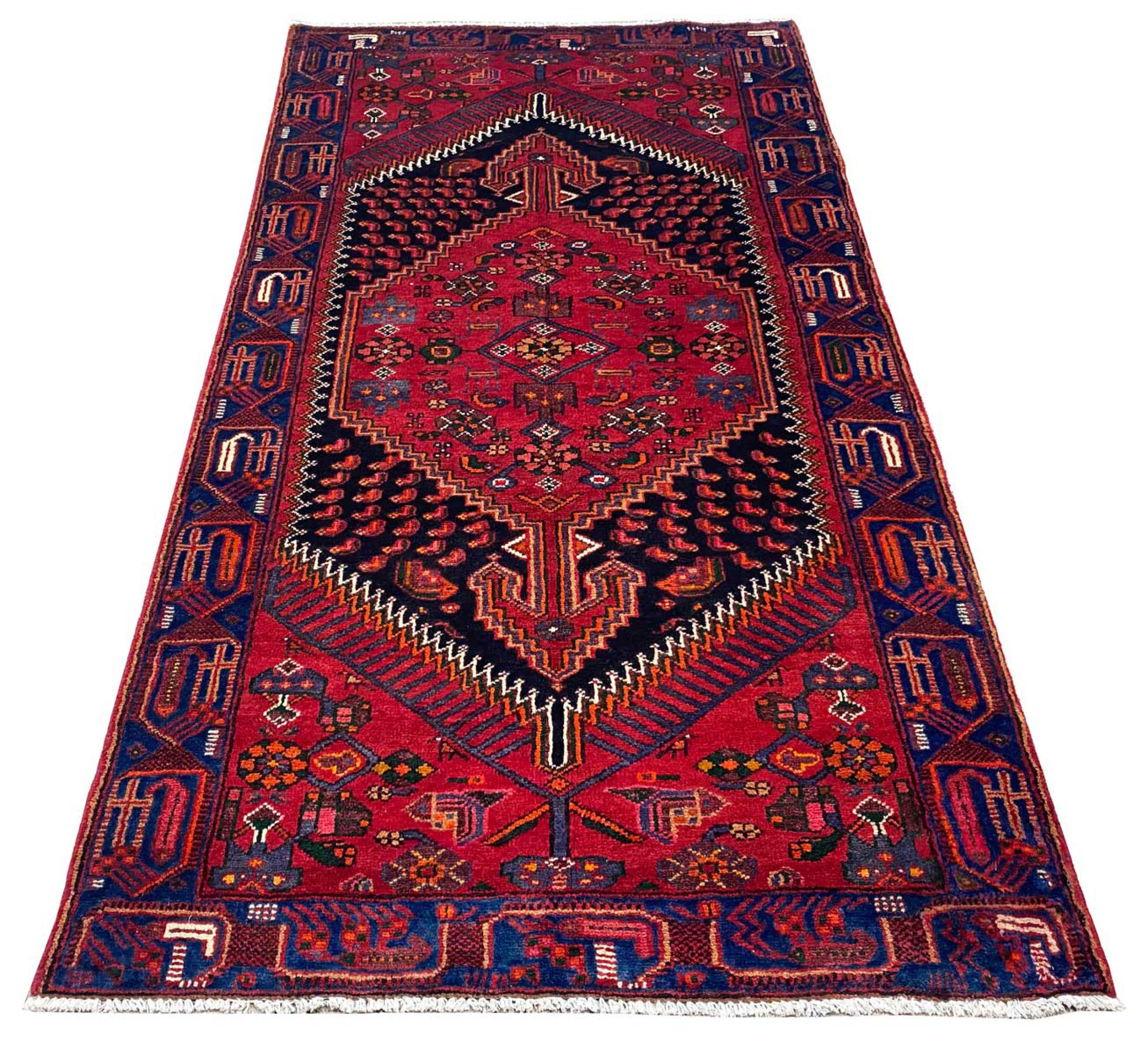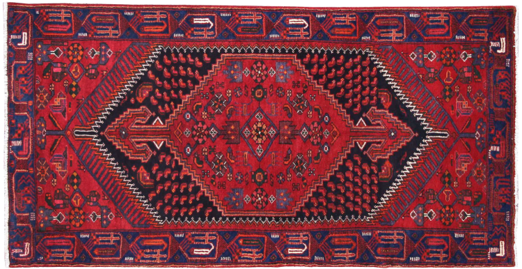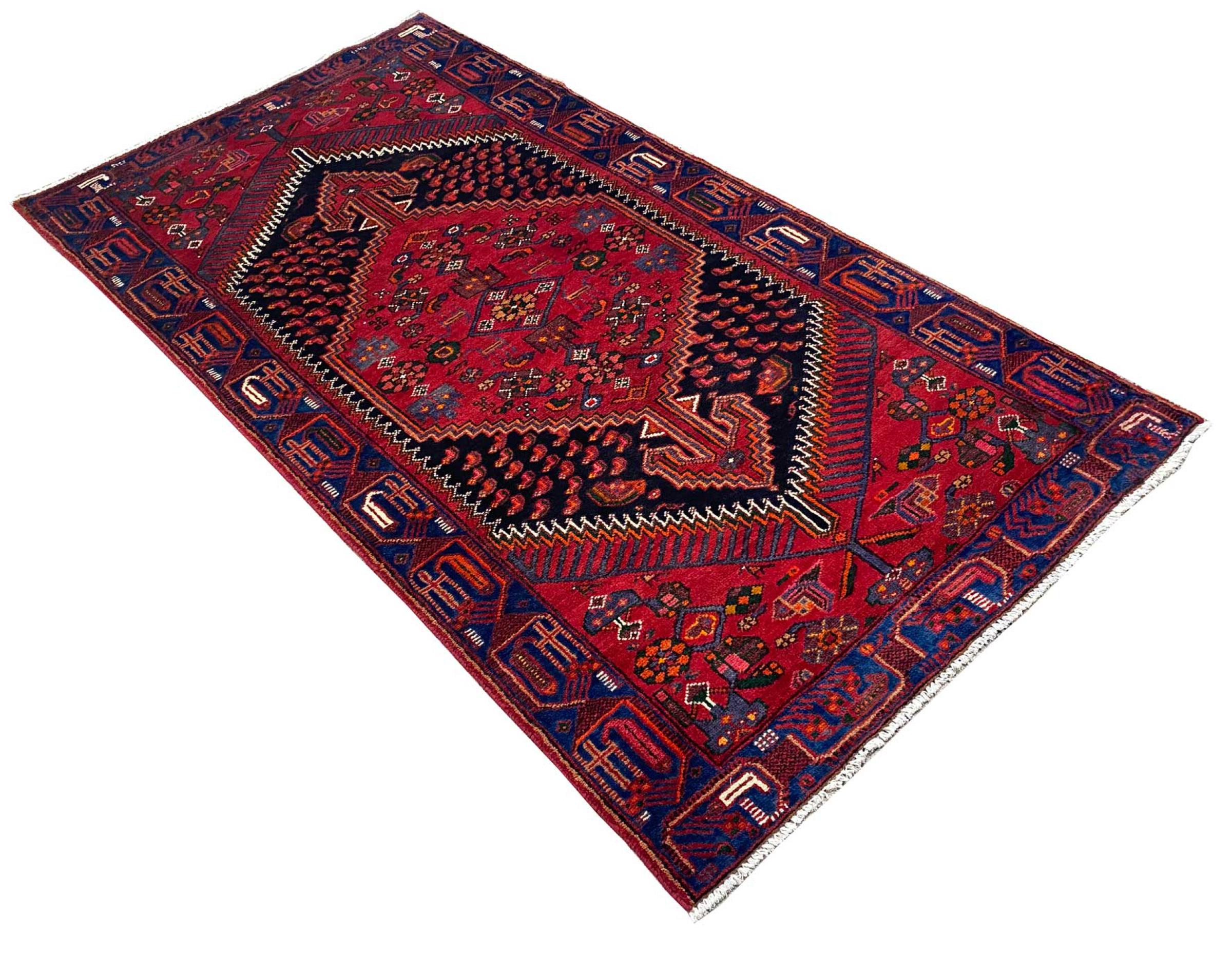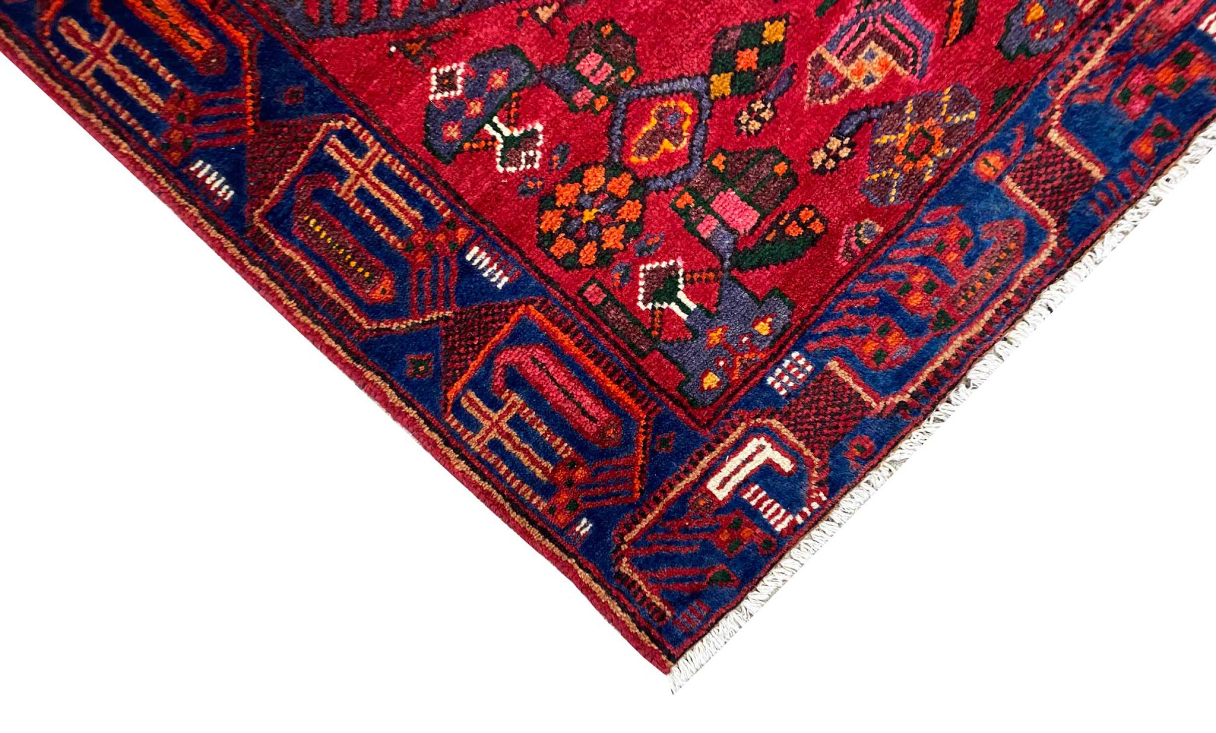 This Persian rug from Hamadan possesses typical geometric patterns with beautiful shades of red, brown and blue. It has been knotted by hand in the small town Hamadan in Persia. This rug is extremely robust and durable.