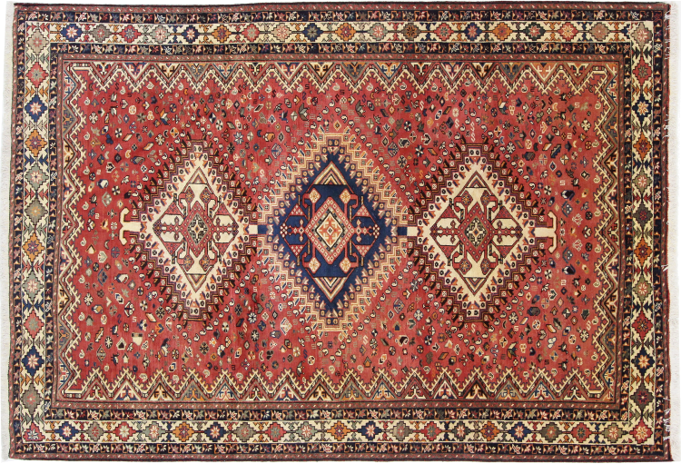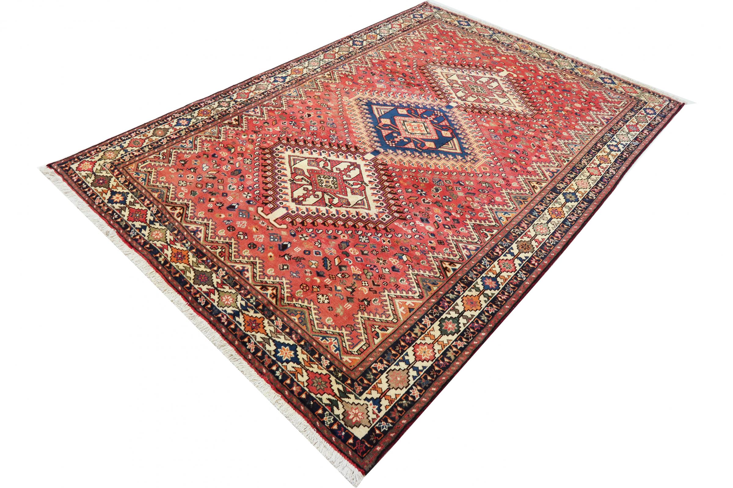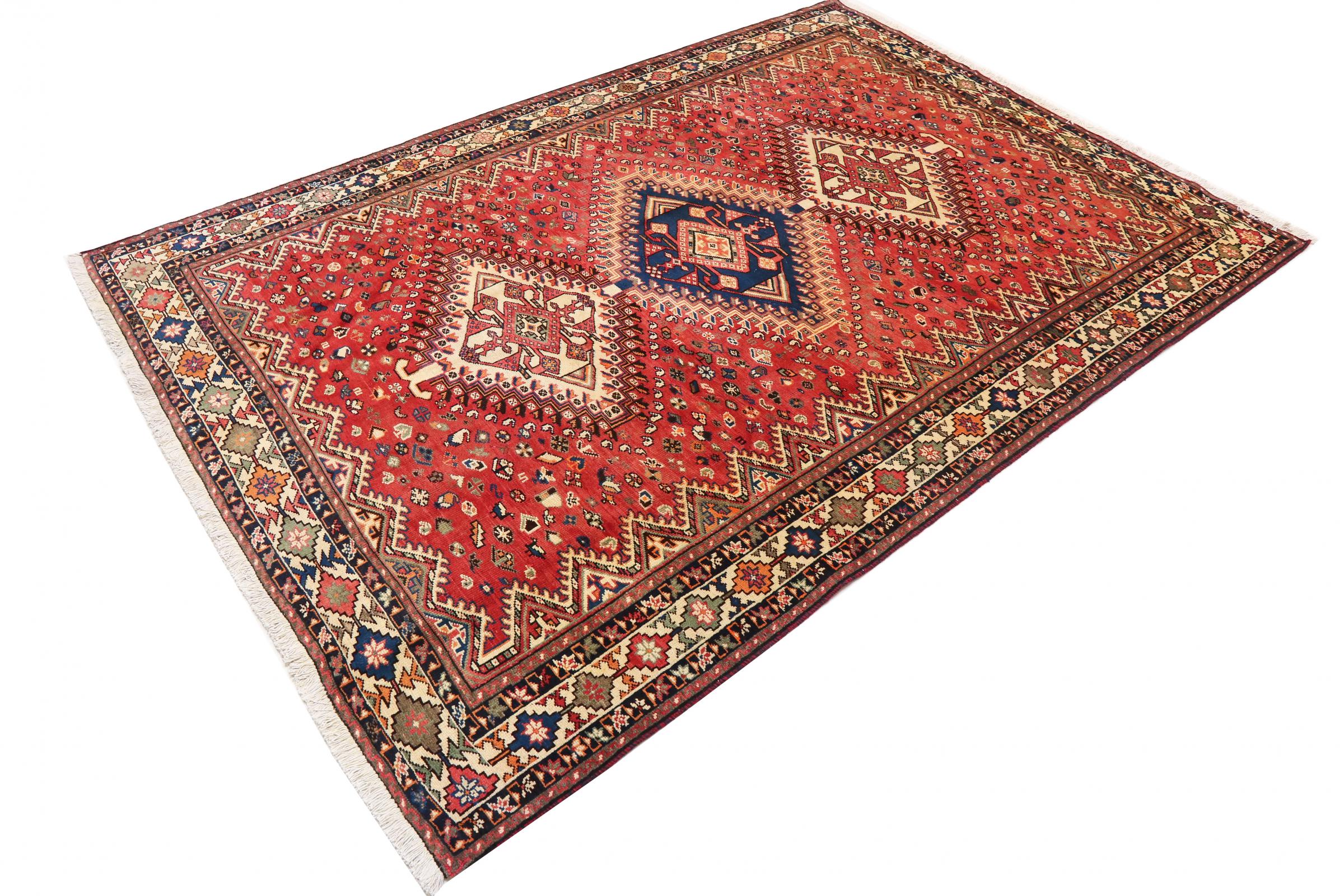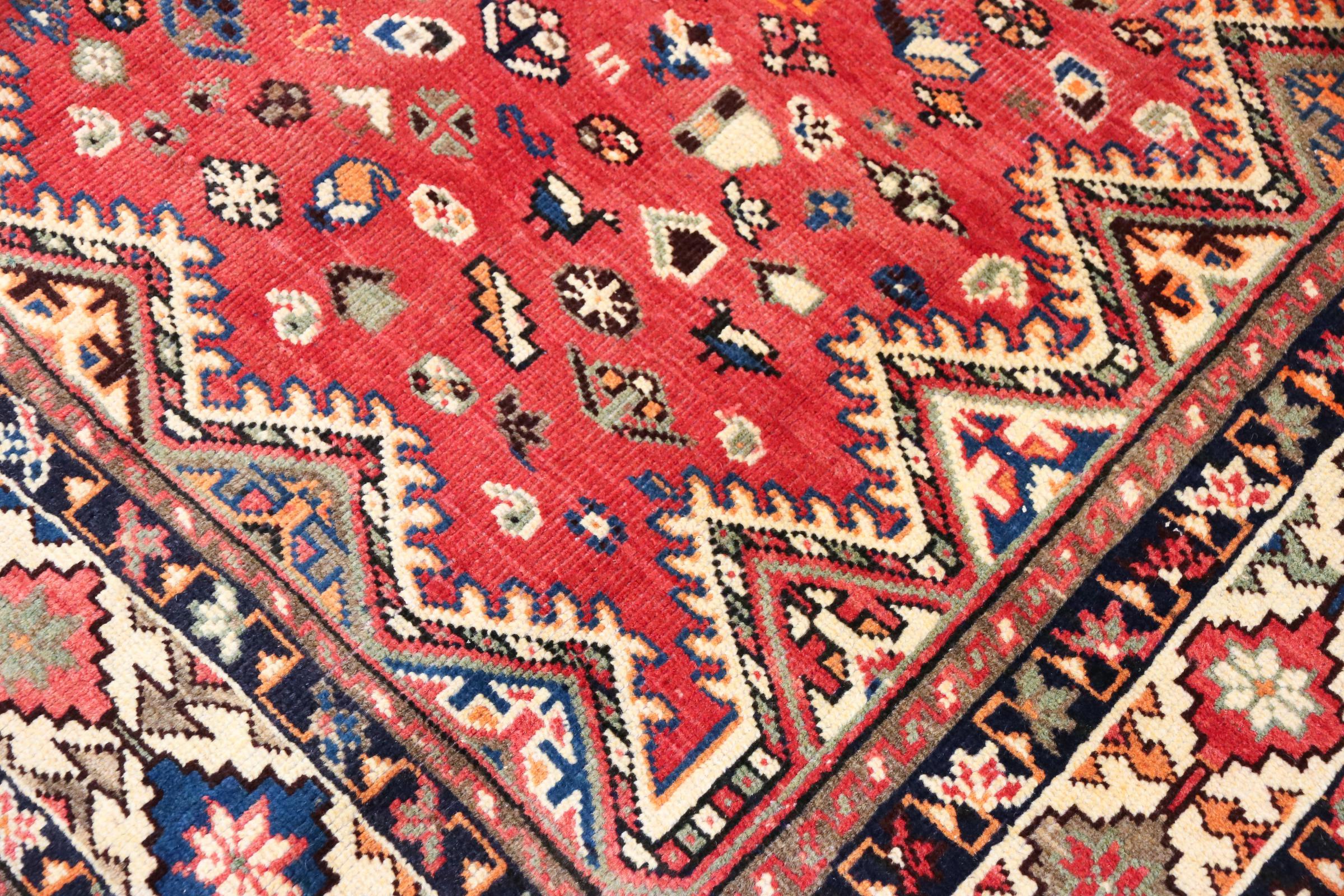 This carpet belongs to the village and nomadic carpets from Iran, the former Persia. This kind of carpets is hand knotted in smaller towns and villages in ancient tradition. Even nomads still knot Persian carpets in the open air. The carpets are knotted without a draft and entirely from memory. They are characterized by classical ornaments arranged in linear and geometric patterns. Thanks to their cultural and traditional origins, these rugs possess a unique character that embodies ancient Persia.