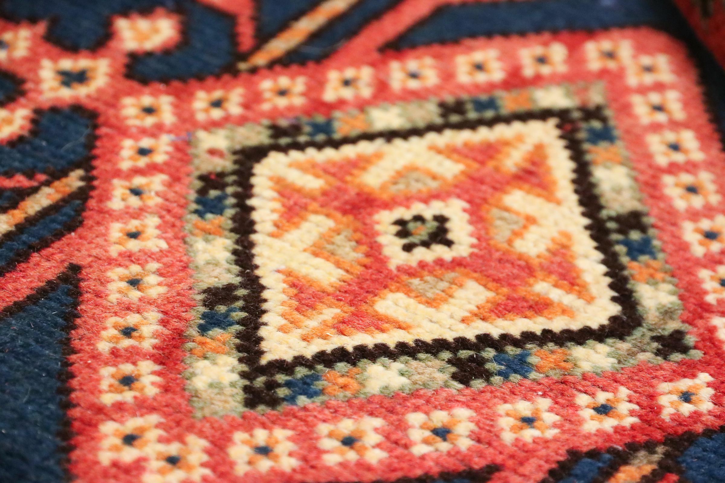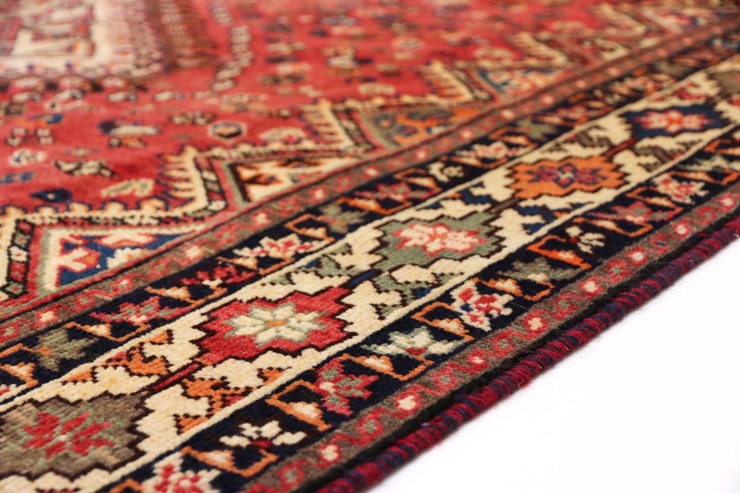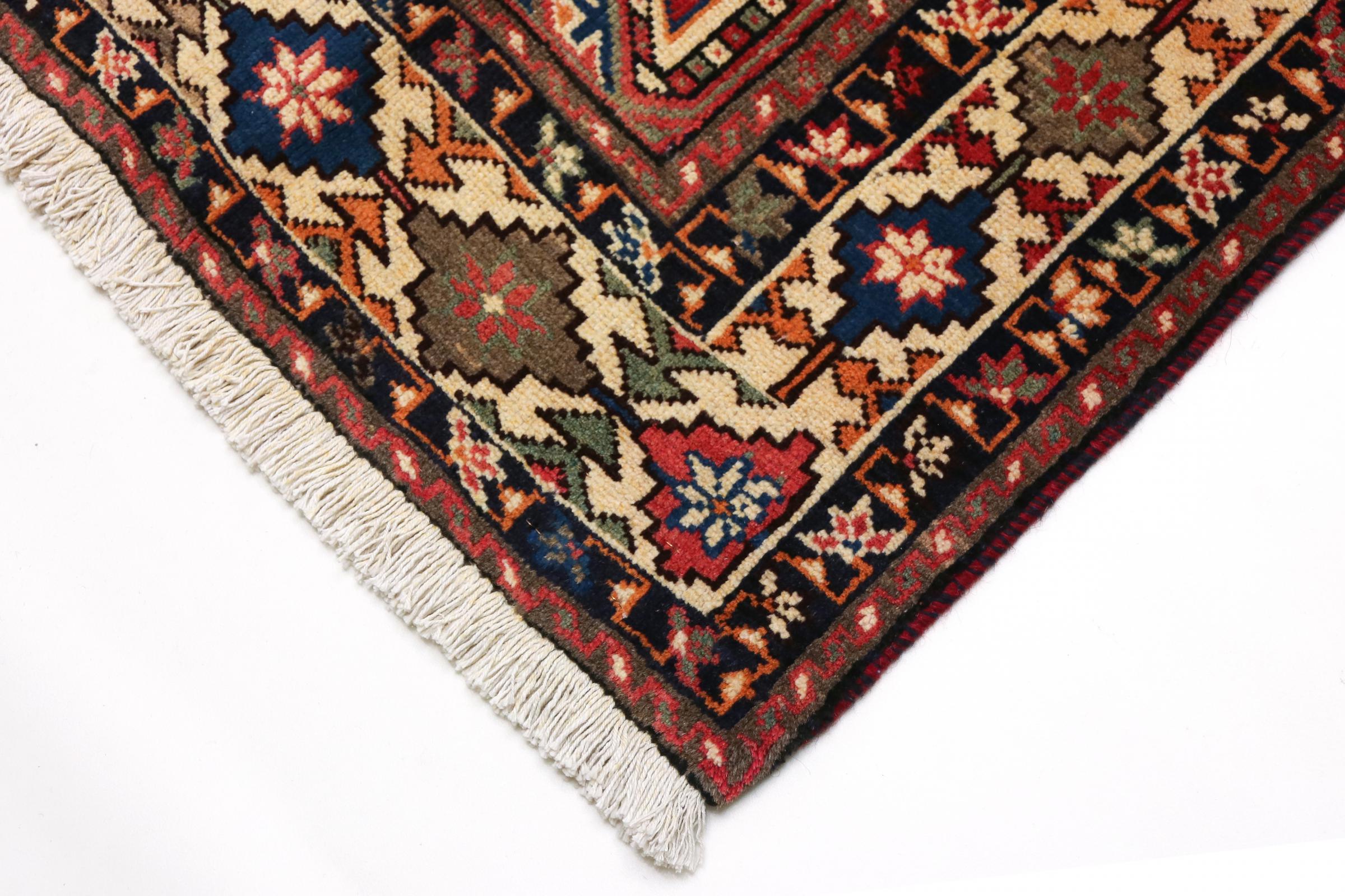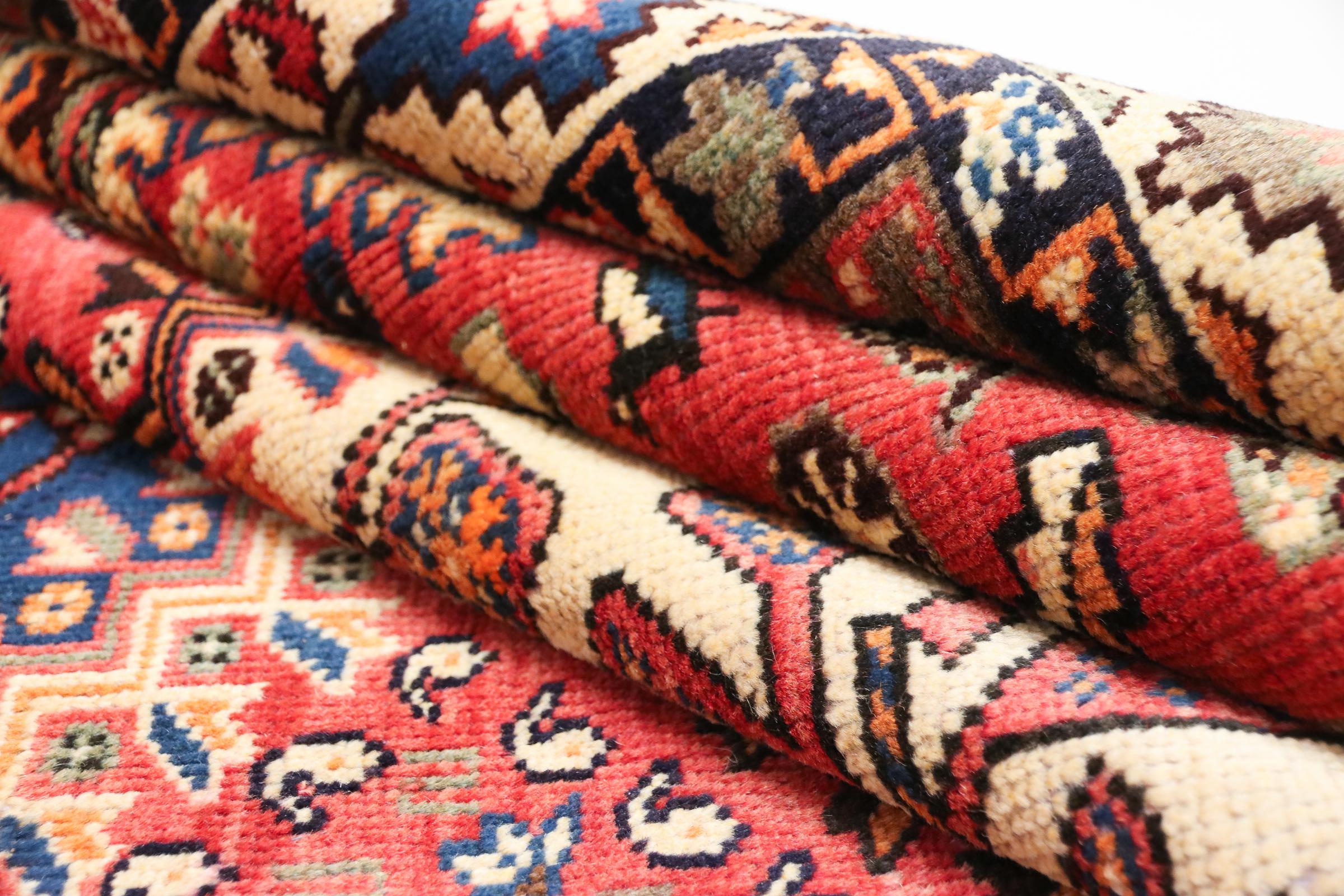 This Persian rug from Hamadan possesses typical geometric patterns with beautiful shades of red, brown and blue. It has been knotted by hand in the small town Hamadan in Persia. This rug is extremely robust and durable.