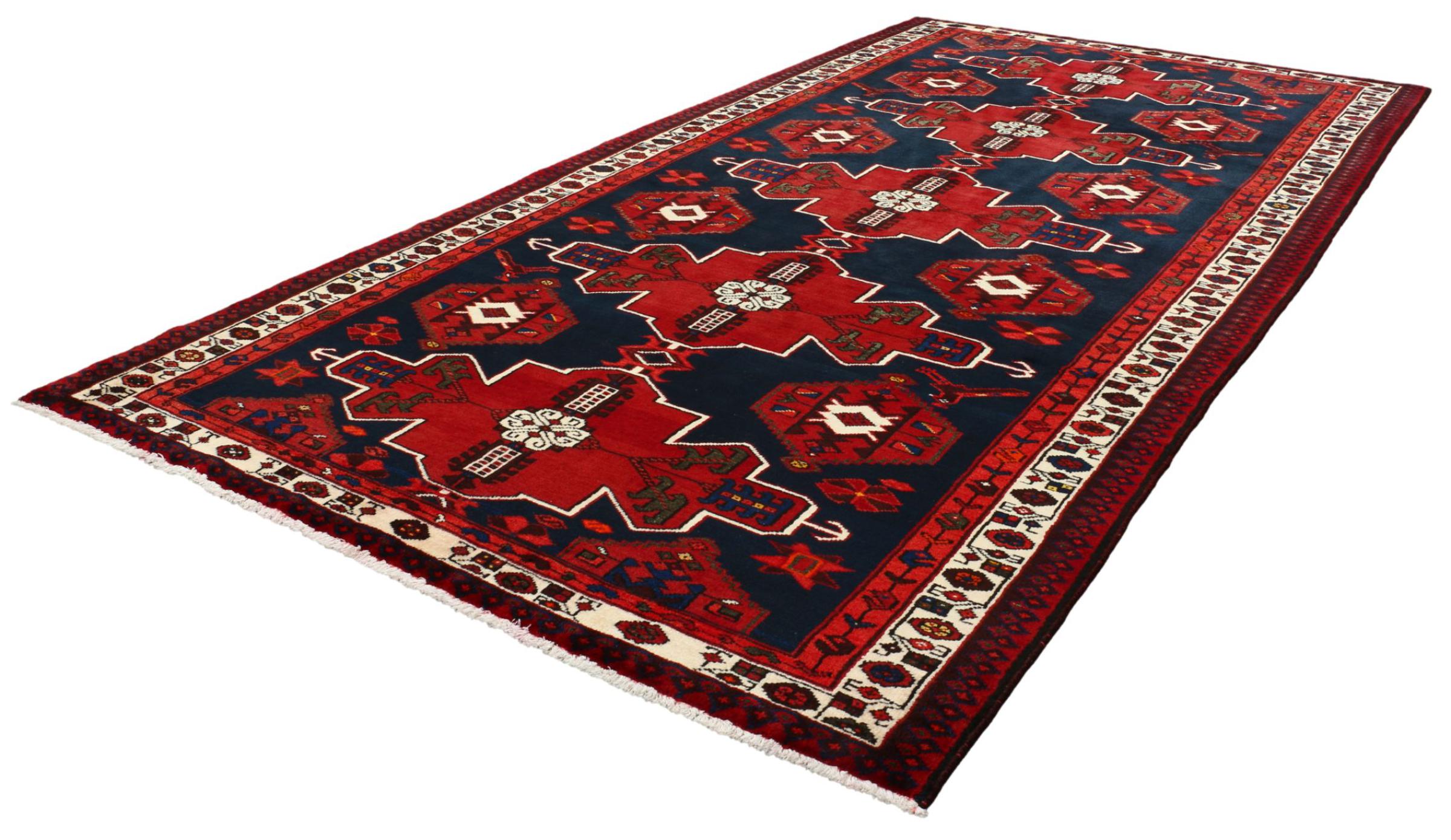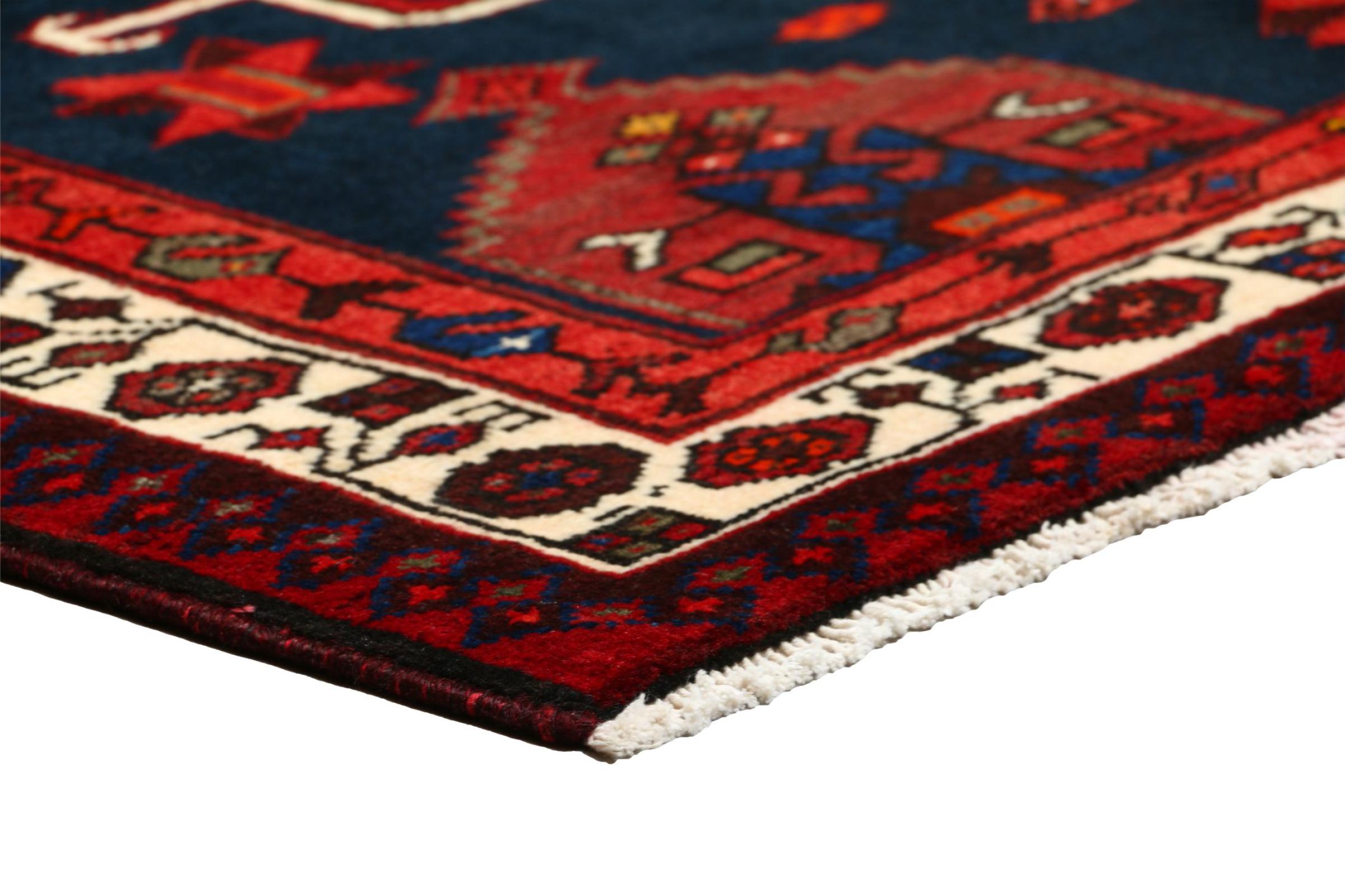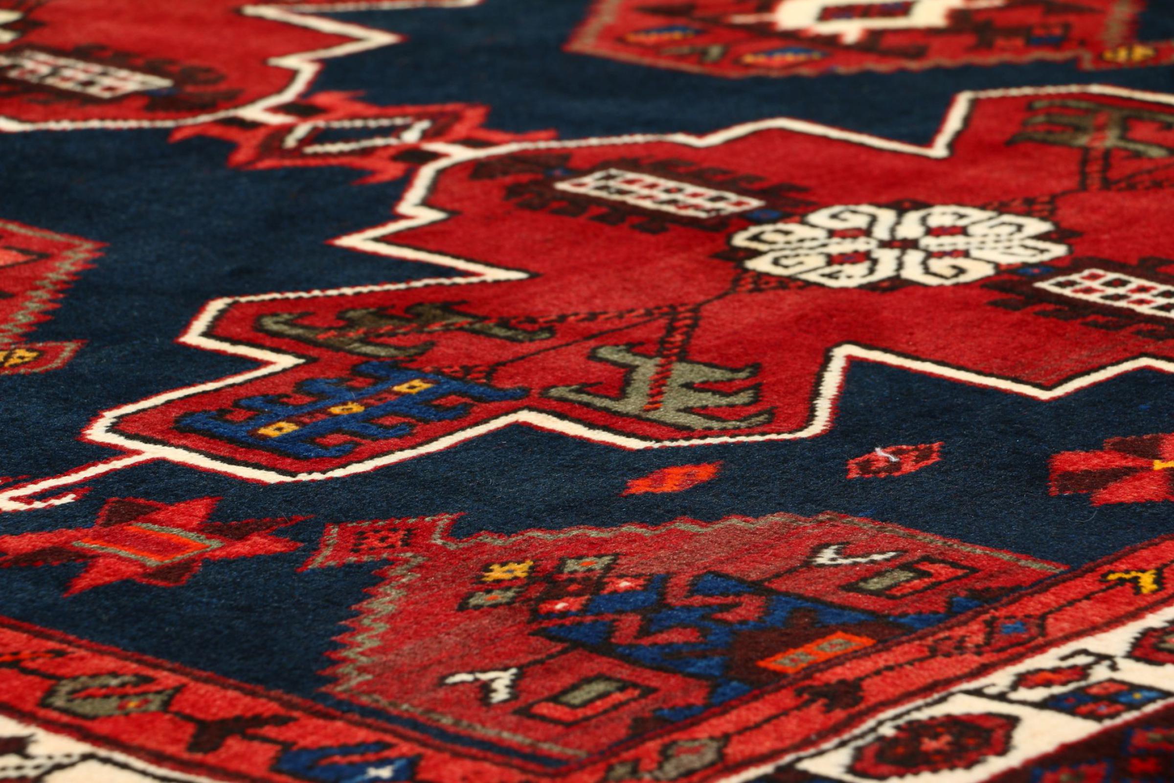 This Persian rug from Hamadan possesses typical geometric patterns with beautiful shades of red, brown and blue. It has been knotted by hand in the small town Hamadan in Persia. This rug is extremely robust and durable.