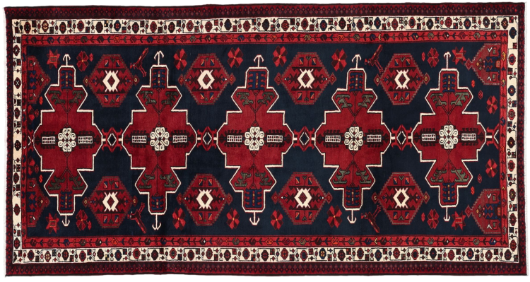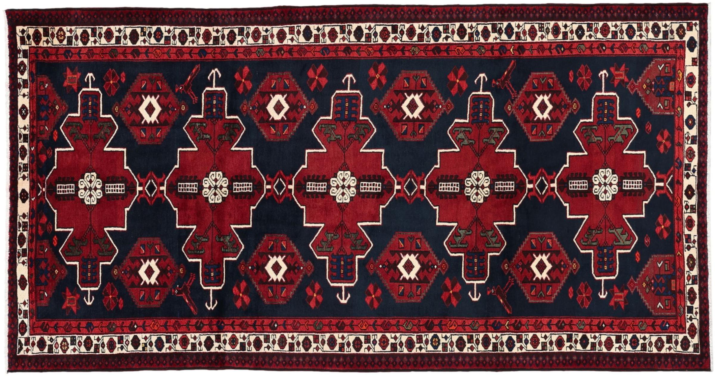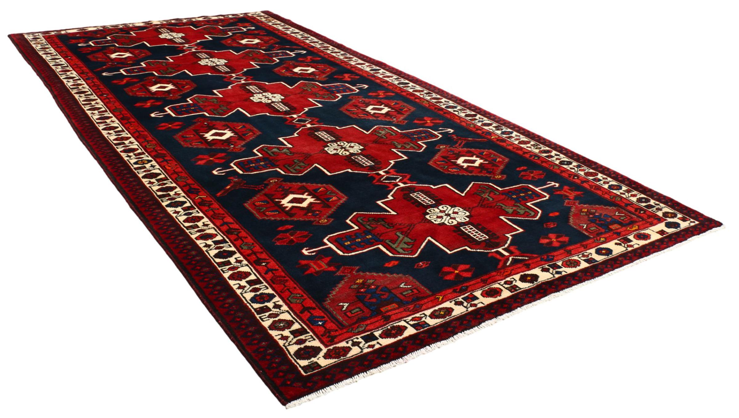 This Persian rug from Hamadan possesses typical geometric patterns with beautiful shades of red, brown and blue. It has been knotted by hand in the small town Hamadan in Persia. This rug is extremely robust and durable.