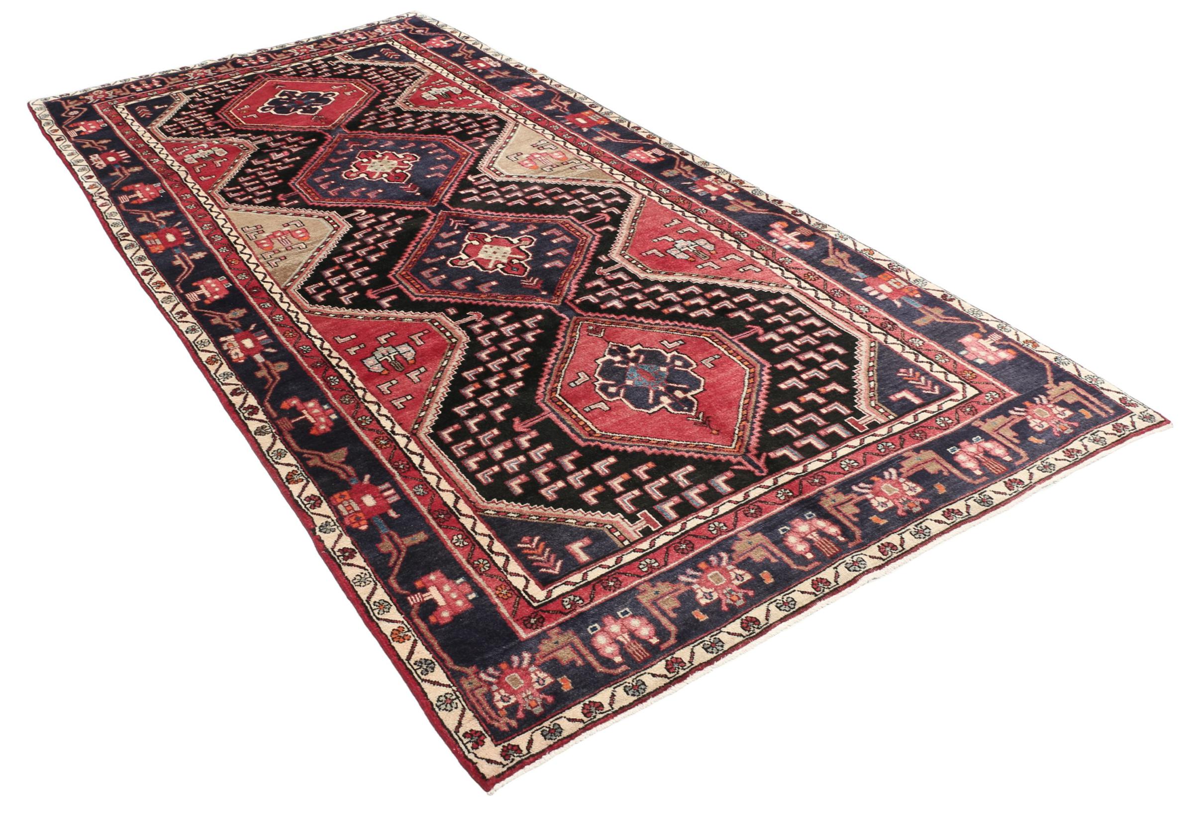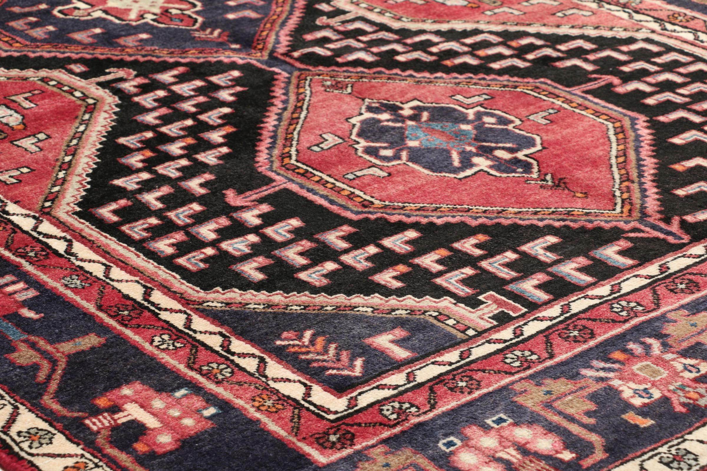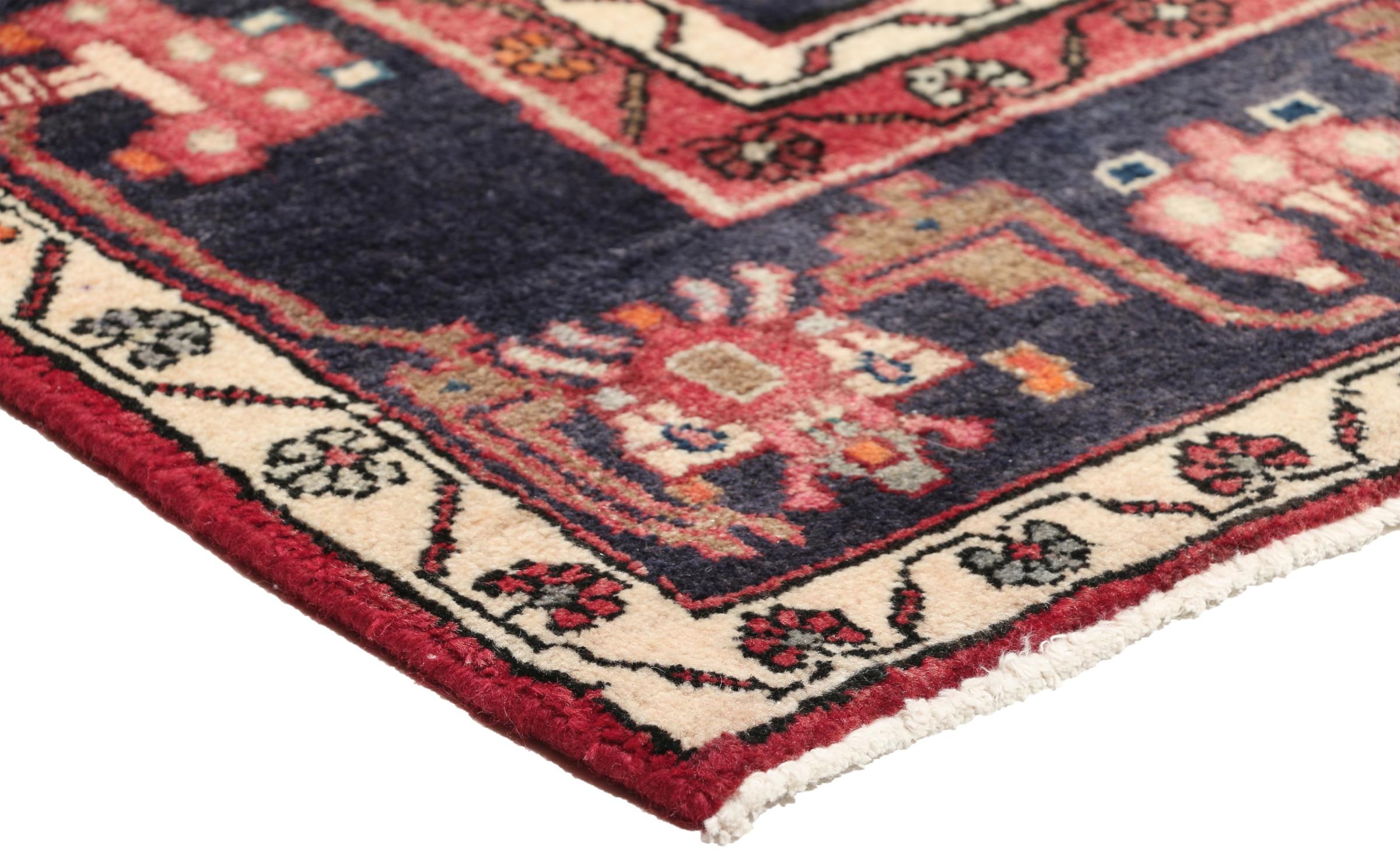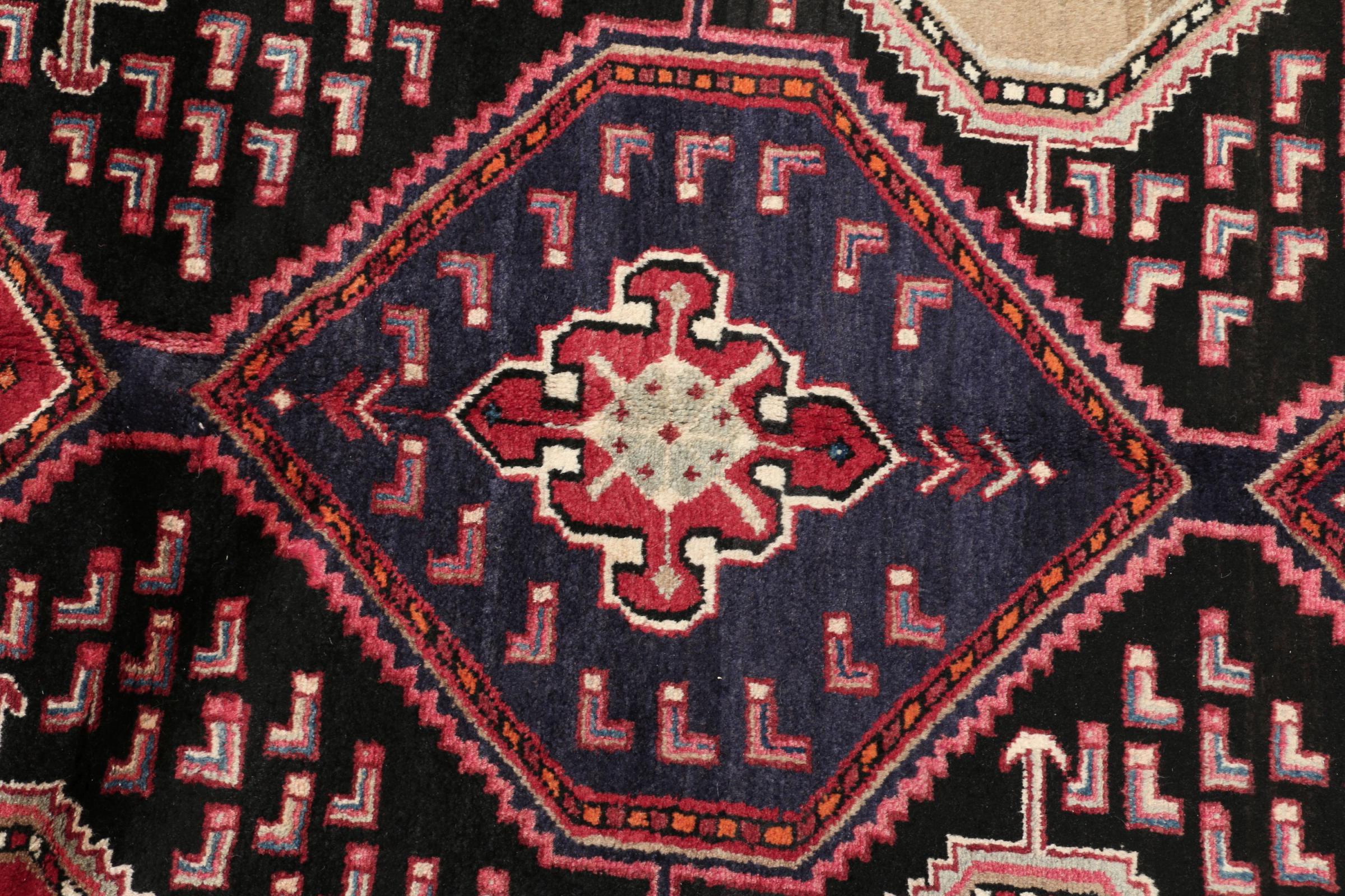 This Persian rug from Hamadan possesses typical geometric patterns with beautiful shades of red, brown and blue. It has been knotted by hand in the small town Hamadan in Persia. This rug is extremely robust and durable.
