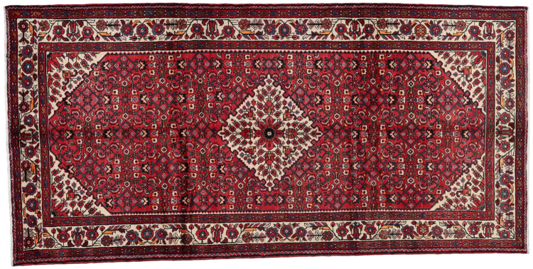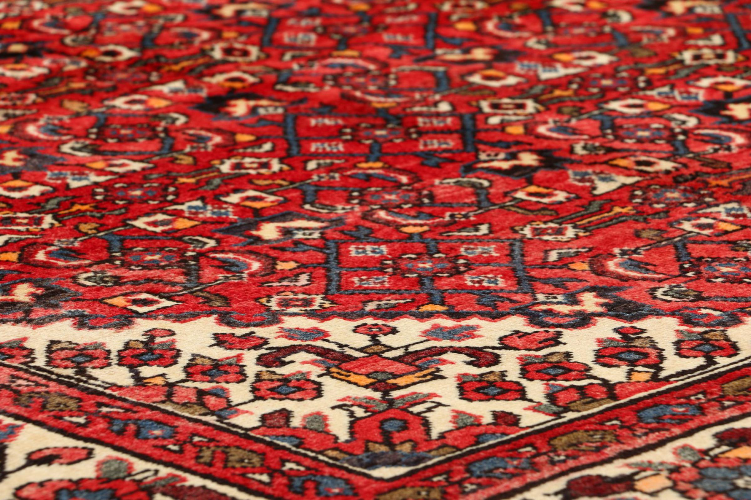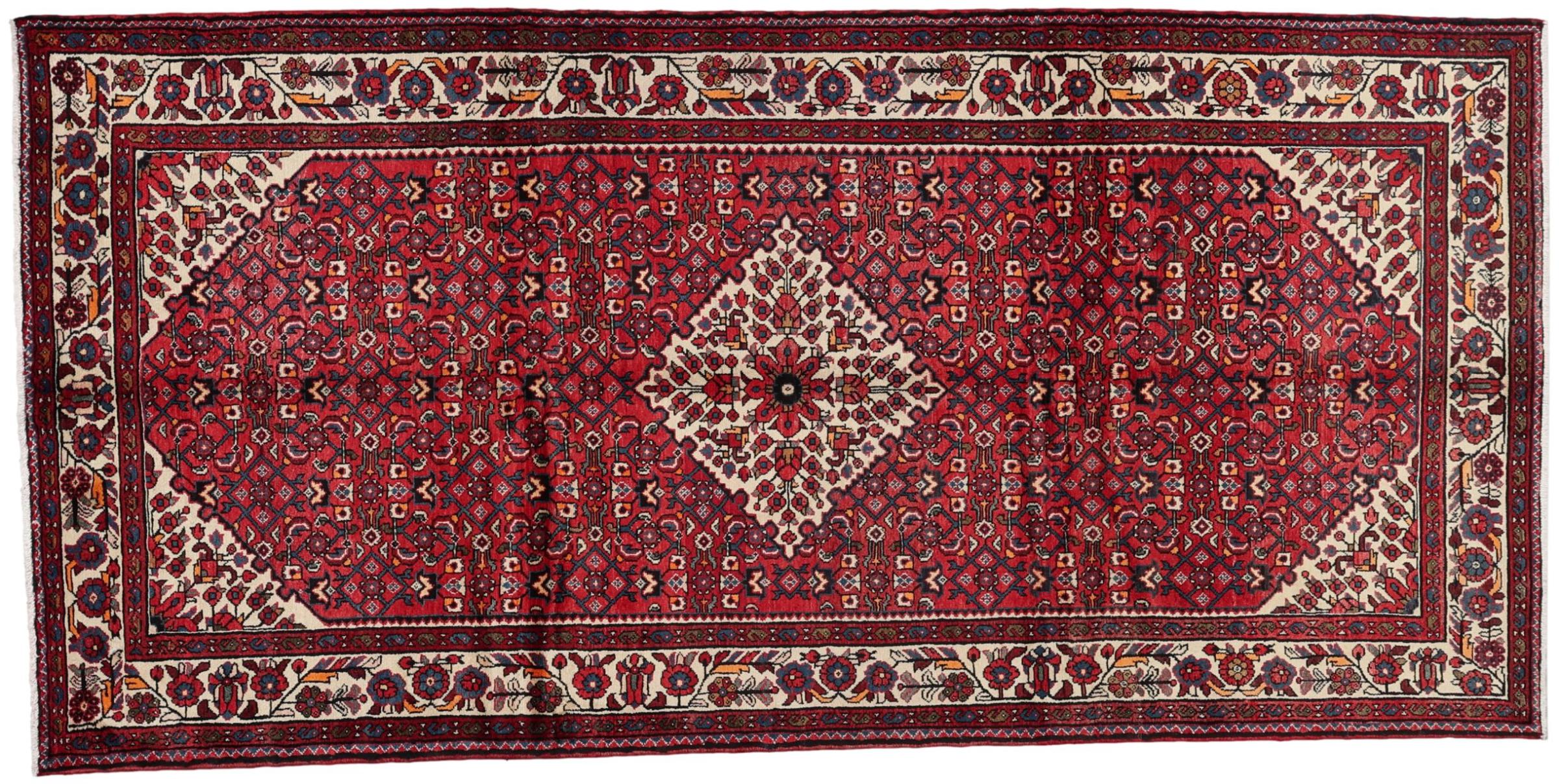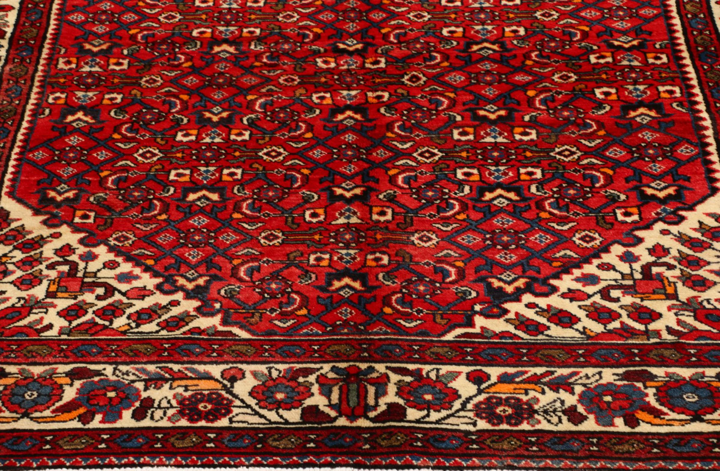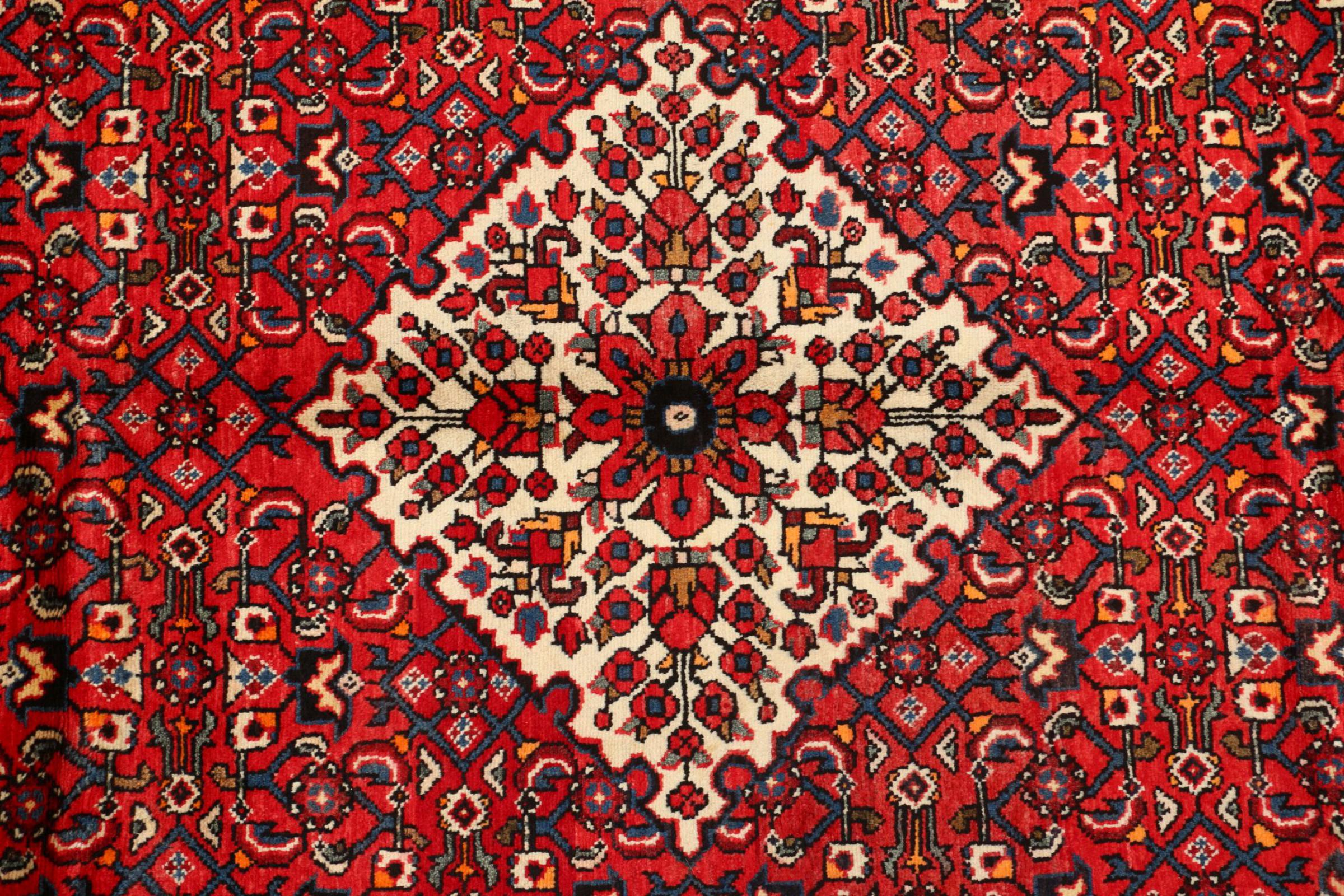 This Persian rug from Hamadan possesses typical geometric patterns with beautiful shades of red, brown and blue. It has been knotted by hand in the small town Hamadan in Persia. This rug is extremely robust and durable.