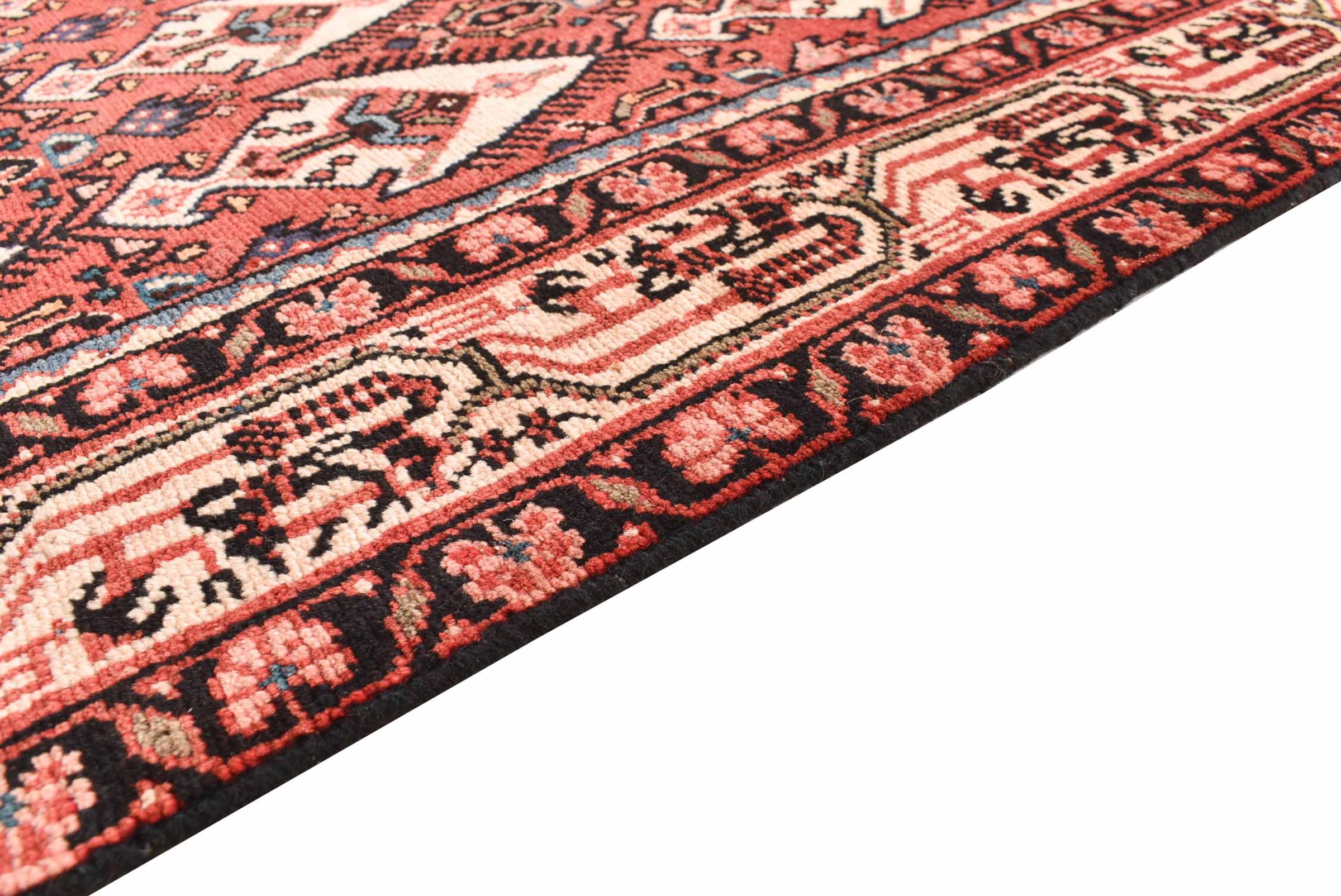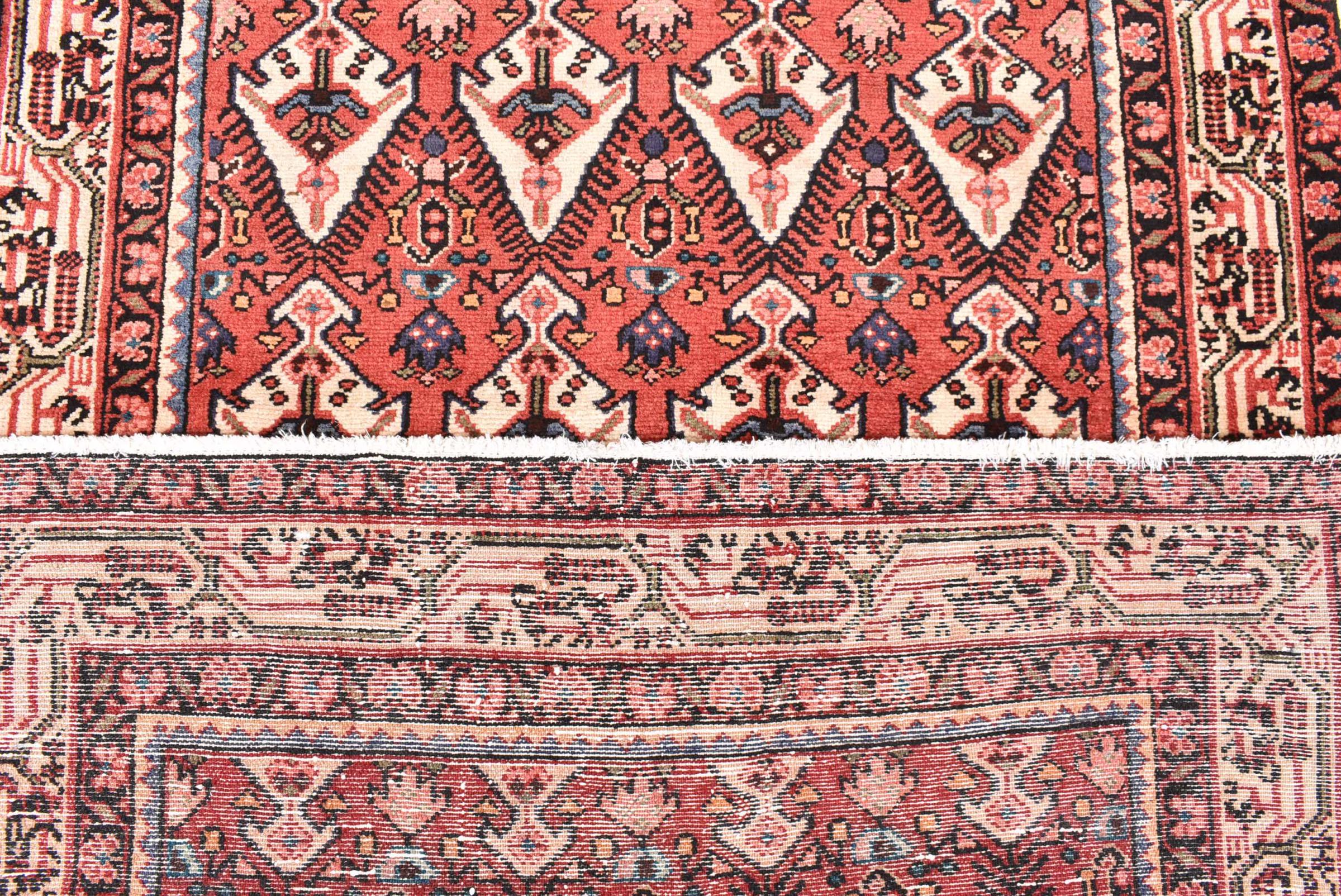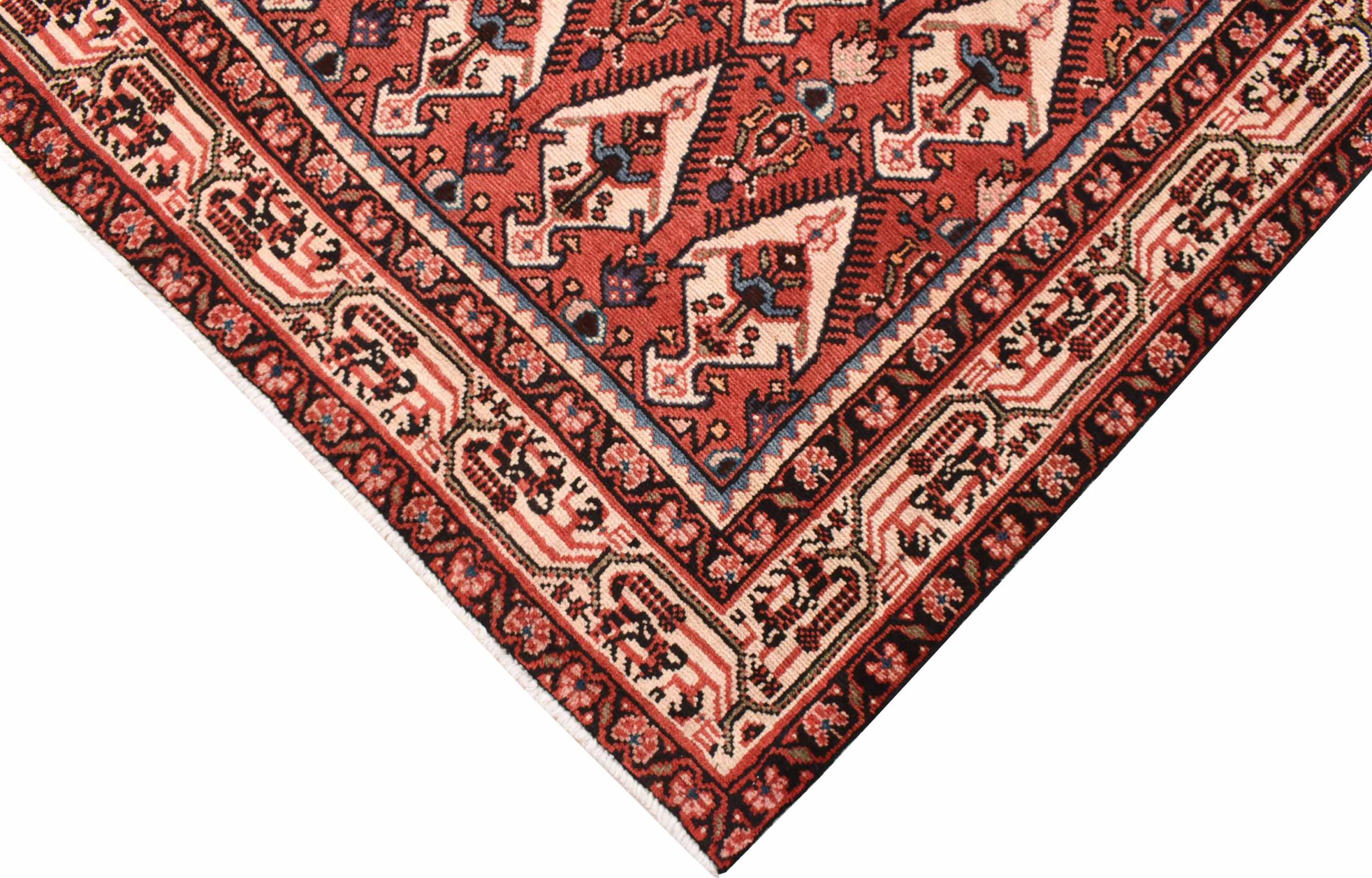This Persian rug from Hamadan possesses typical geometric patterns with beautiful shades of red, brown and blue. It has been knotted by hand in the small town Hamadan in Persia. This rug is extremely robust and durable.