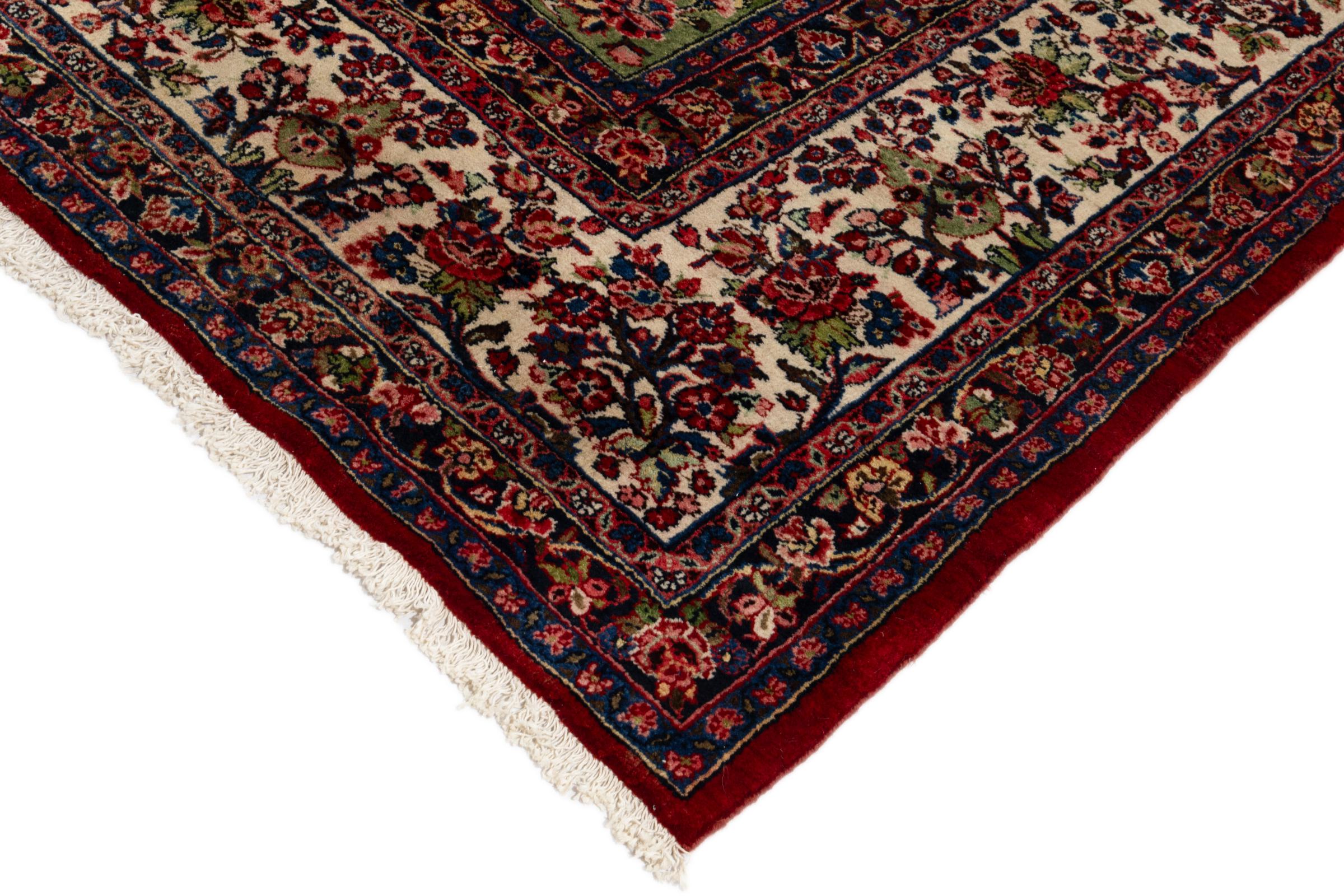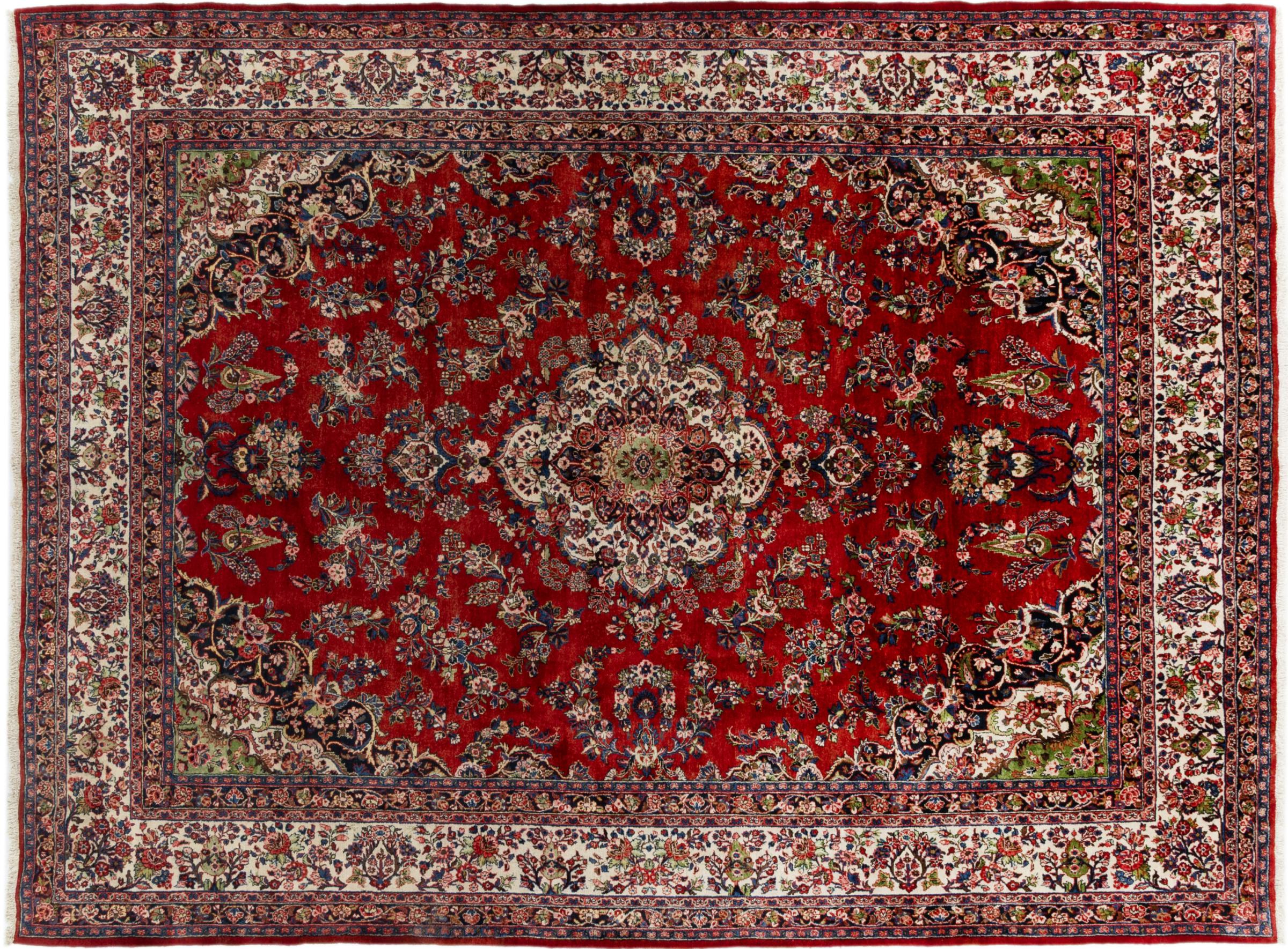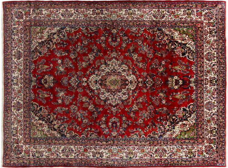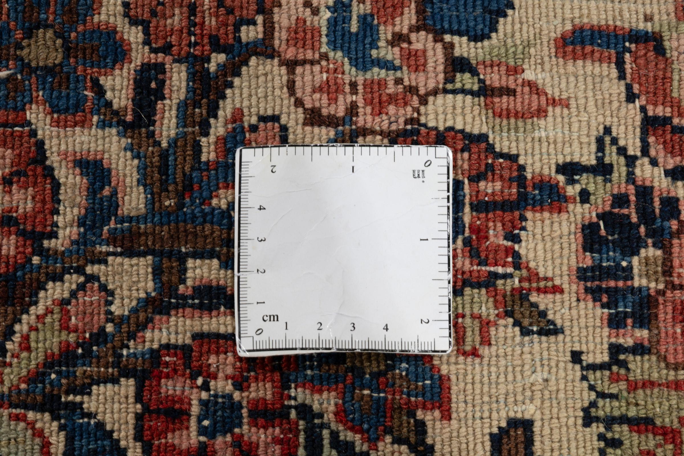 Rug ID: 297240009432054 Size: 13'10"x10'6" ft Thickness: ap. 0.47 in Knot density: 82 - 103 / square inch Manufacturing: Knotted by hand Pile: Sheep wool Warp: Cotton Origin: Persia / Iran Age: Old, 30-50 years Weight: ap. 119 lb Also know as Huseinabad In stock: Unique - Only 1 in stock