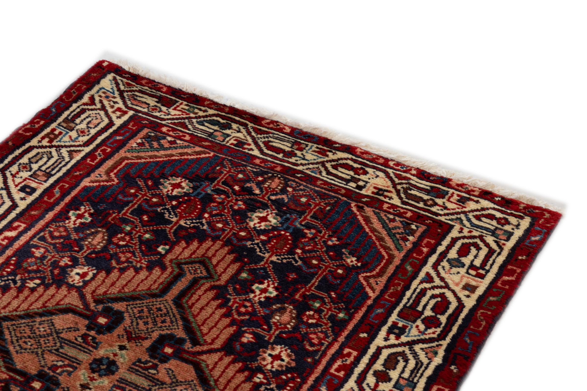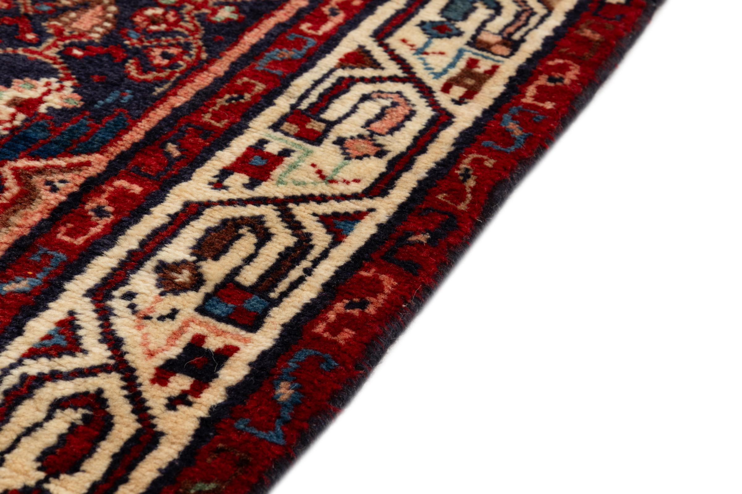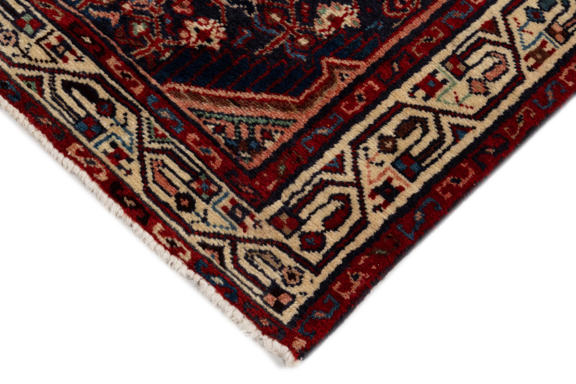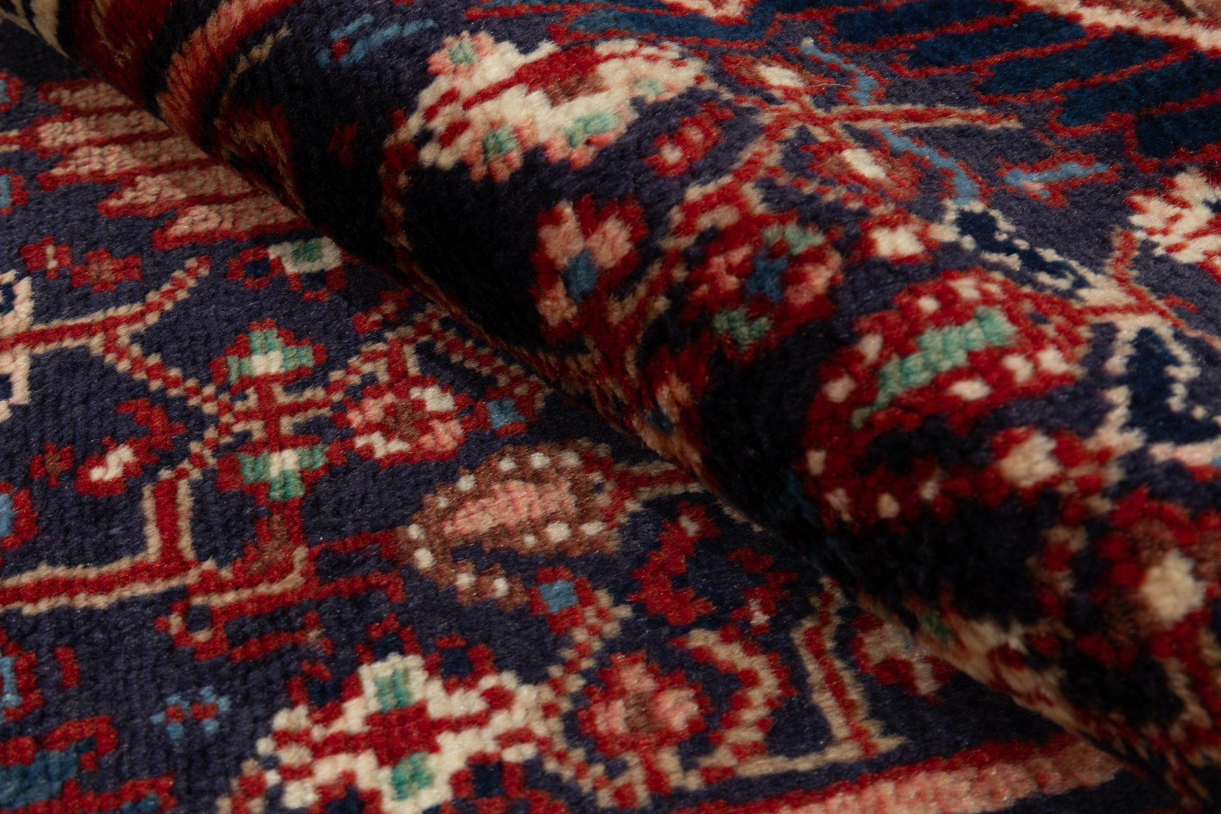 This Persian rug from Hamadan possesses typical geometric patterns with beautiful shades of red, brown and blue. It has been knotted by hand in the small town Hamadan in Persia. This rug is extremely robust and durable.