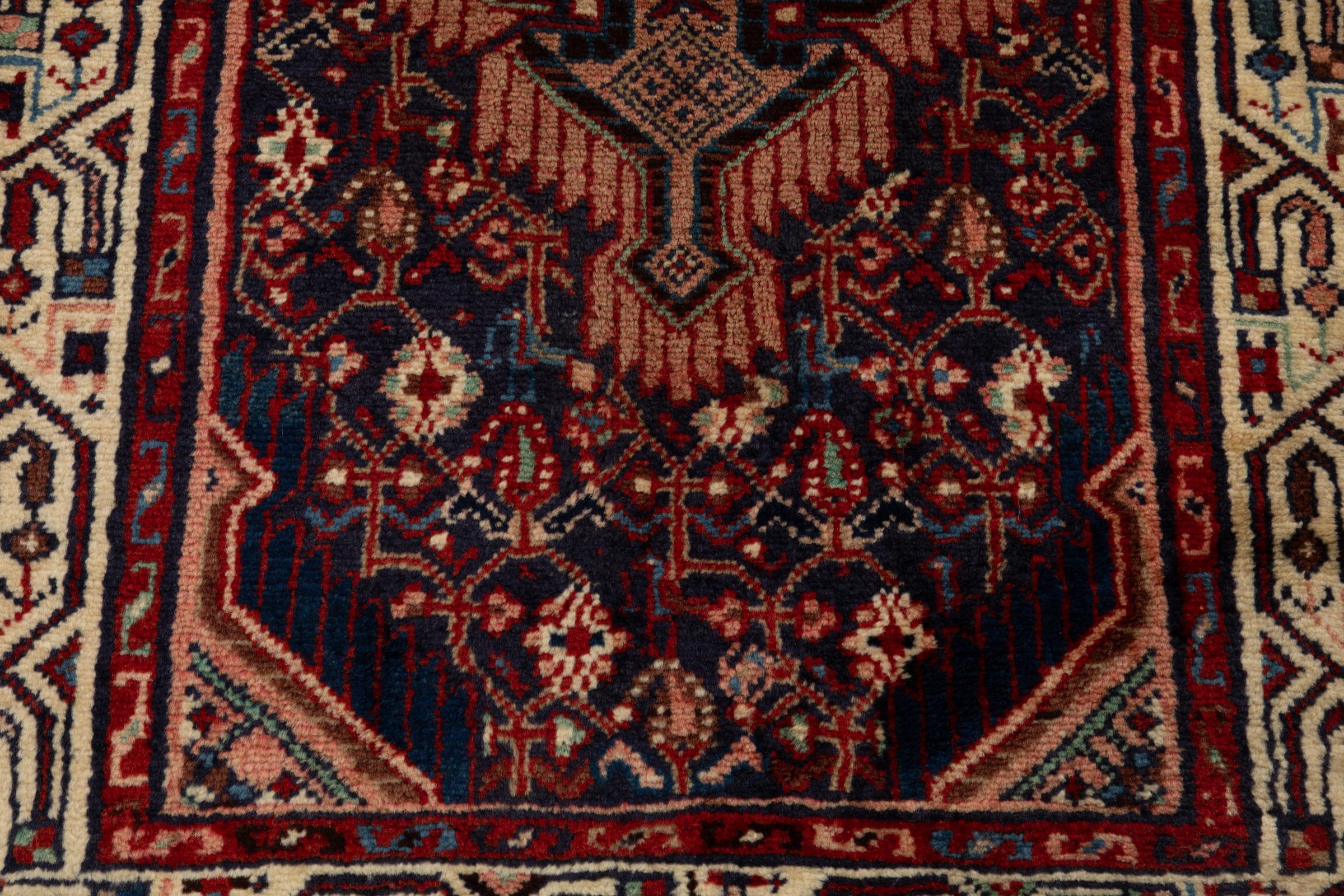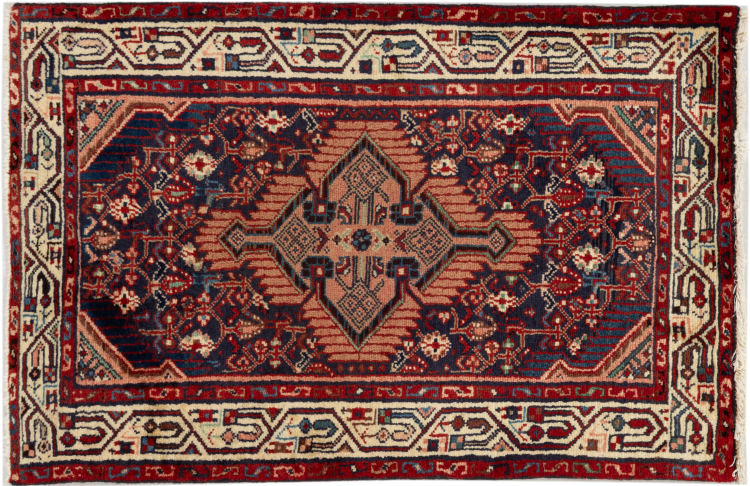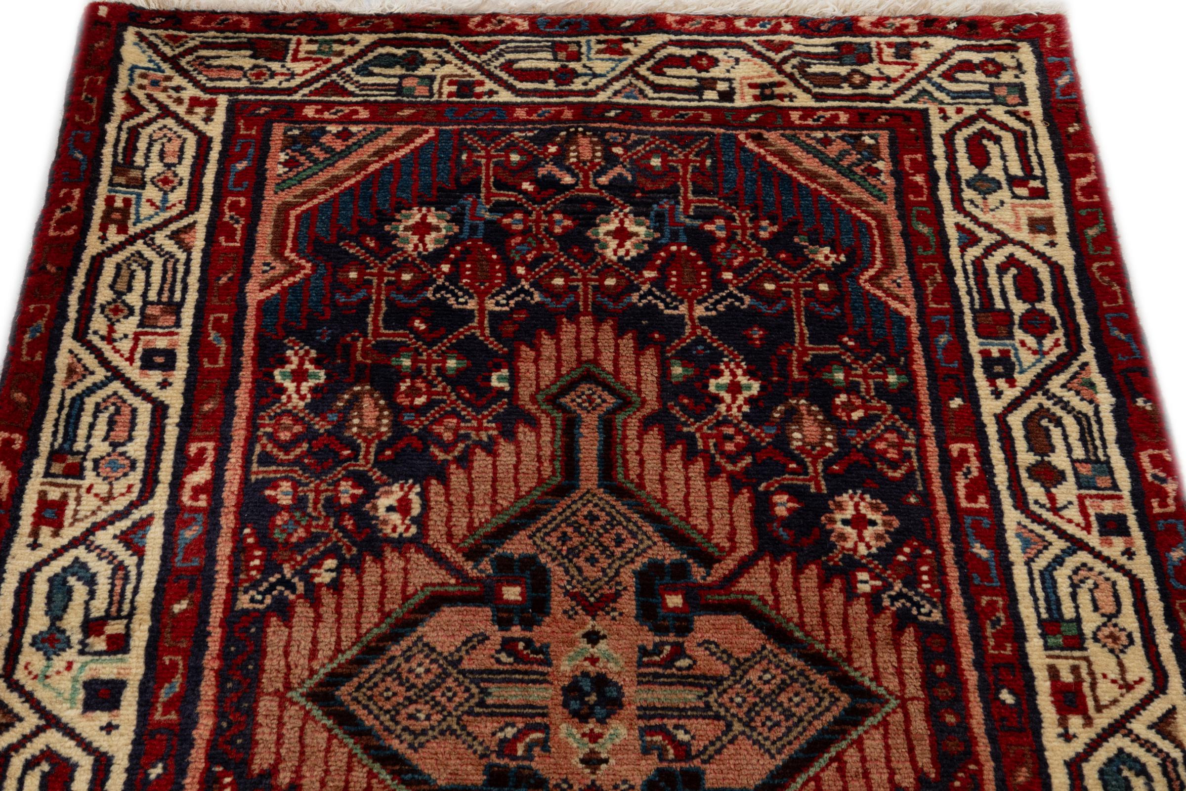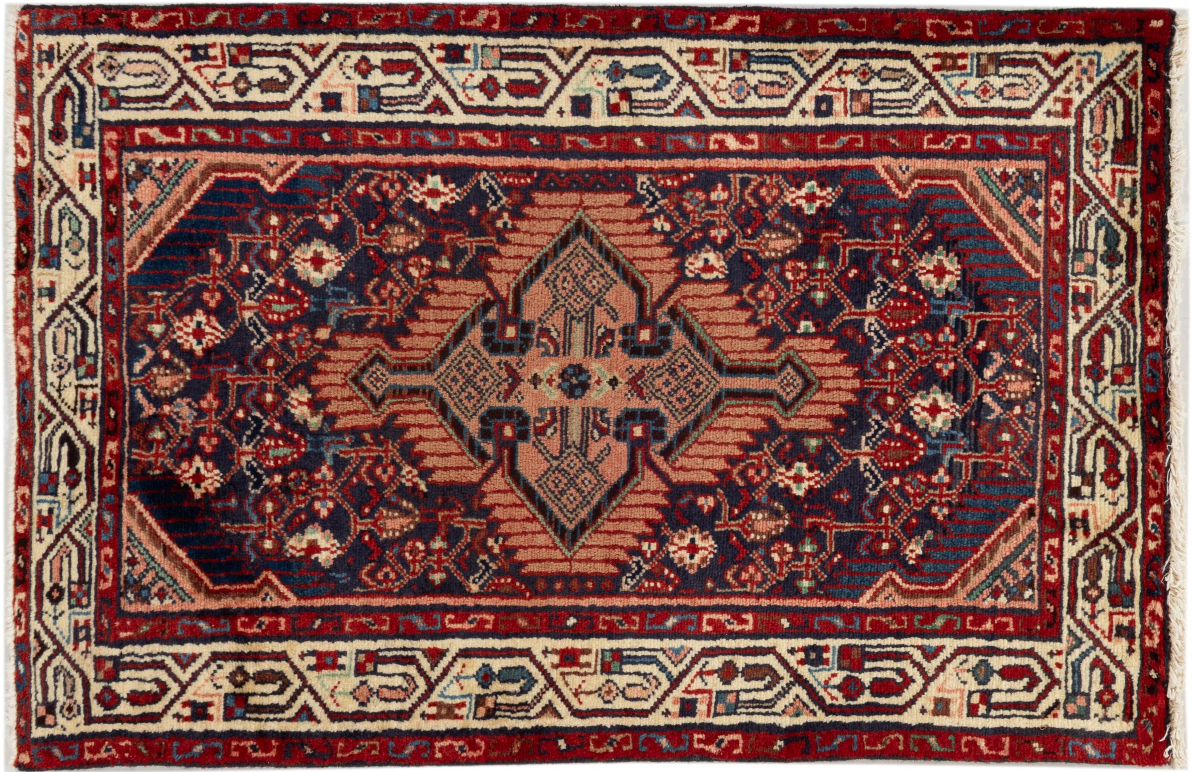 This Persian rug from Hamadan possesses typical geometric patterns with beautiful shades of red, brown and blue. It has been knotted by hand in the small town Hamadan in Persia. This rug is extremely robust and durable.