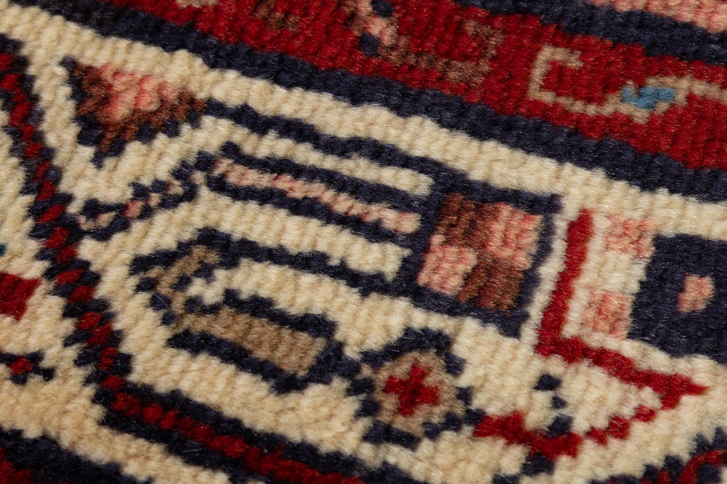 This carpet belongs to the village and nomadic carpets from Iran, the former Persia. This kind of carpets is hand knotted in smaller towns and villages in ancient tradition. Even nomads still knot Persian carpets in the open air. The carpets are knotted without a draft and entirely from memory. They are characterized by classical ornaments arranged in linear and geometric patterns. Thanks to their cultural and traditional origins, these rugs possess a unique character that embodies ancient Persia.