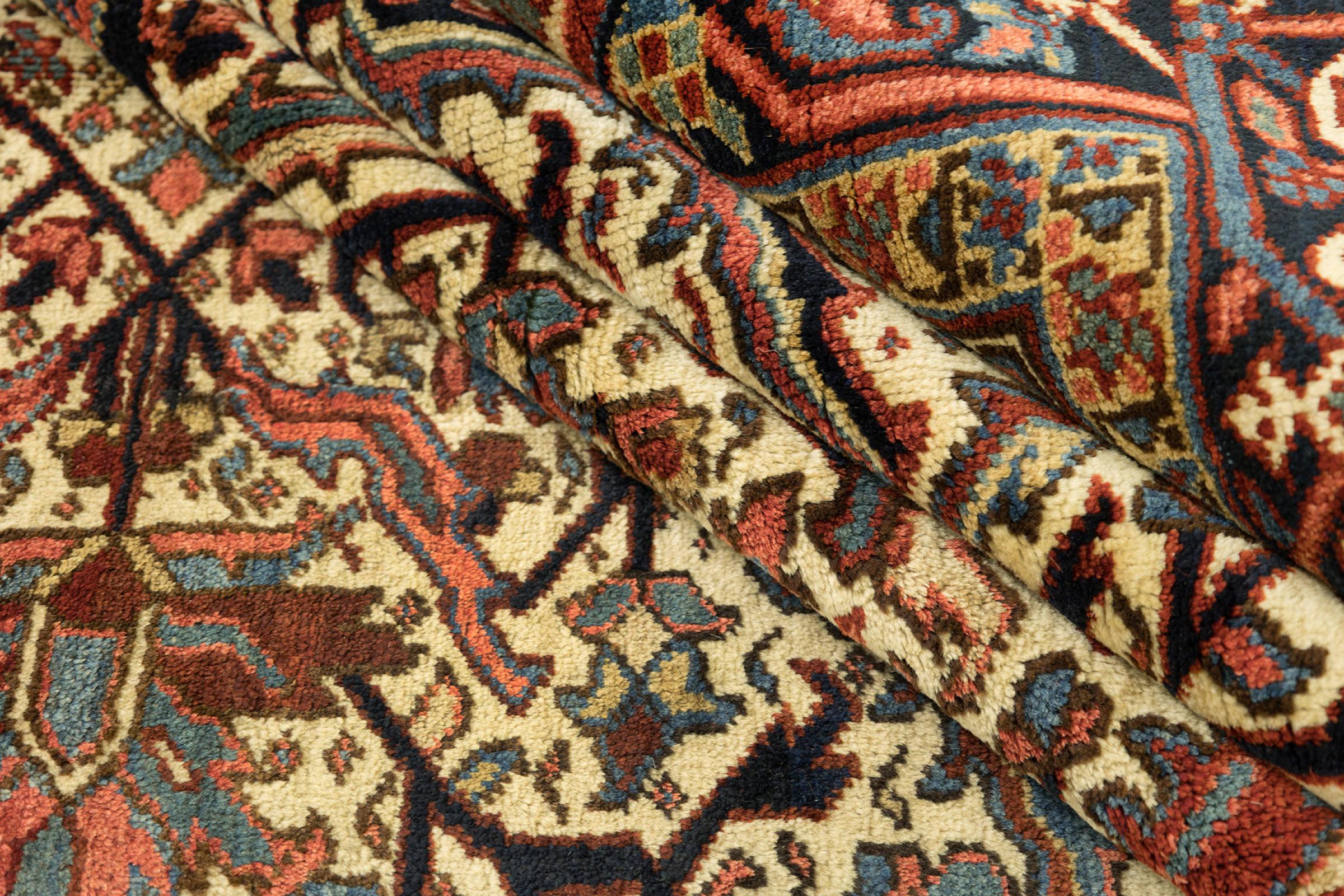 This rug from Heriz (Heris) has been made in old traditional Persian handicraft. Heriz is located in northwestern Iran. This rug has been knotted by hand from fine sheep wool. It has a beautiful medallion in its center, which is typical for this type of rug.