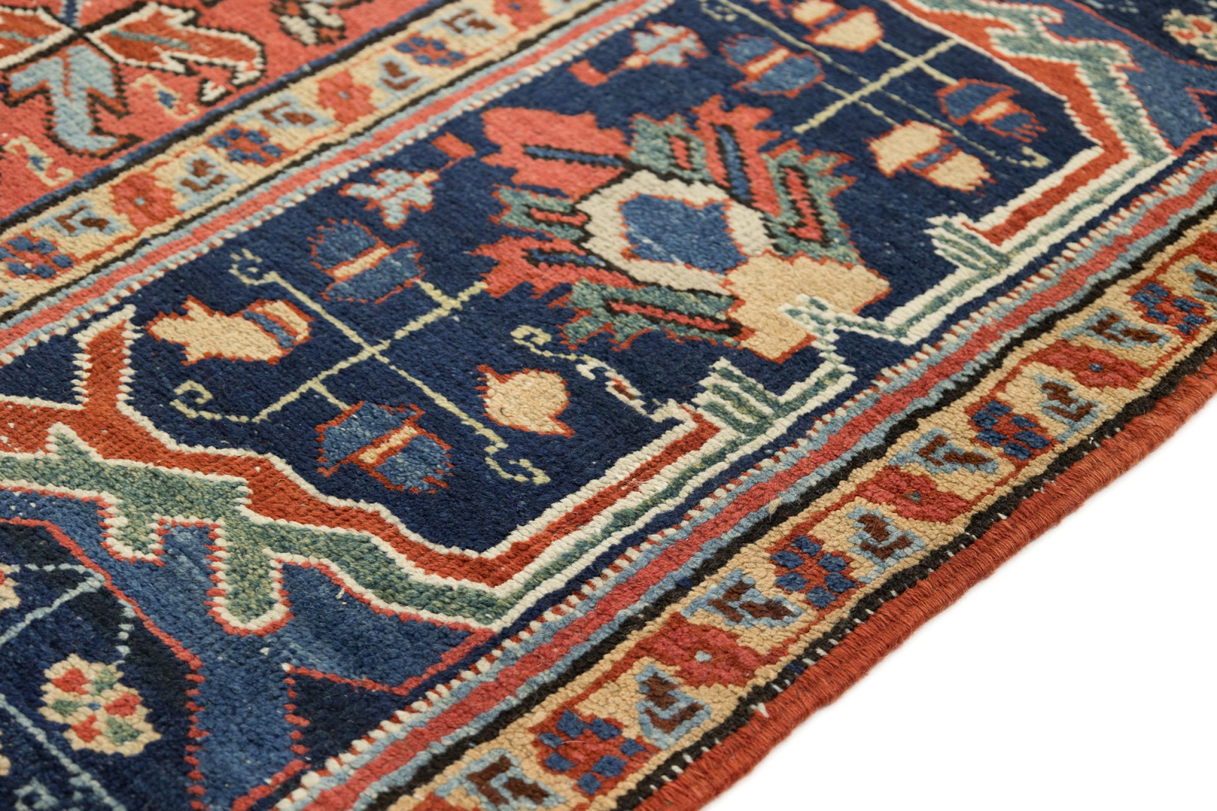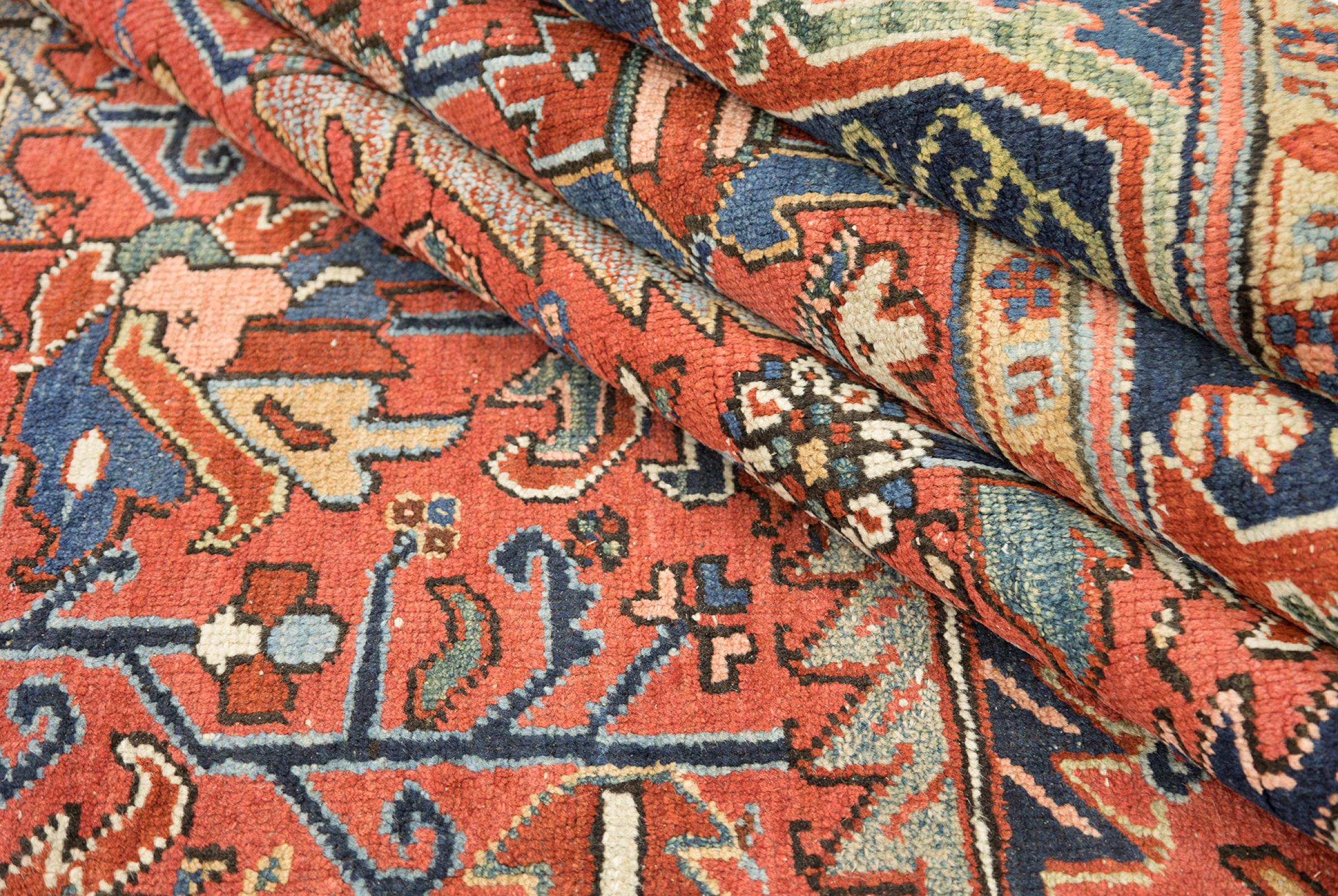 This rug from Heriz (Heris) has been made in old traditional Persian handicraft. Heriz is located in northwestern Iran. This rug has been knotted by hand from fine sheep wool. It has a beautiful medallion in its center, which is typical for this type of rug.
