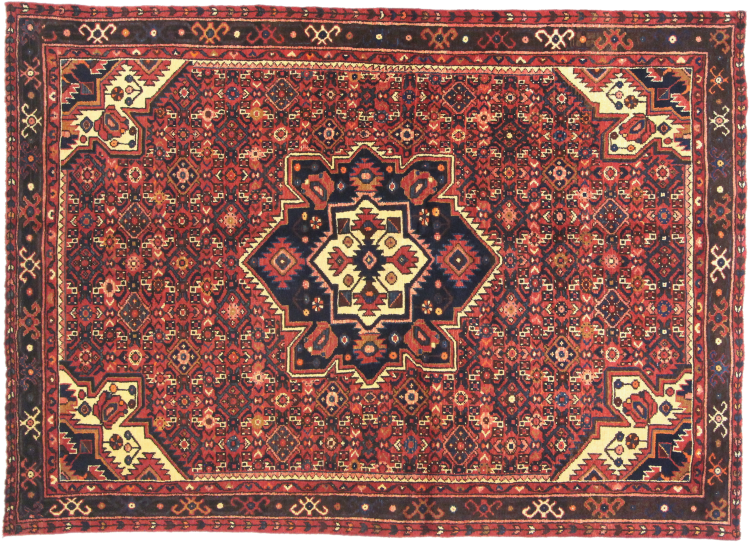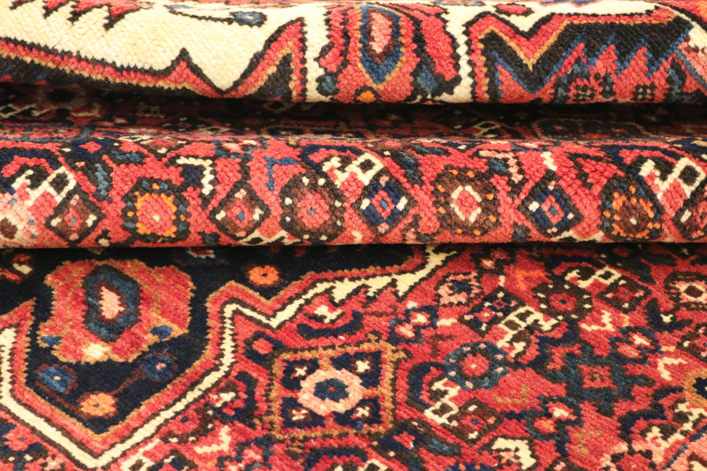 This carpet belongs to the village and nomadic carpets from Iran, the former Persia. This kind of carpets is hand knotted in smaller towns and villages in ancient tradition. Even nomads still knot Persian carpets in the open air. The carpets are knotted without a draft and entirely from memory. They are characterized by classical ornaments arranged in linear and geometric patterns. Thanks to their cultural and traditional origins, these rugs possess a unique character that embodies ancient Persia.