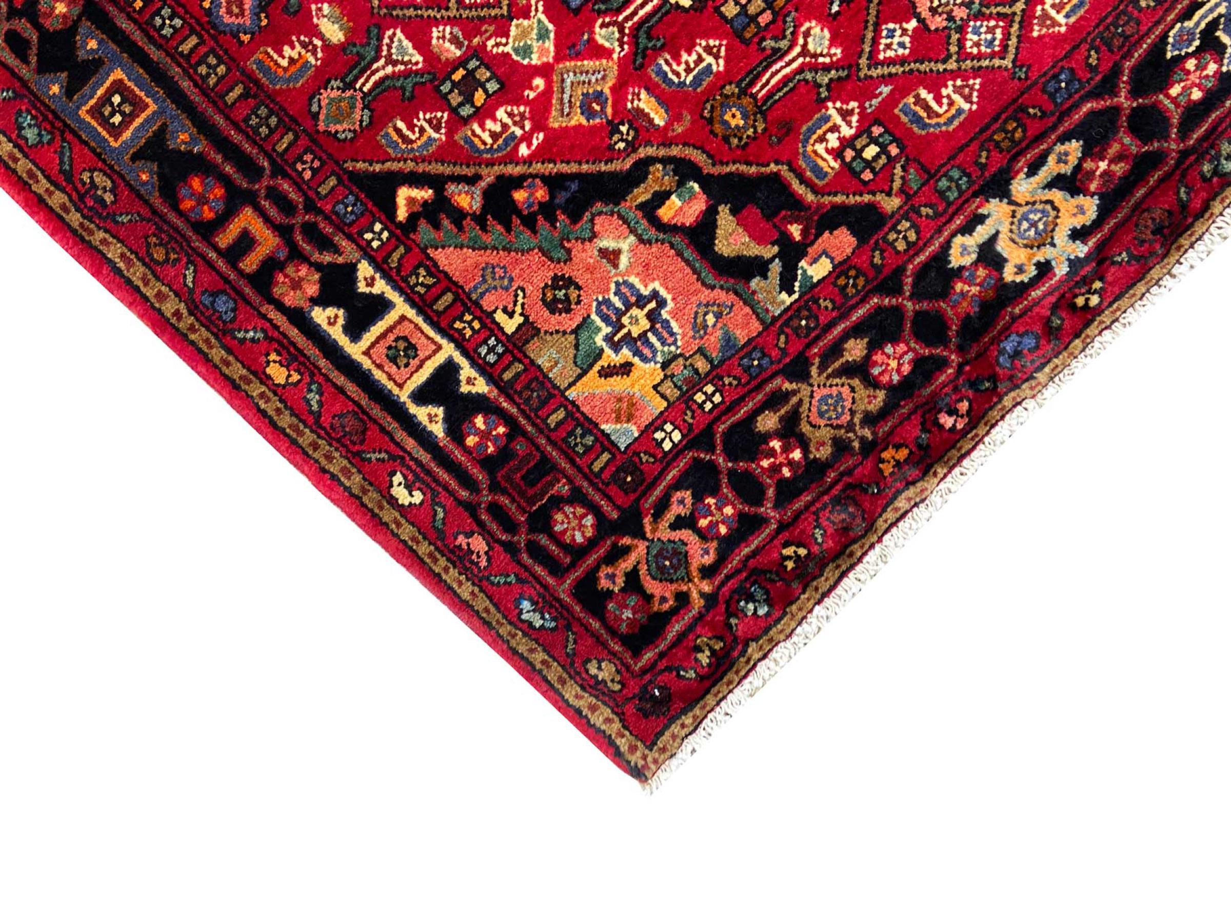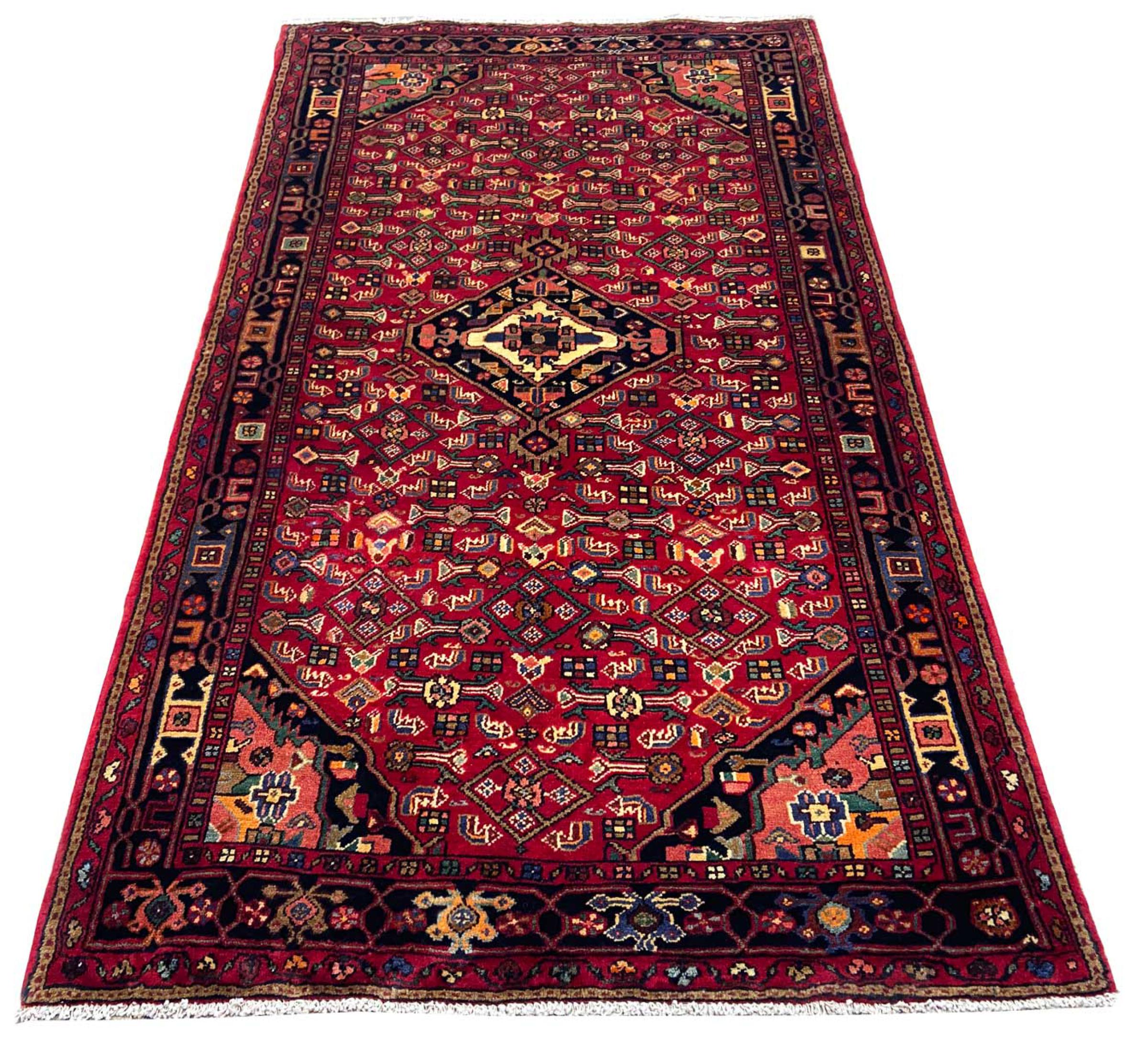 This carpet belongs to the village and nomadic carpets from Iran, the former Persia. This kind of carpets is hand knotted in smaller towns and villages in ancient tradition. Even nomads still knot Persian carpets in the open air. The carpets are knotted without a draft and entirely from memory. They are characterized by classical ornaments arranged in linear and geometric patterns. Thanks to their cultural and traditional origins, these rugs possess a unique character that embodies ancient Persia.