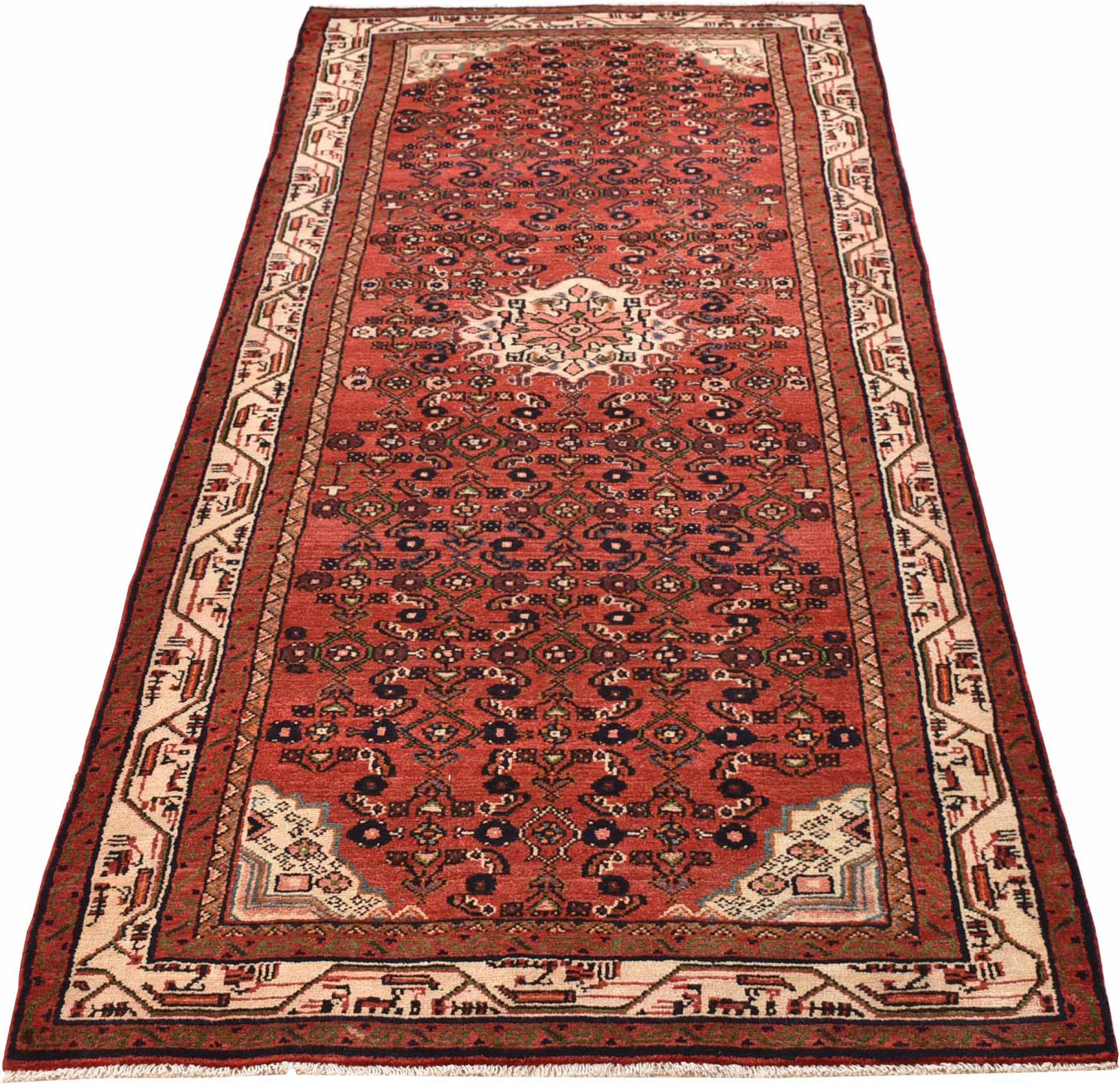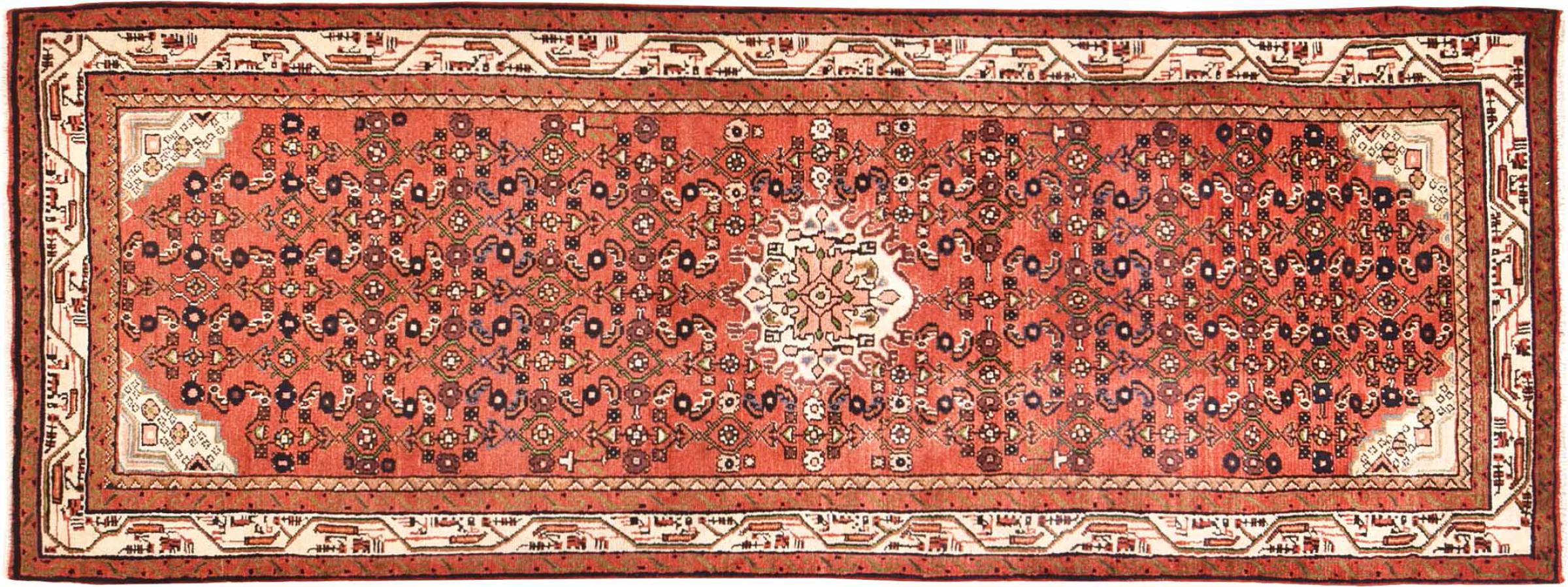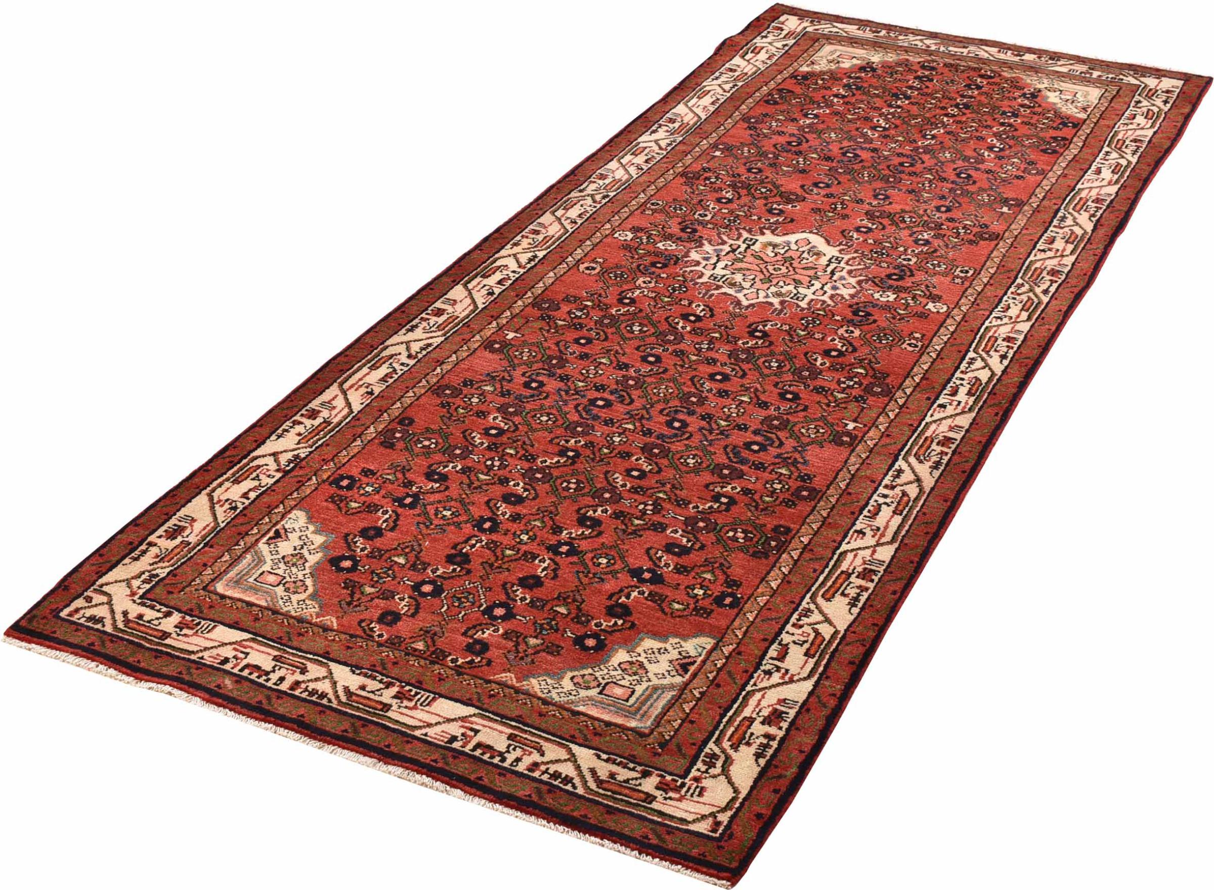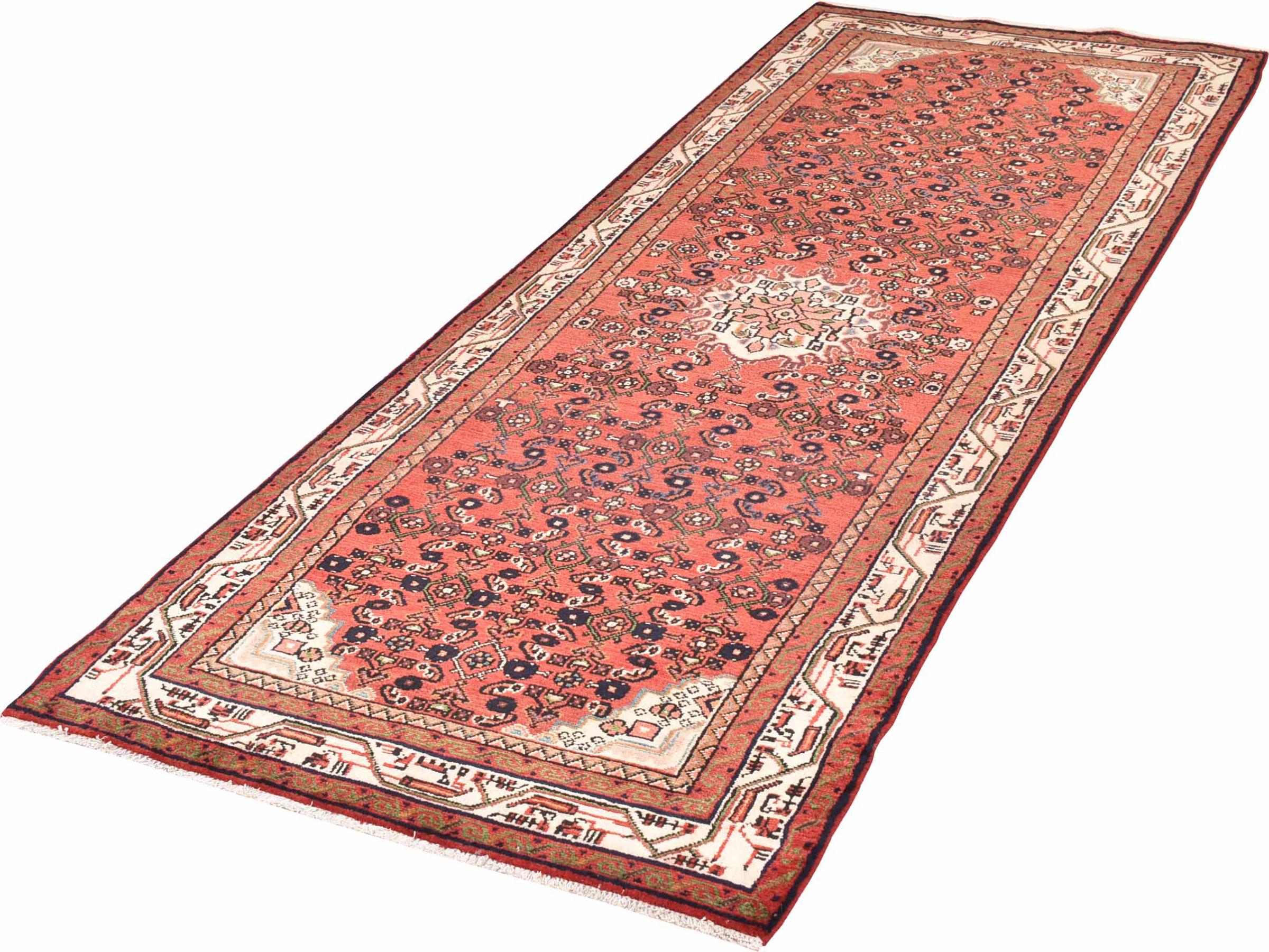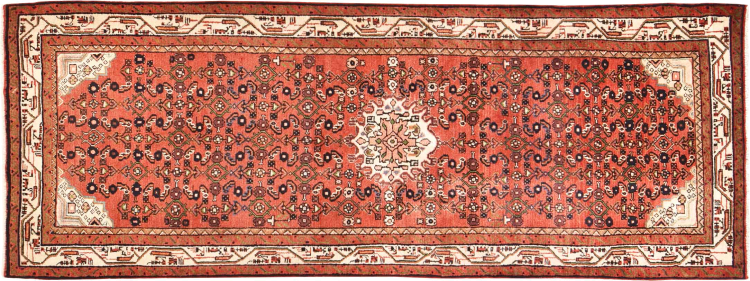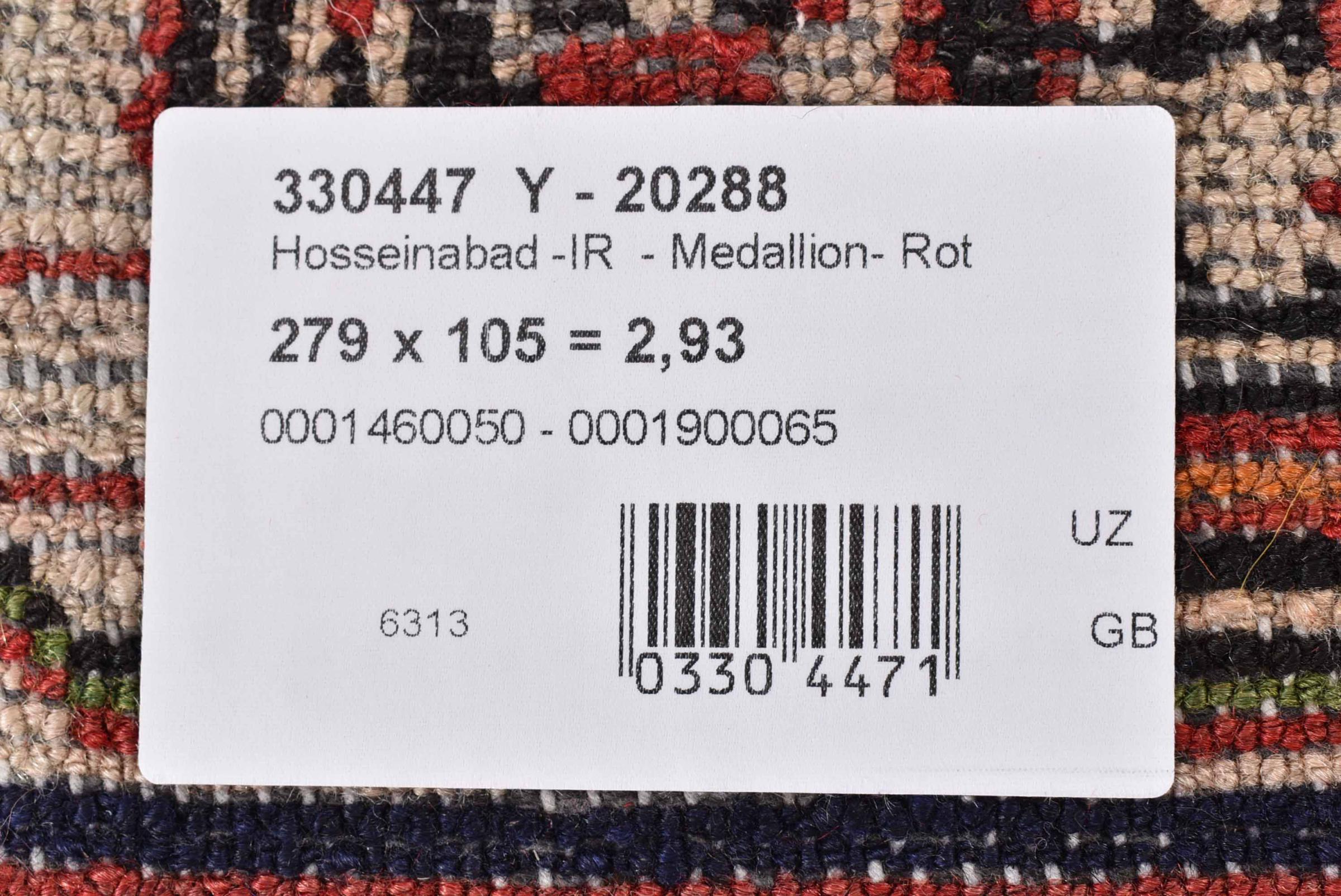 Rug ID: 30088000458531 Size: 9'1"x3'5" ft Thickness: ap. 0.47 in Knot density: 82 - 103 / square inch Manufacturing: Knotted by hand Pile: Handspun wool Warp: Cotton Origin: Persia / Iran Age: New Weight: ap. 22 lb Also know as Huseinabad In stock: Unique - Only 1 in stock