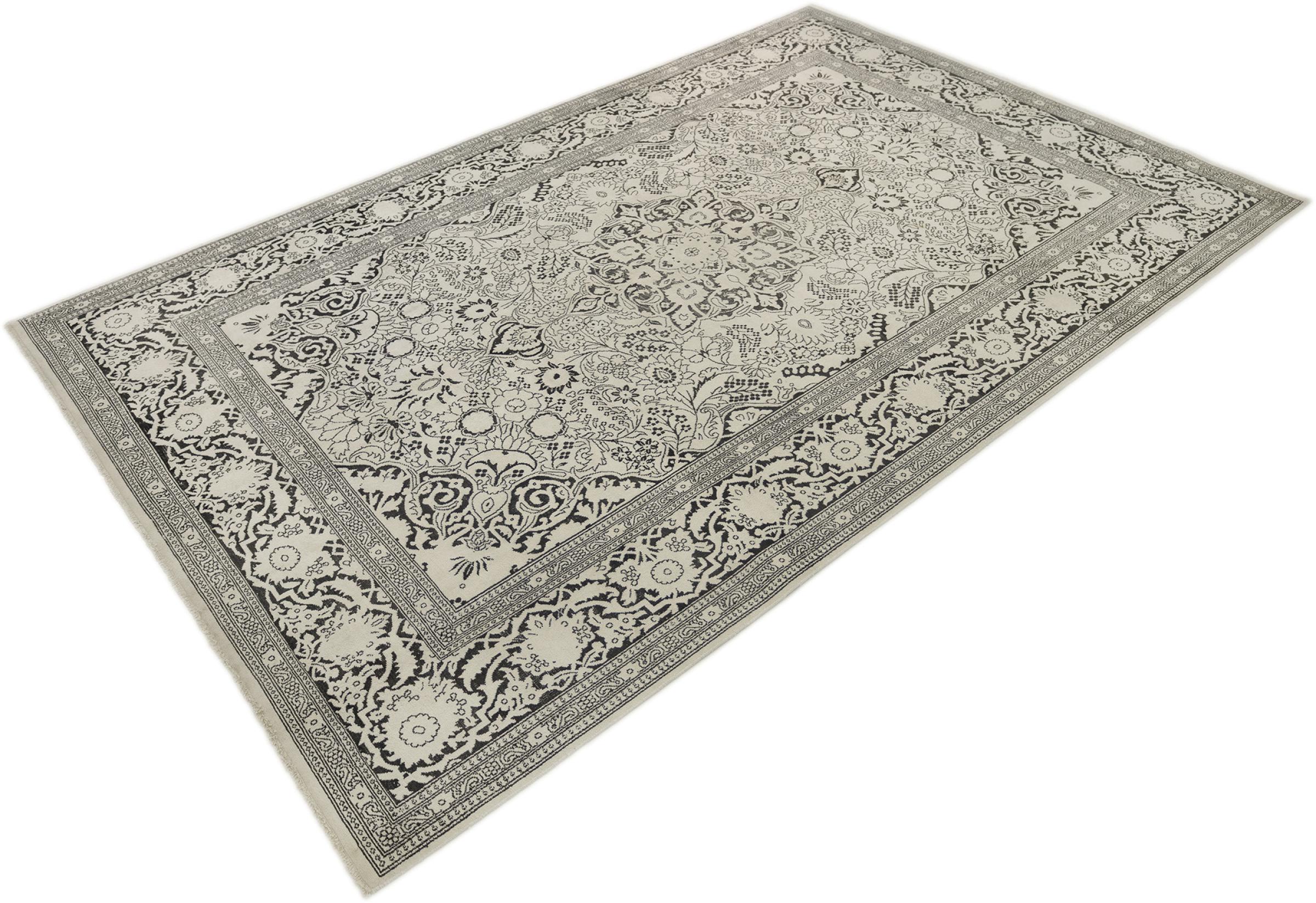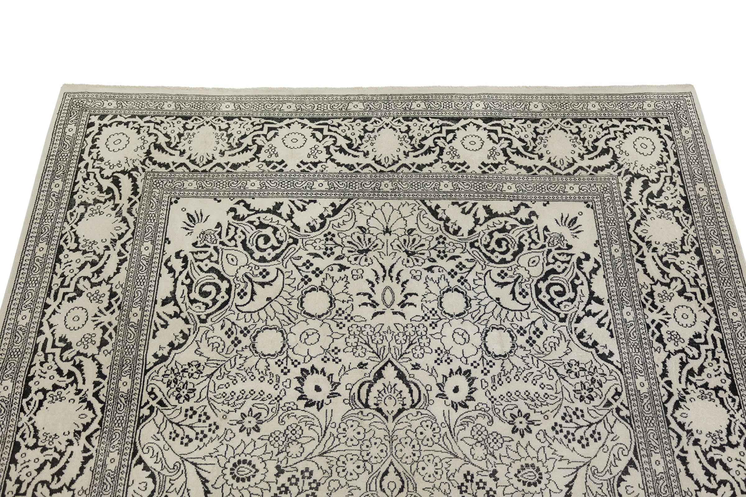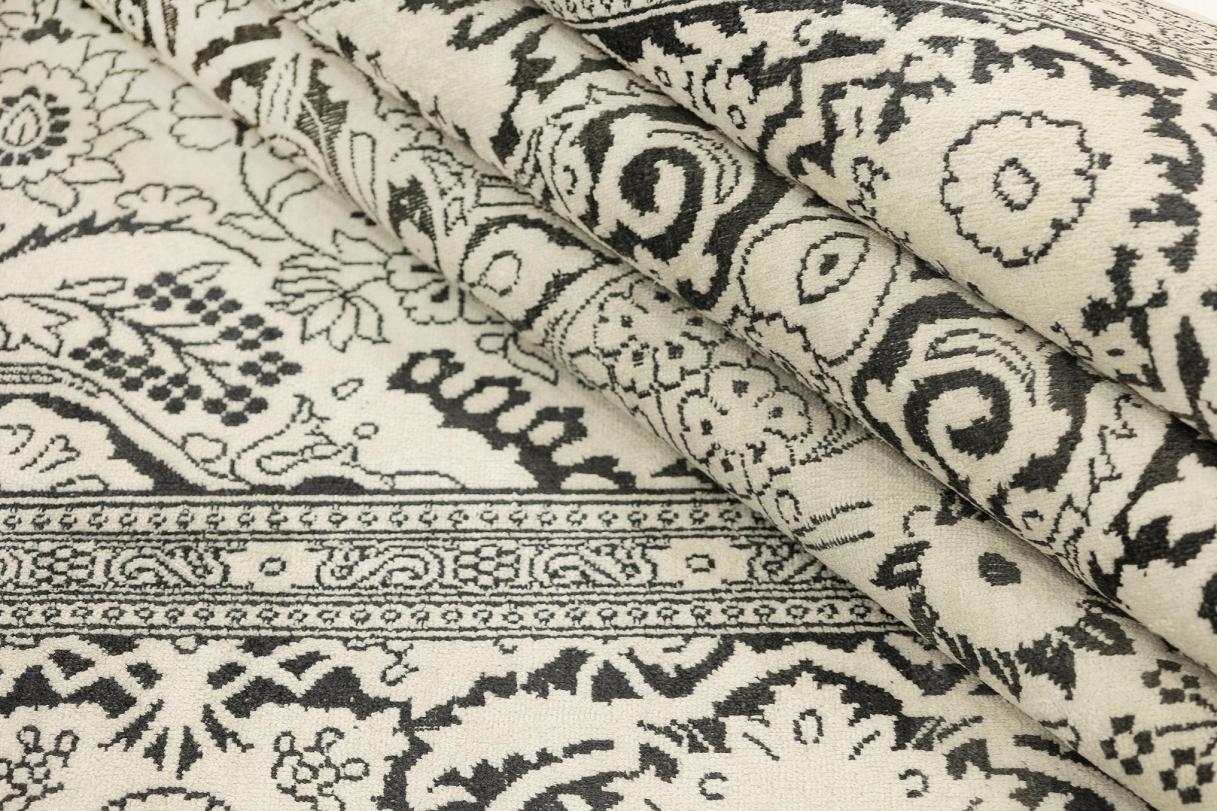 Rug ID: 316682005873159 Size: 9'4"x6'0" ft Thickness: ap. 0.31 in Knot density: 185 - 206 / square inch Manufacturing: Knotted by hand Pile: Silk Warp: Cotton Condition / Conservation: Vintage – short-pile, artistically refined and modernly interpreted Origin: India Age: Old, 30-50 years Weight: ap. 40 lb In stock: Unique - Only 1 in stock