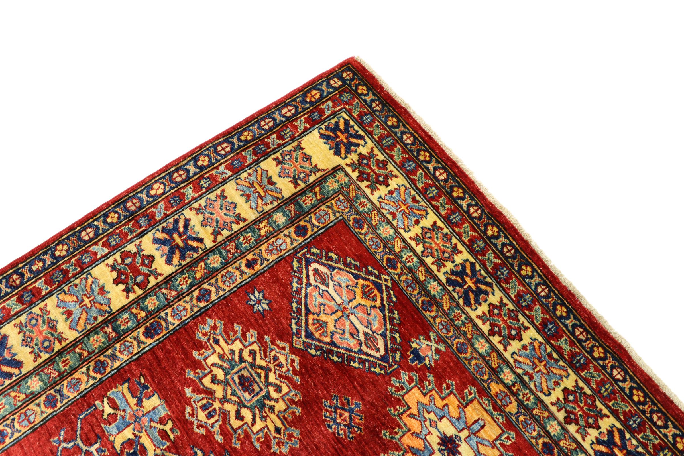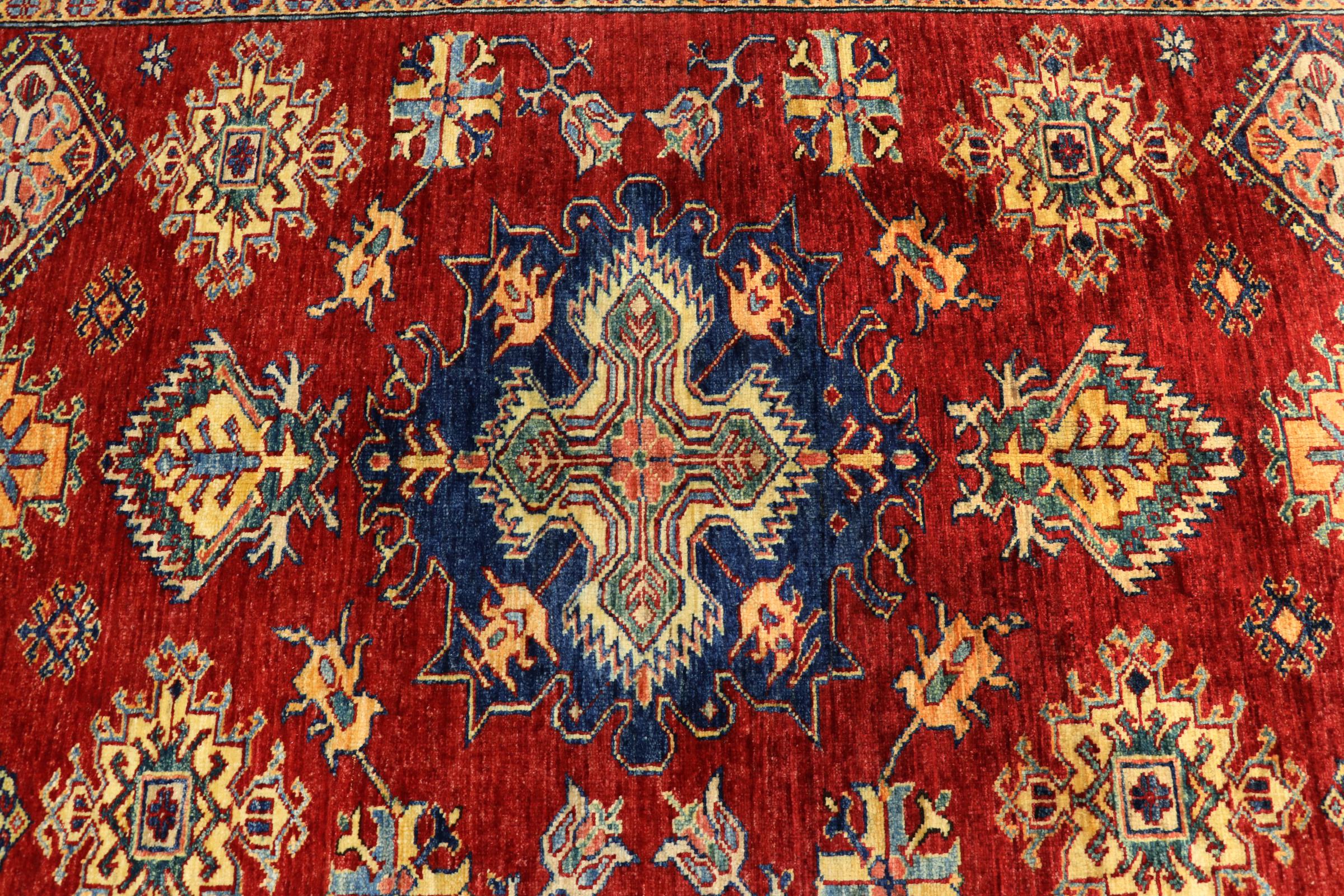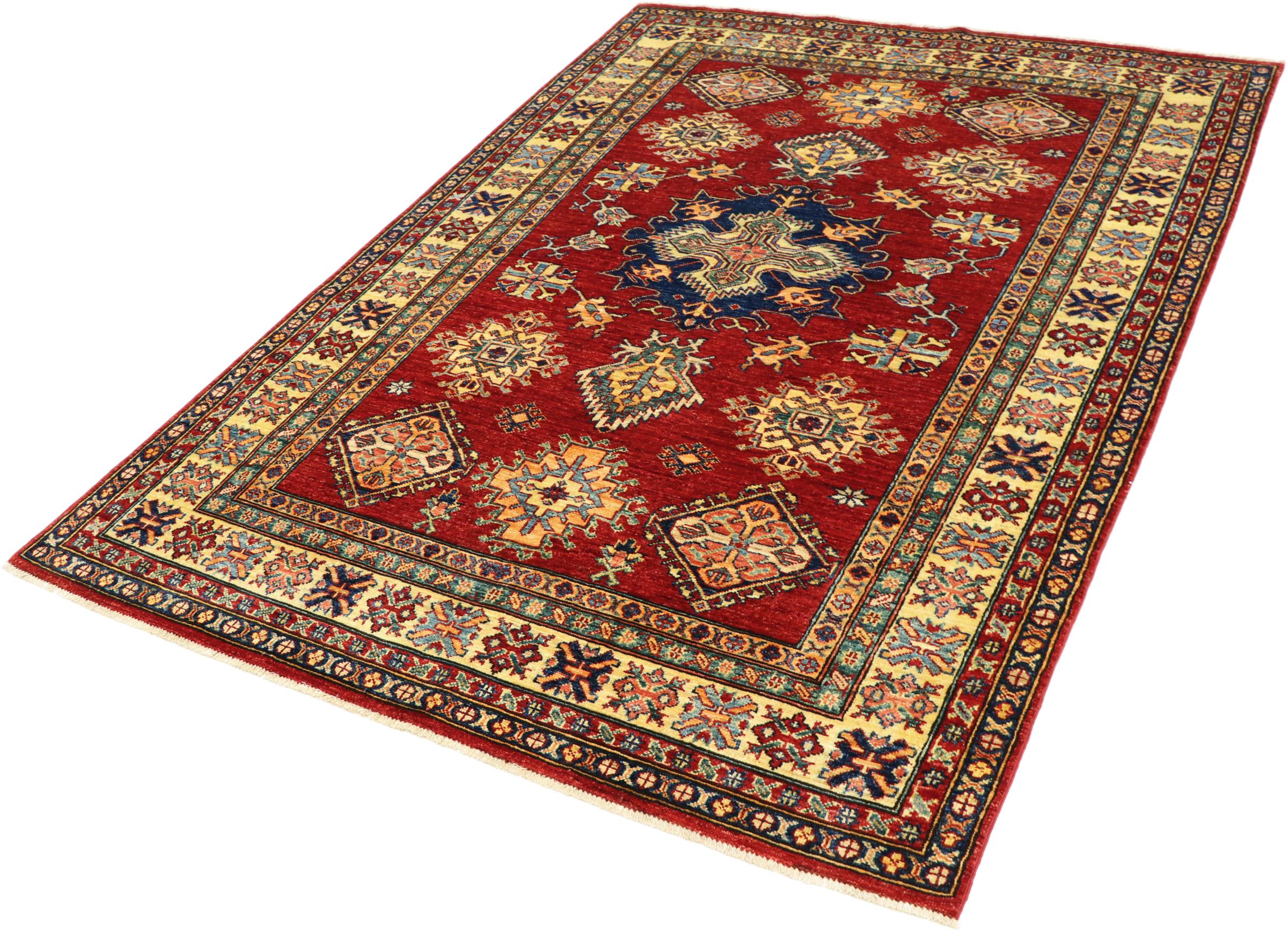 This Kazak rug is traditionally handcrafted and represents the distinctive character, authentic appearance and enduring appeal. of this well-known rug type. The region of origin is famous for its handmade rugs with beautiful geometric patterns and well balanced natural colors. As all Kazak rugs in our collection, this piece is one of a kind and a testament to genuine craftsmanship.